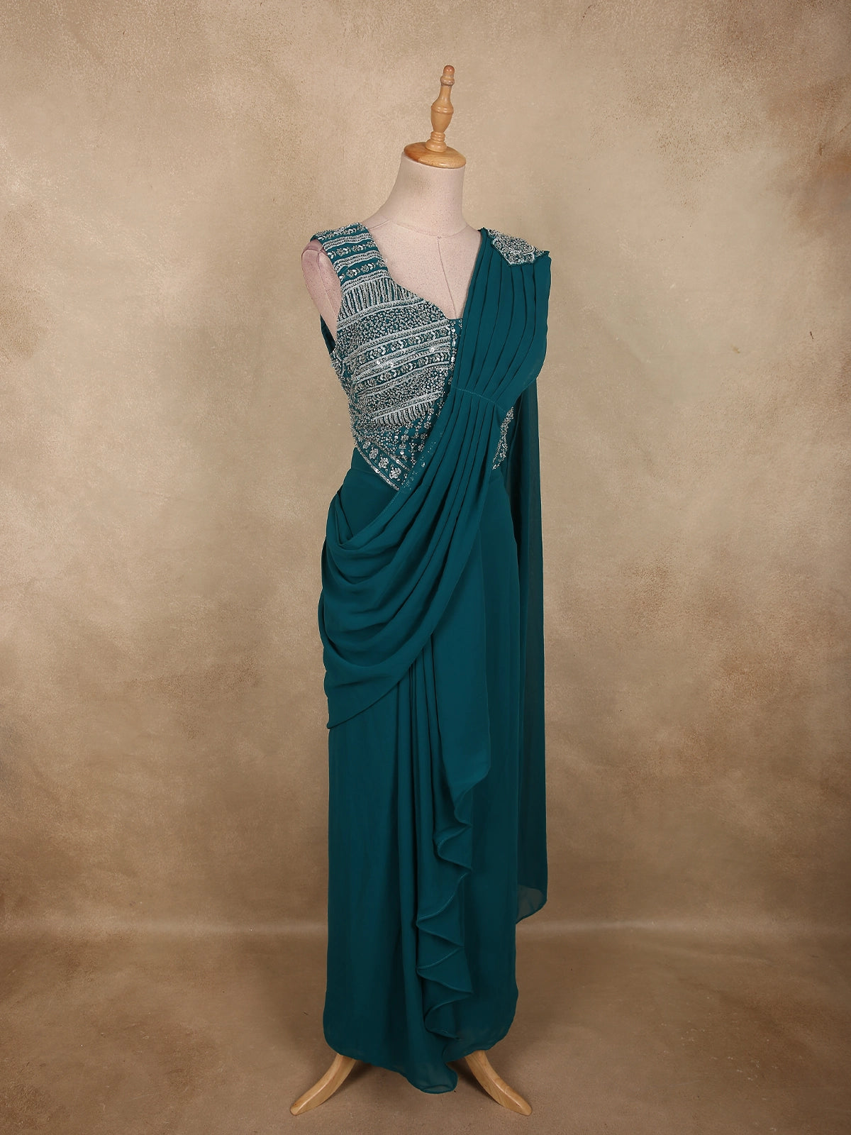 Turn heads effortlessly in this stunning Peacock Blue Ready-to-Wear Draped Saree, designed to reflect grace, confidence, and modern sophistication. The rich jewel-toned peacock blue shade brings a regal charm, making it a perfect choice for grand celebrations and evening occasions.