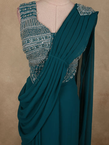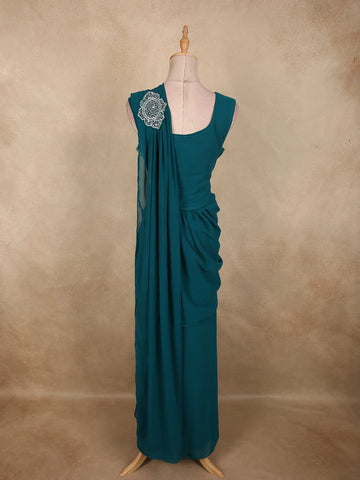 Peacock Blue Solid Design Georgette Ready to Wear Draped Saree with Designer Blouse