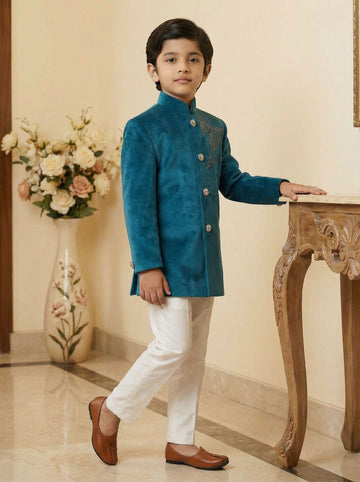 Peacock Blue Velvet Indo-Western Kids Sherwani With Horse Embellished Shoulder