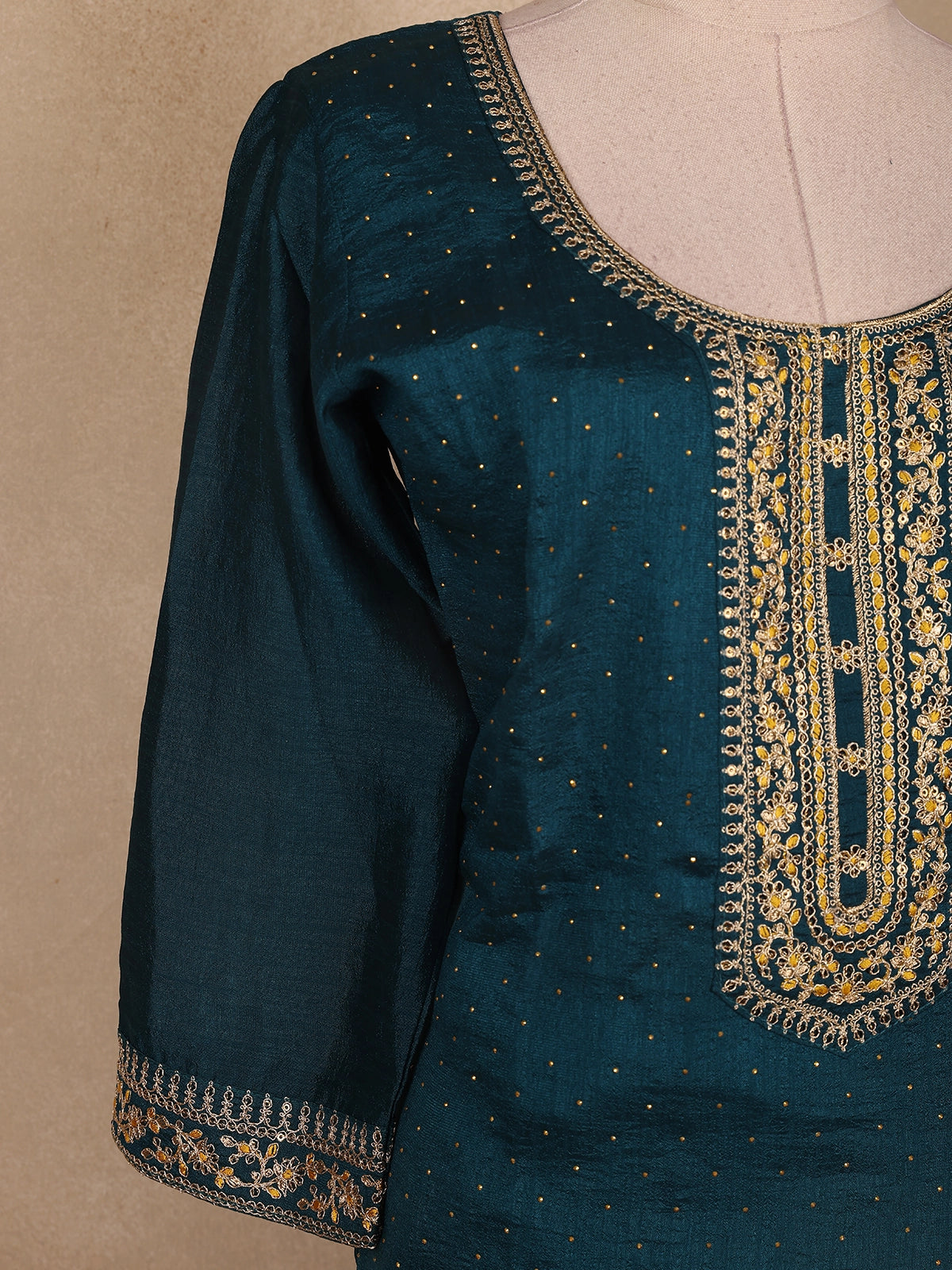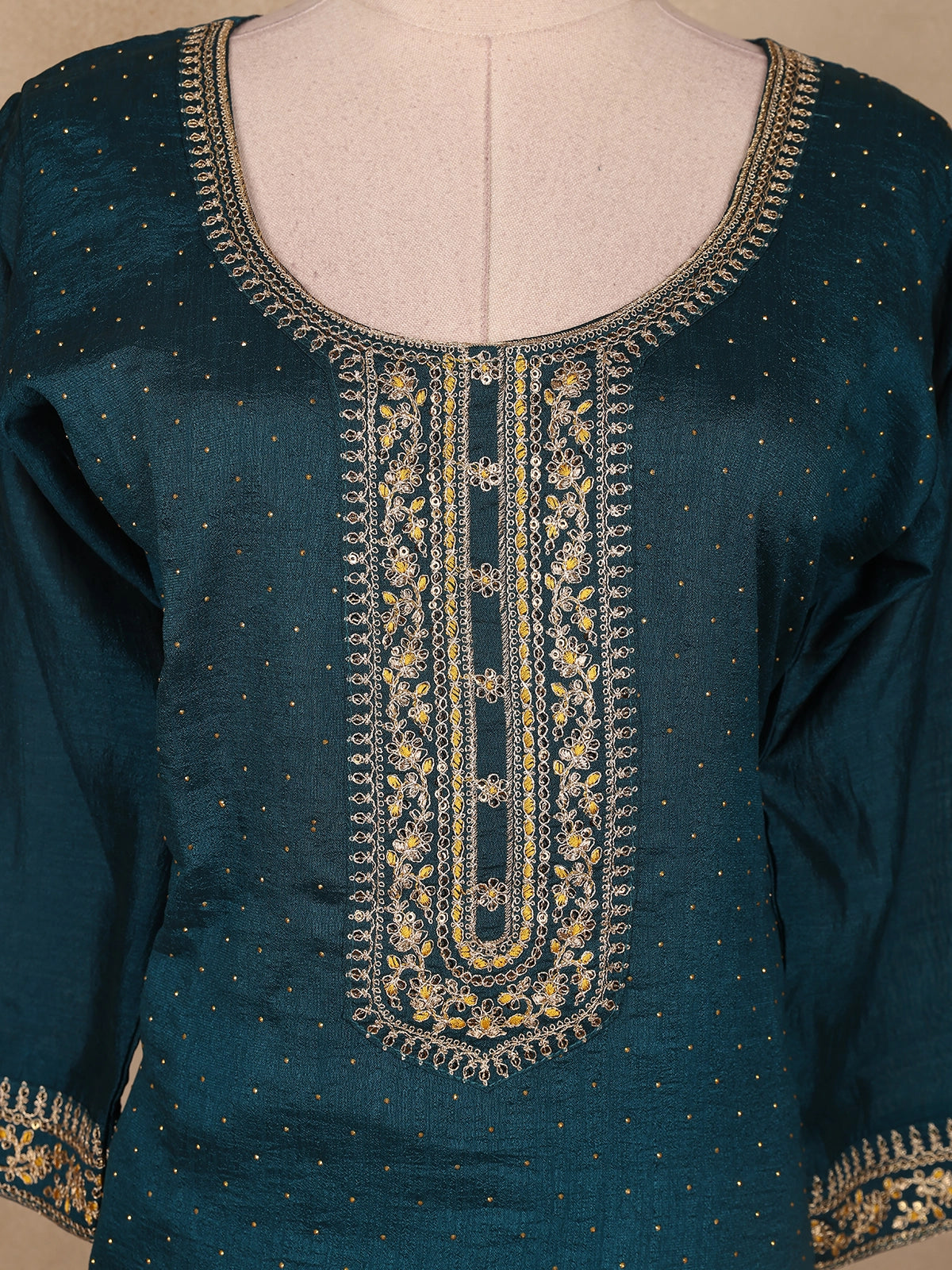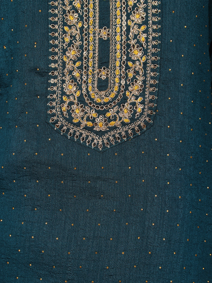 Elevate your festive charm with this exquisite Teal Blue Silk Palazzo Suit, gracefully crafted to reflect timeless elegance. The ensemble features a luxurious silk kurta adorned with intricate zari and thread embroidery along the neckline, sleeves, and hemline. The delicate floral motifs in shimmering gold and silver tones add a regal touch, while the subtle dotted detailing across the fabric lends a graceful sheen.