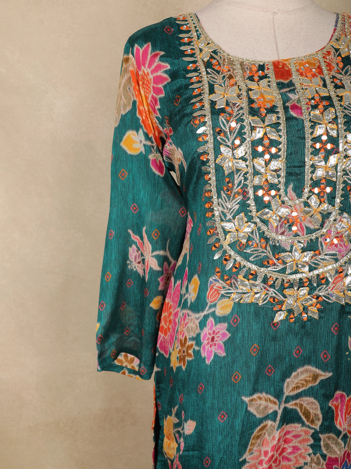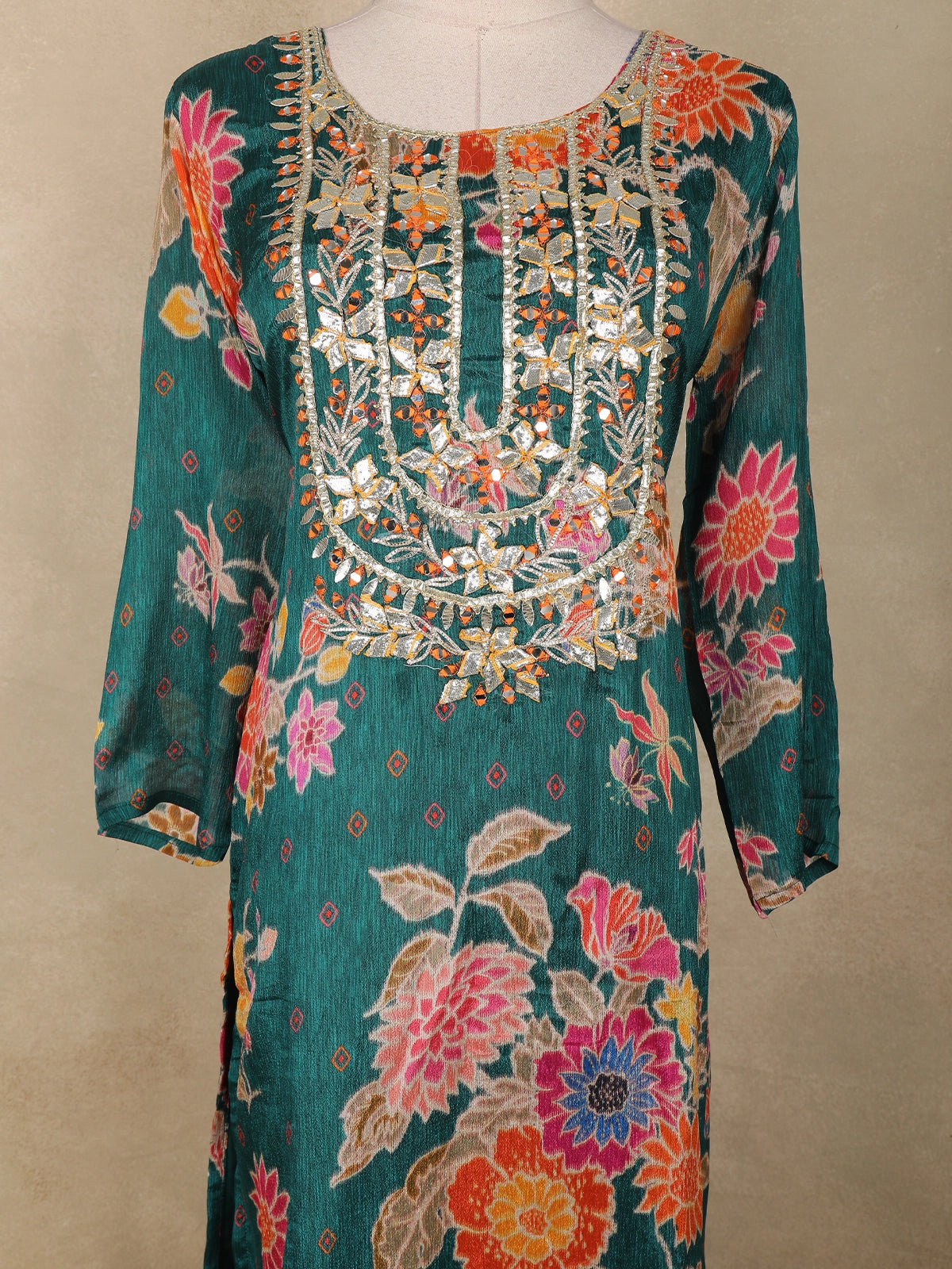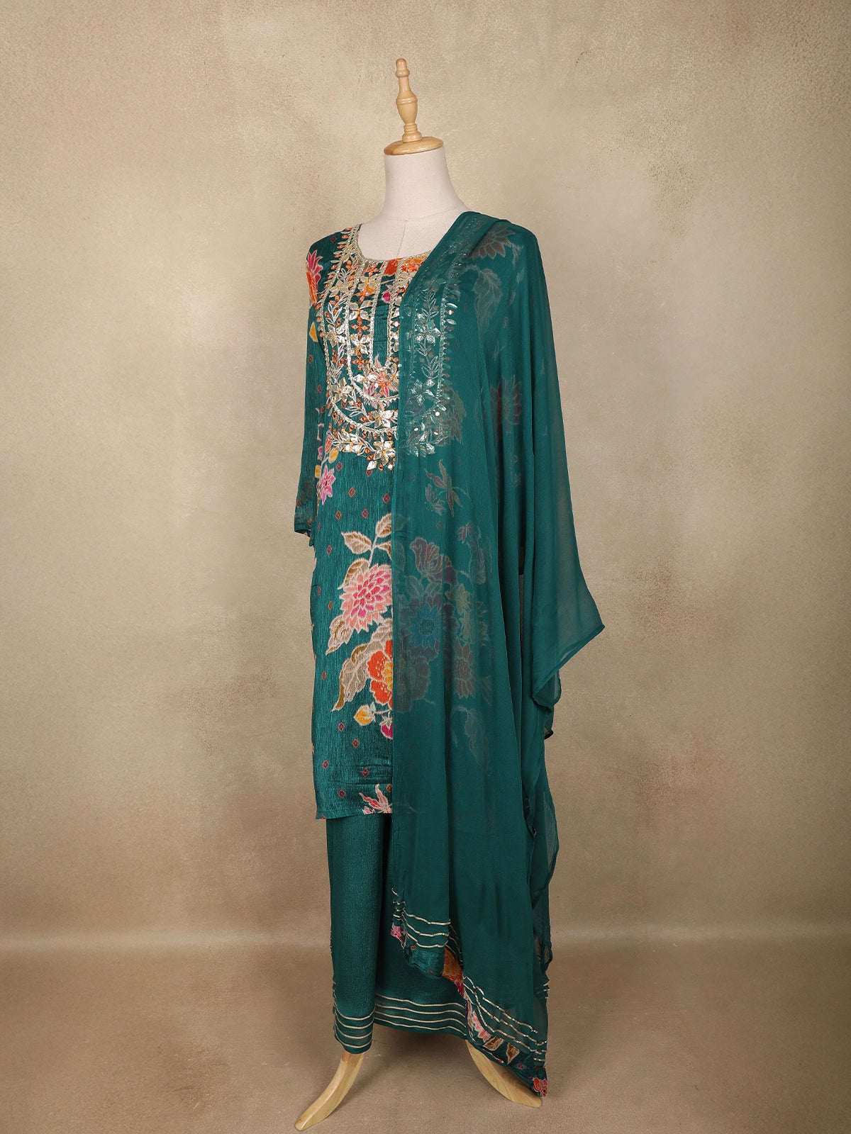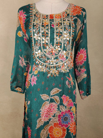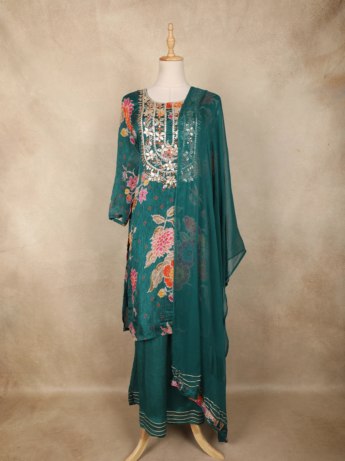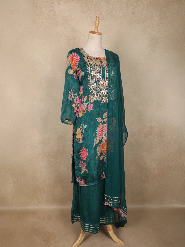 The kurta features a graceful straight-cut silhouette enhanced with intricate mirror and thread embroidery along the yoke, adding a subtle sparkle that elevates its overall look. The floral motifs spread across the body create a lively, feminine appeal, while the coordinating palazzo and dupatta complete the ensemble with harmonious detailing.