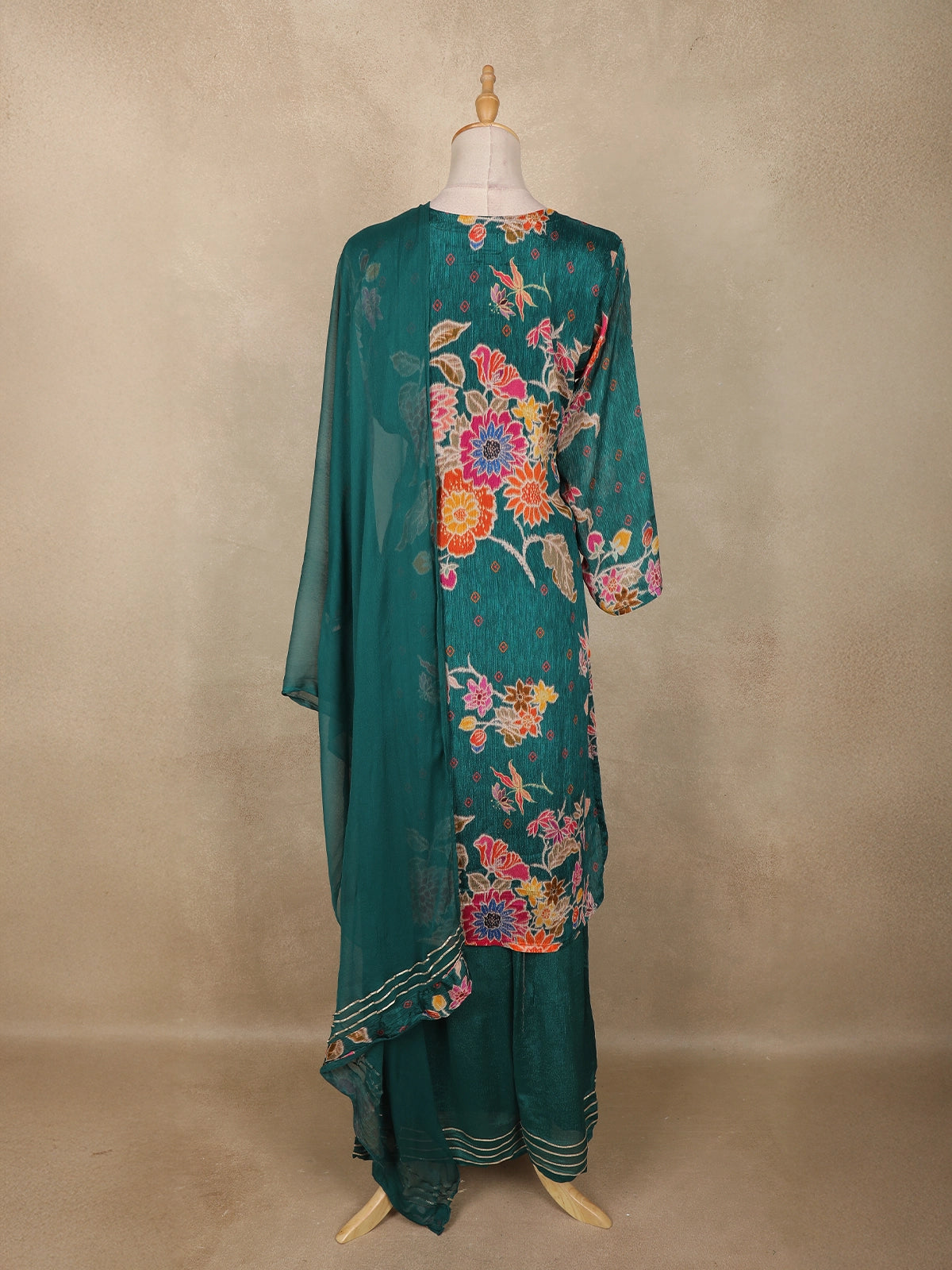Step into effortless elegance with this peacock green cotton crepe salwar suit, adorned with vibrant floral prints that bring a refreshing burst of color to your wardrobe. The soft crepe fabric drapes beautifully, offering lightweight comfort ideal for everyday wear, office styling, or casual festive outings.