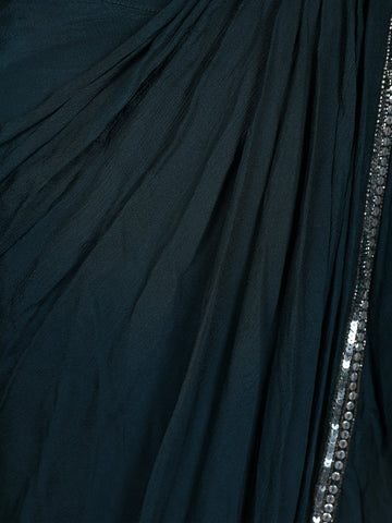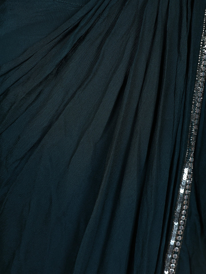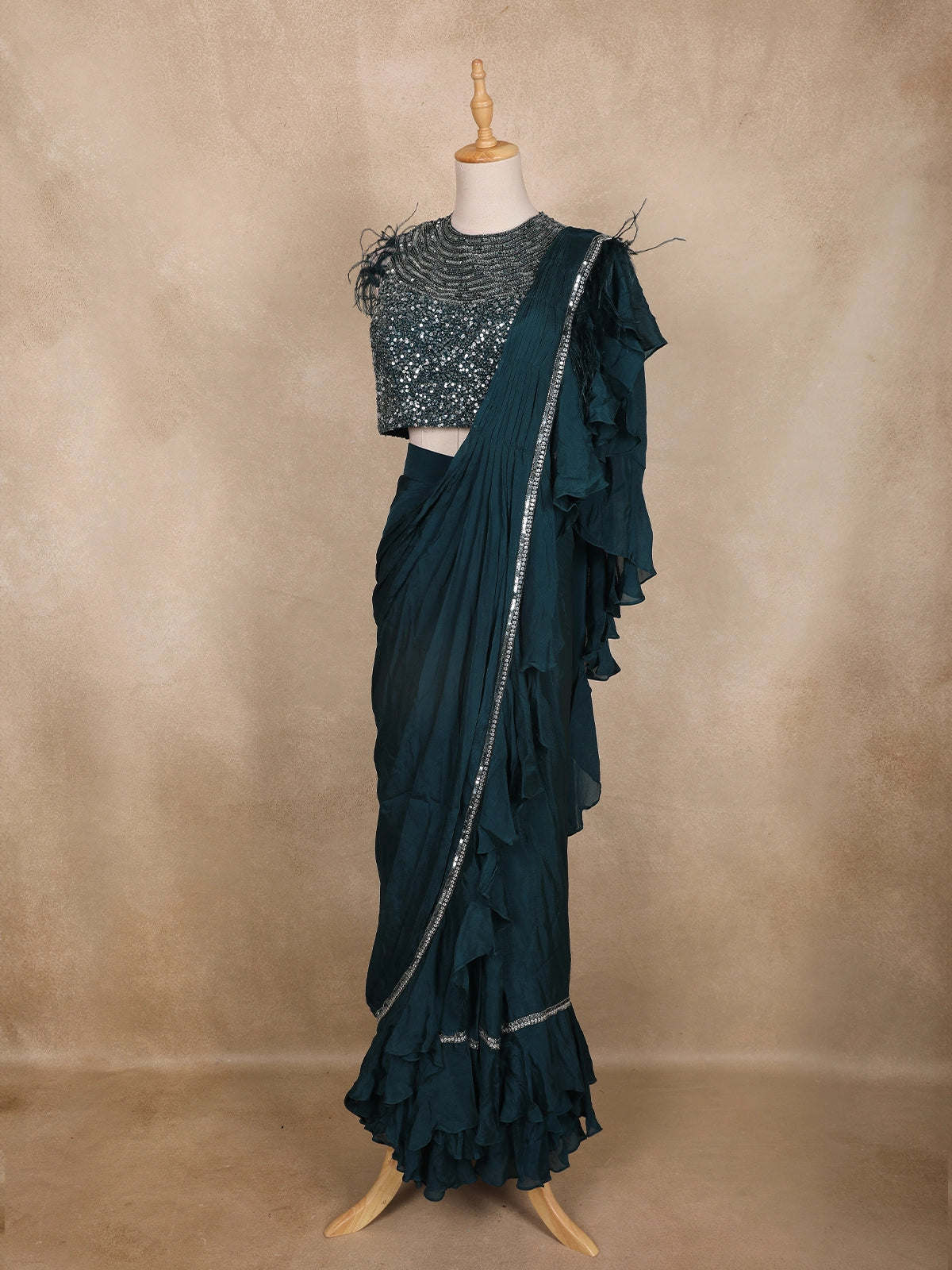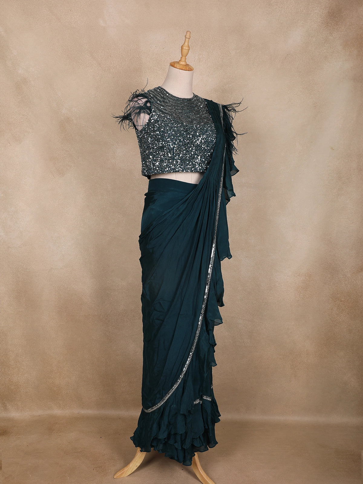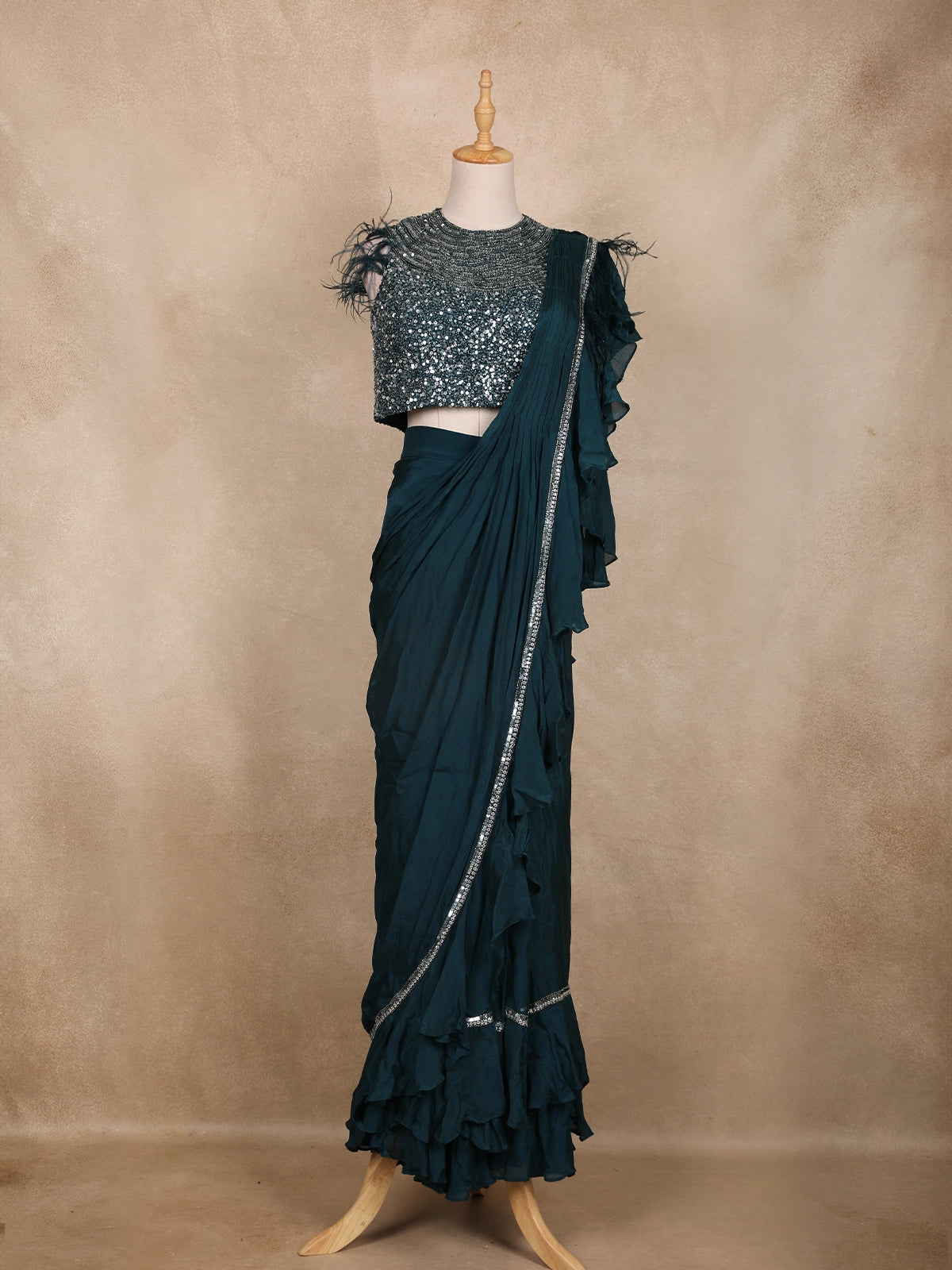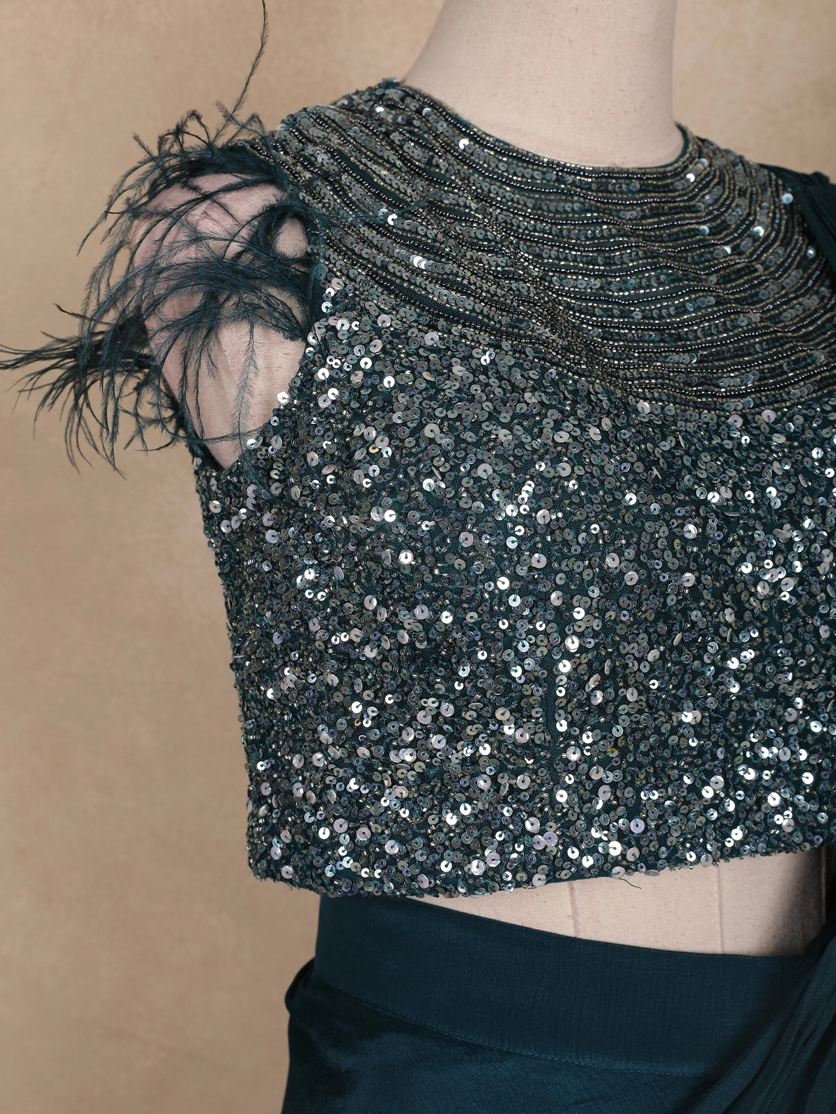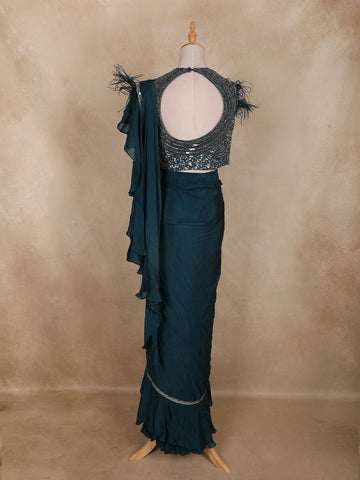 Turn heads with this glamorous Peacock Green pre-draped saree ensemble — a perfect blend of sophistication and sparkle. The sleeveless blouse is exquisitely adorned with dense sequin and bead embroidery, forming shimmering waves across the neckline. The feather embellishments on the shoulders add a touch of couture drama, making it a true statement piece.
