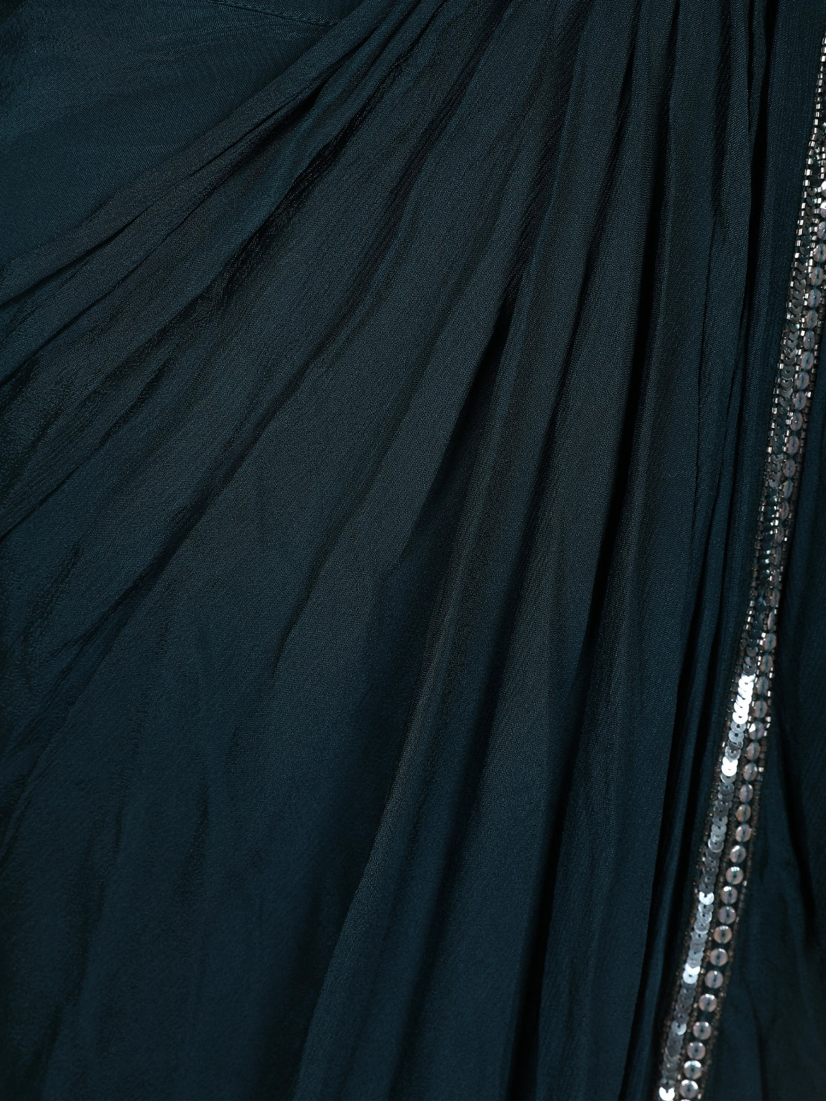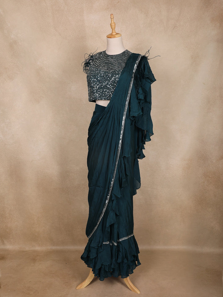 The matching Chiffon saree features cascading ruffles along the borders, highlighted with a delicate sequin trim that mirrors the blouse’s shimmer. Designed for effortless draping, this ready-to-wear saree combines modern ease with festive opulence — ideal for cocktail events, receptions, or sangeet nights.