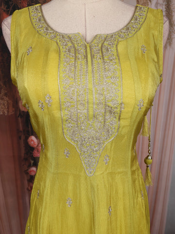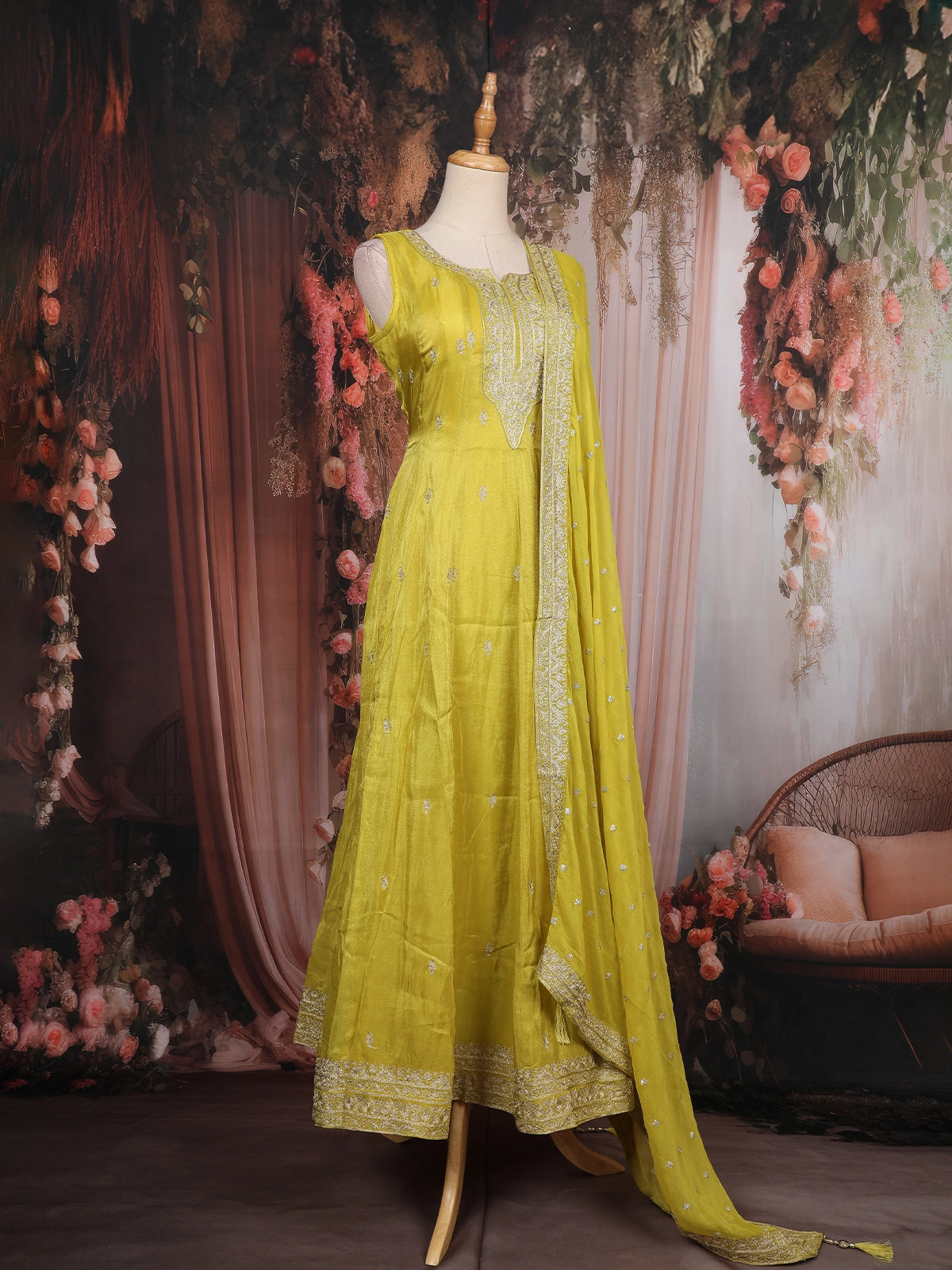 The Anarkali silhouette adds a regal flair, offering a flattering fall and elegant movement, while the intricate detailing at the neckline and borders radiates timeless sophistication. Designed for festive occasions, receptions, or traditional celebrations, this ensemble is a perfect harmony of opulence and style.