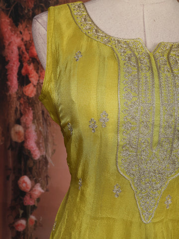 Make an unforgettable statement this festive season with this Peacock Green Silk Anarkali Suit, a stunning blend of royal elegance and refined craftsmanship. The outfit showcases exquisite zari and sequin embroidery intricately arranged in a graceful pattern that enhances the richness of the lustrous silk fabric.
