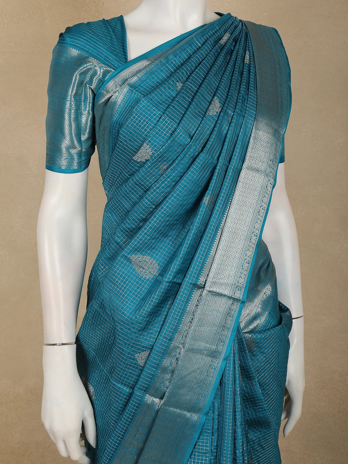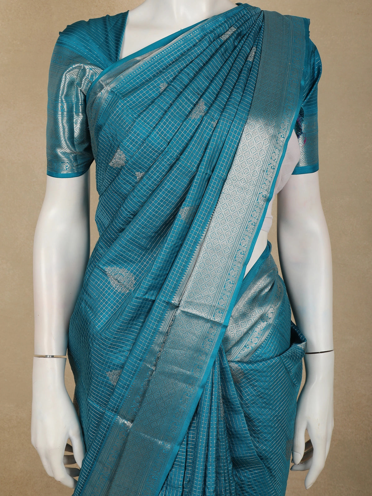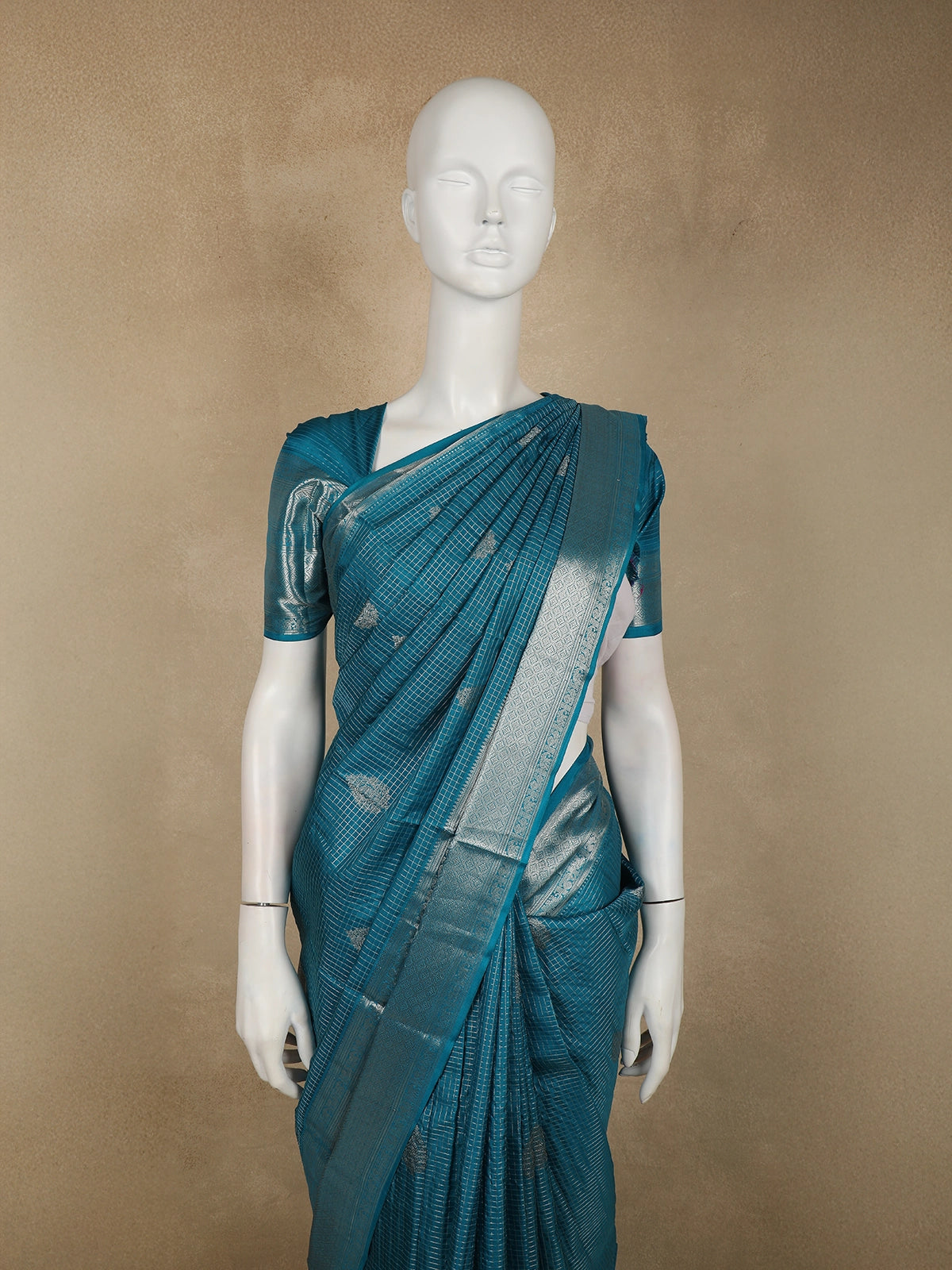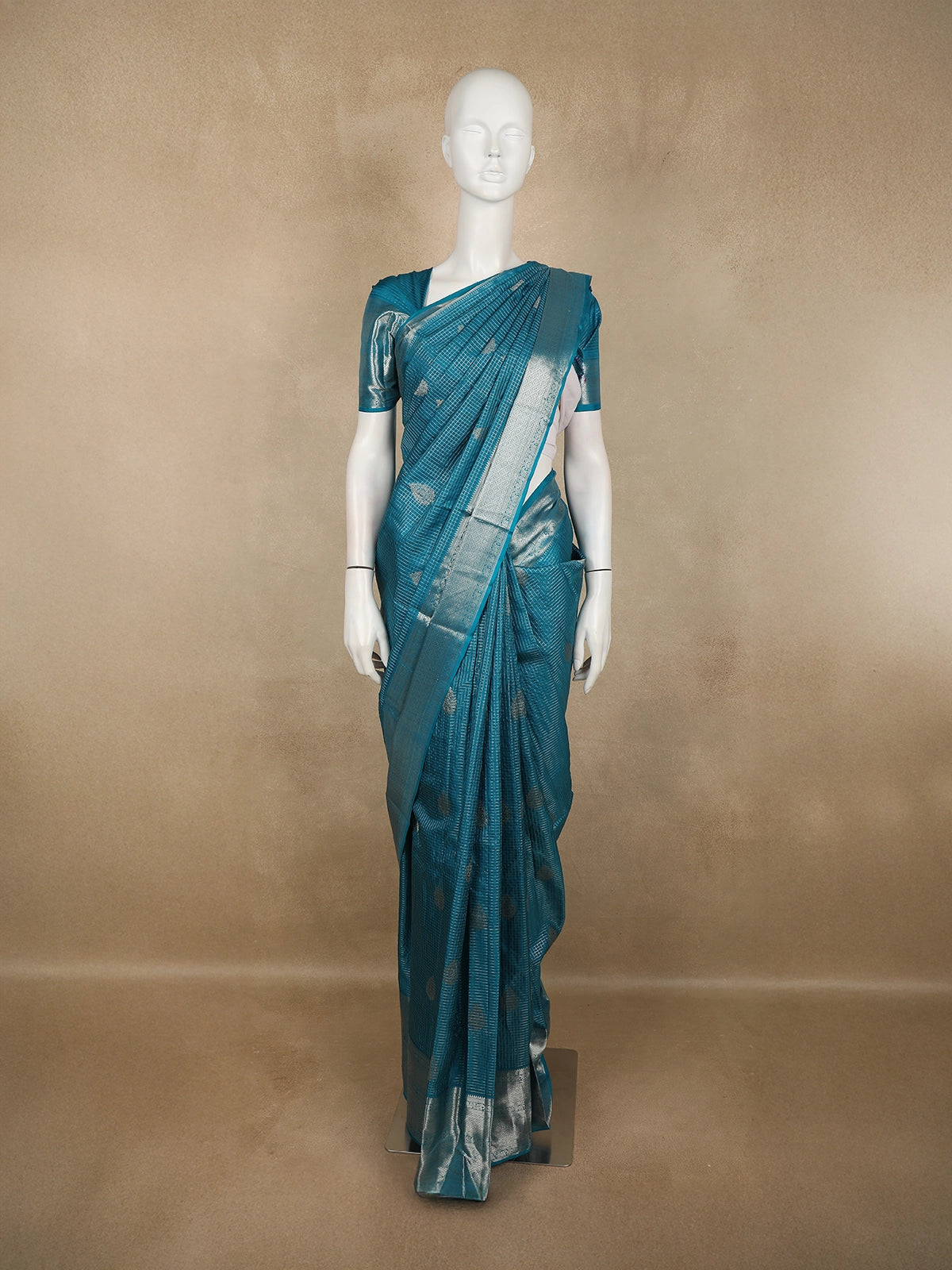 This Peacock Teal Blue Pure Kanchipuram Silk Saree is a striking blend of tradition and contemporary elegance. Woven in a rich teal blue hue with a subtle checked zari woven design, the saree reflects the hallmark craftsmanship of authentic Kanchipuram silk.