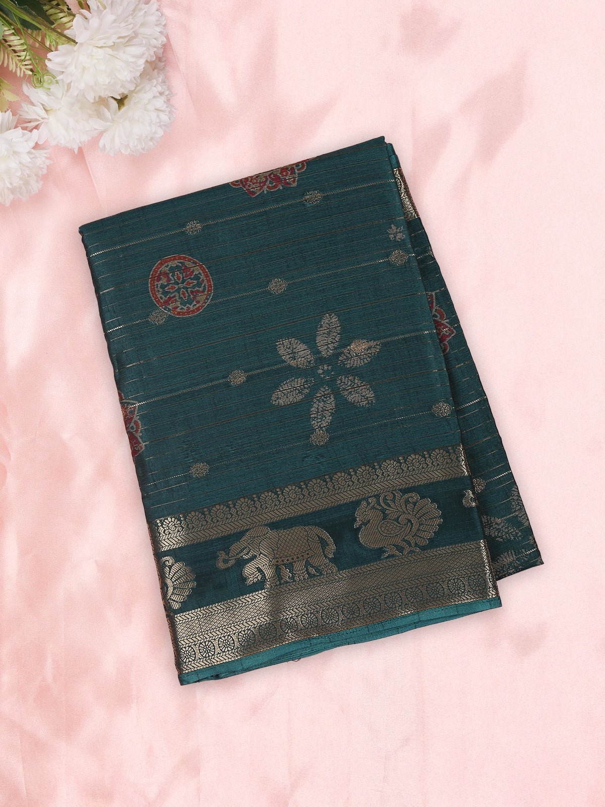 Step into timeless elegance with this beautifully crafted peacock teal blue semi silk saree, designed to reflect traditional artistry with a graceful modern touch. The rich olive green body is enhanced with subtle horizontal zari stripes, giving the saree a refined texture and a gentle sheen that elevates its festive appeal.