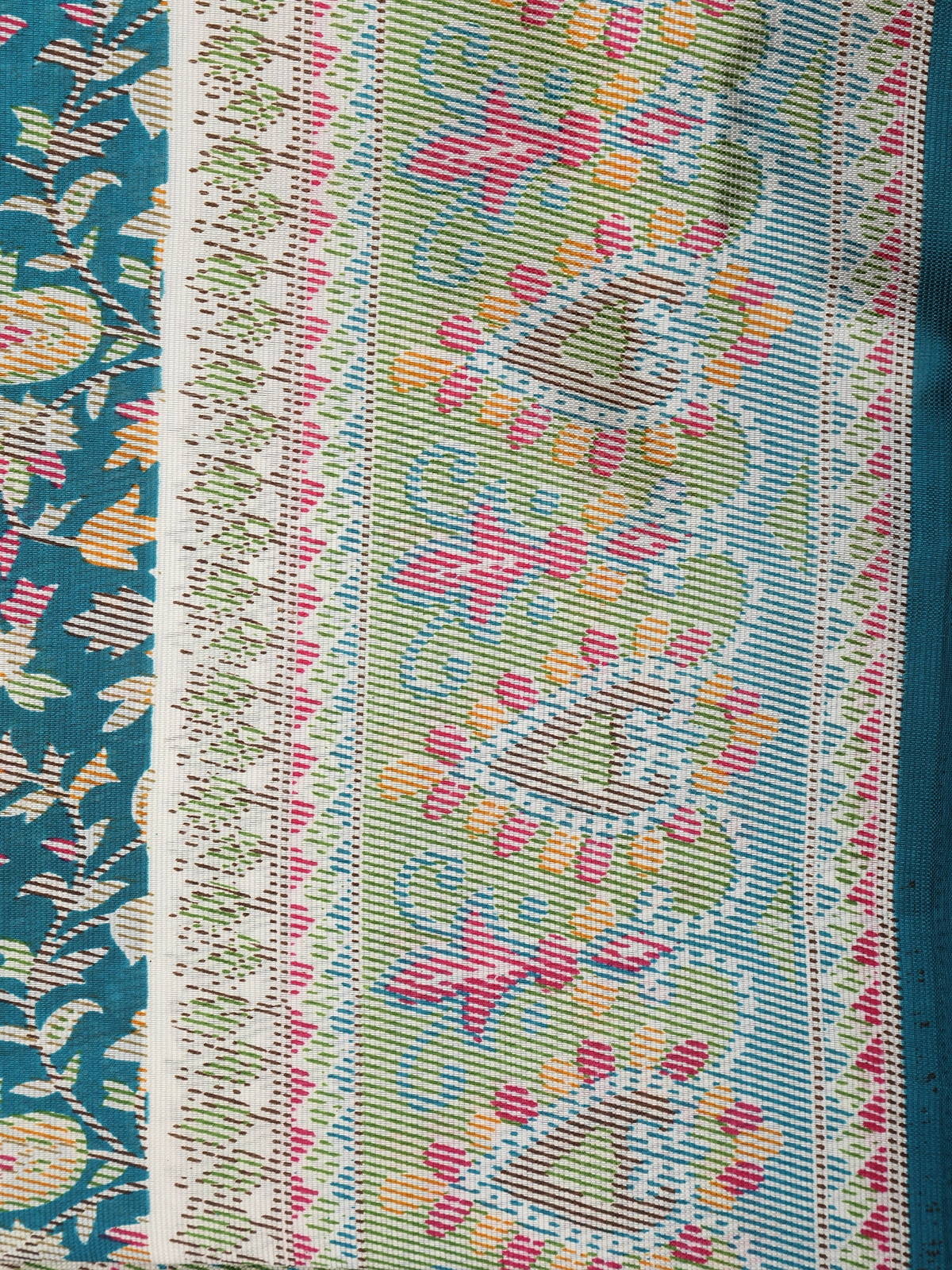 The saree features a rich peacock teal blue base adorned with intricate paisley and foliage-inspired prints in multicolour accents, lending it a lively yet refined appeal. The beautifully coordinated pallu showcases a contrast patterned panel with geometric and floral elements, adding depth and visual interest to the overall design. A neatly finished solid border in matching teal blue enhances the elegance while keeping the look balanced and contemporary.