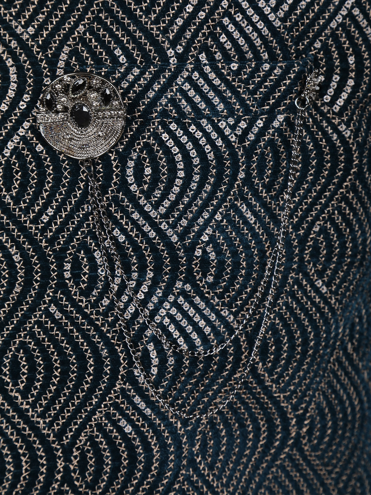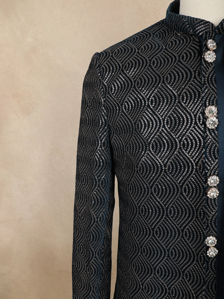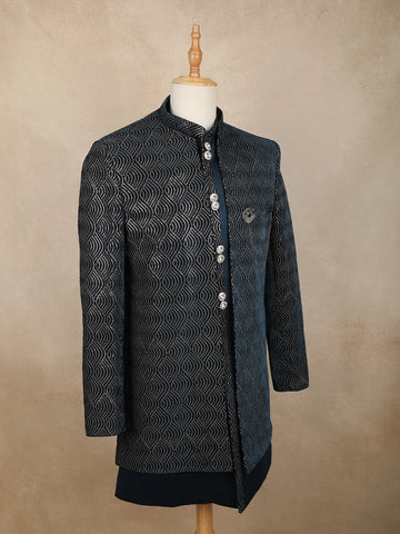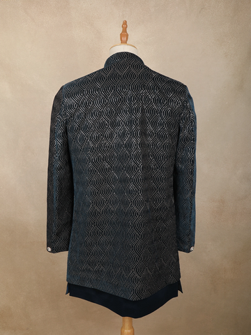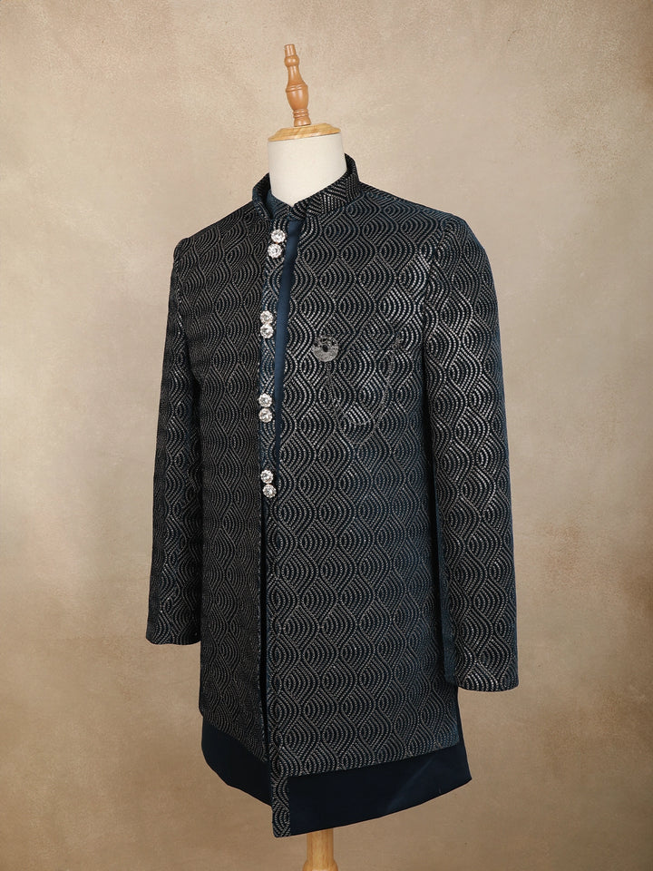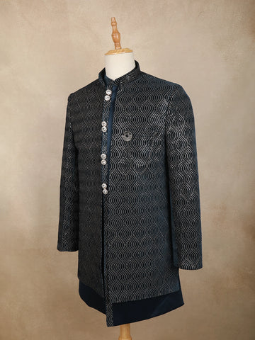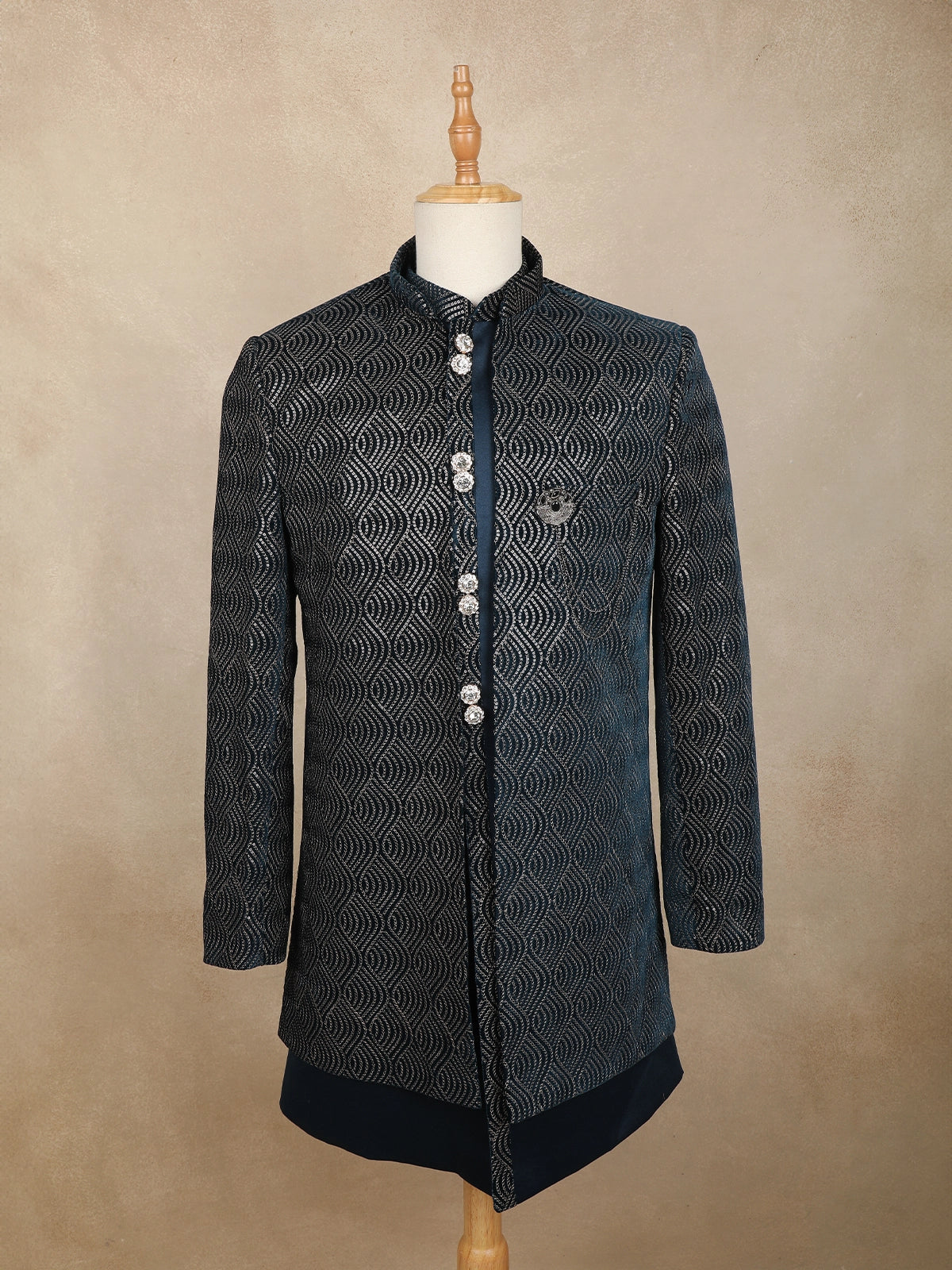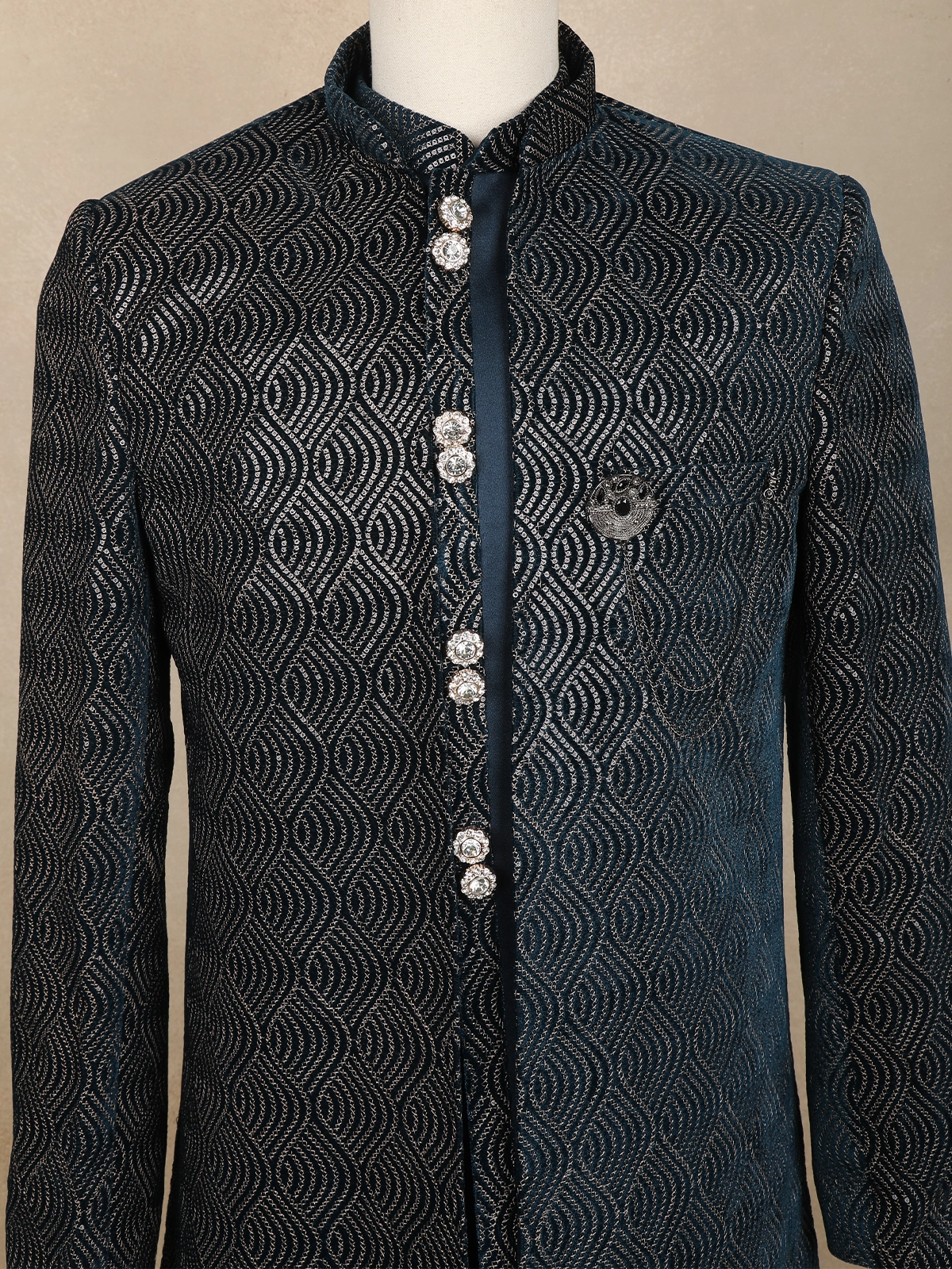 Make a refined style statement with this peacock blue Indo-Western sherwani, crafted in a luxurious woven fabric featuring an intricate geometric pattern throughout. The textured wave-motif design adds depth and sophistication, while the sleek mandarin collar enhances its regal appeal. The sherwani is finished with striking embellished buttons that add a touch of shine and elevate the entire look. A matching navy underlayer at the hemline gives a sharp, structured silhouette, perfect for festive occasions and wedding celebrations. Pair it with contrasting churidar pants or matching trousers to complete the elegant ensemble.
