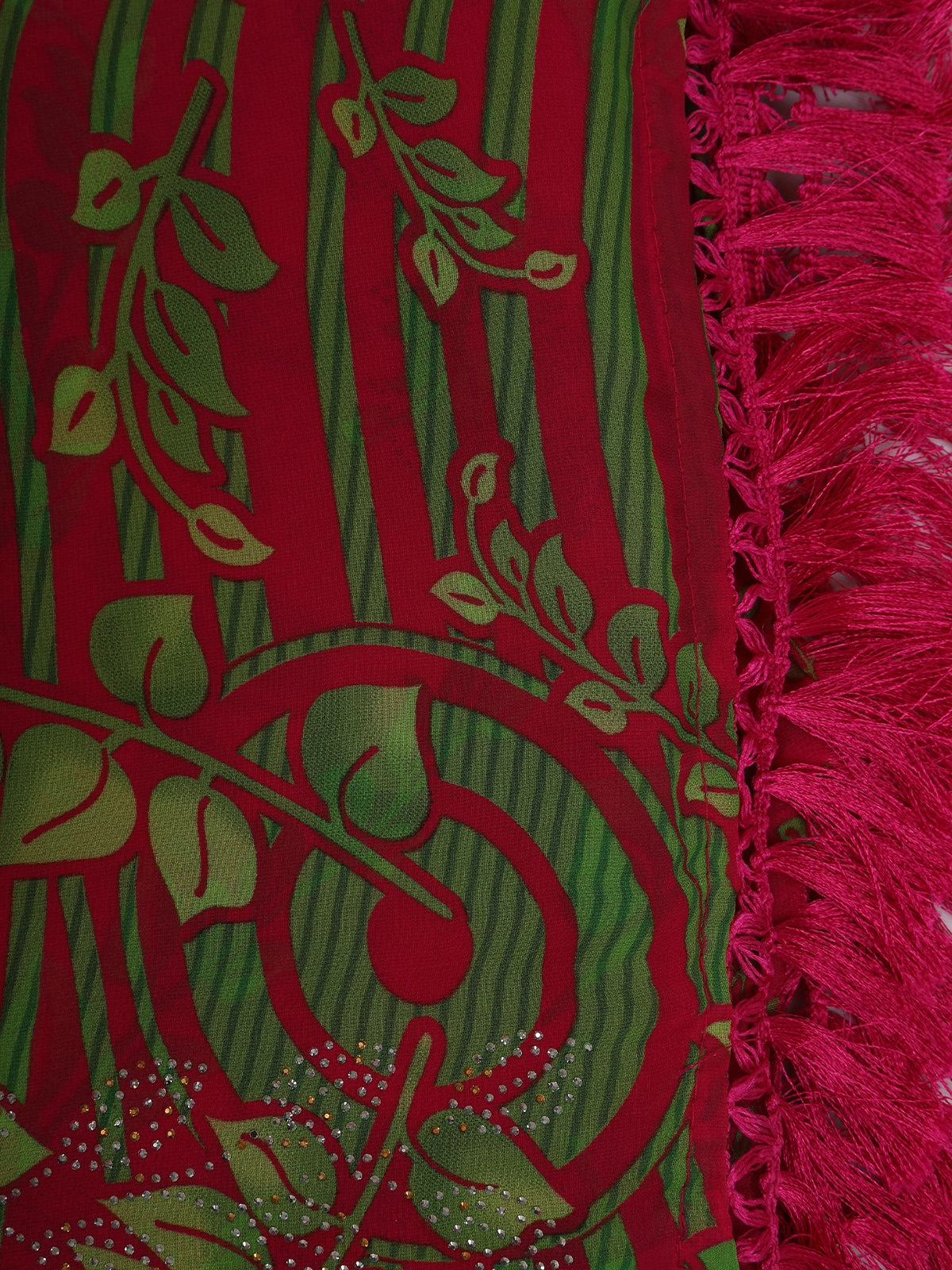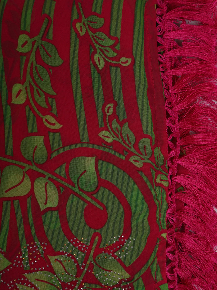 Pink and Green Leaf Printed Design Chiffon Saree with Stone Embellished Border