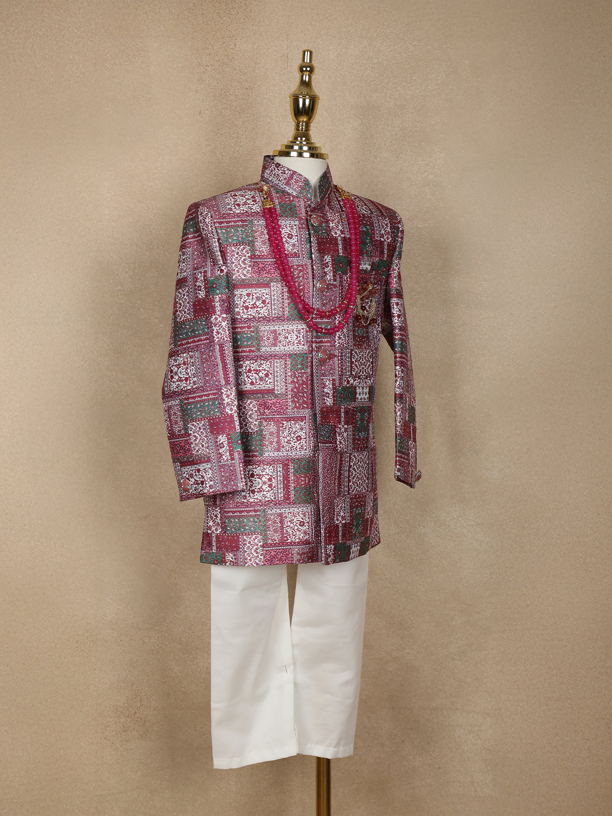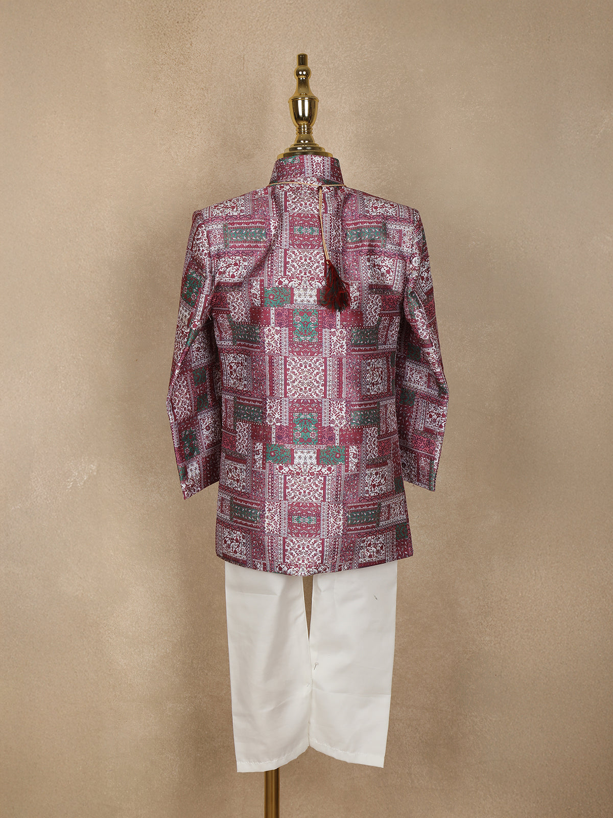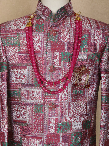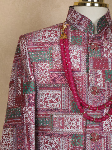 Pink and Green Patch Design Printed Kids Semi Silk Sherwani