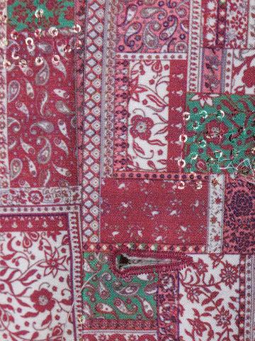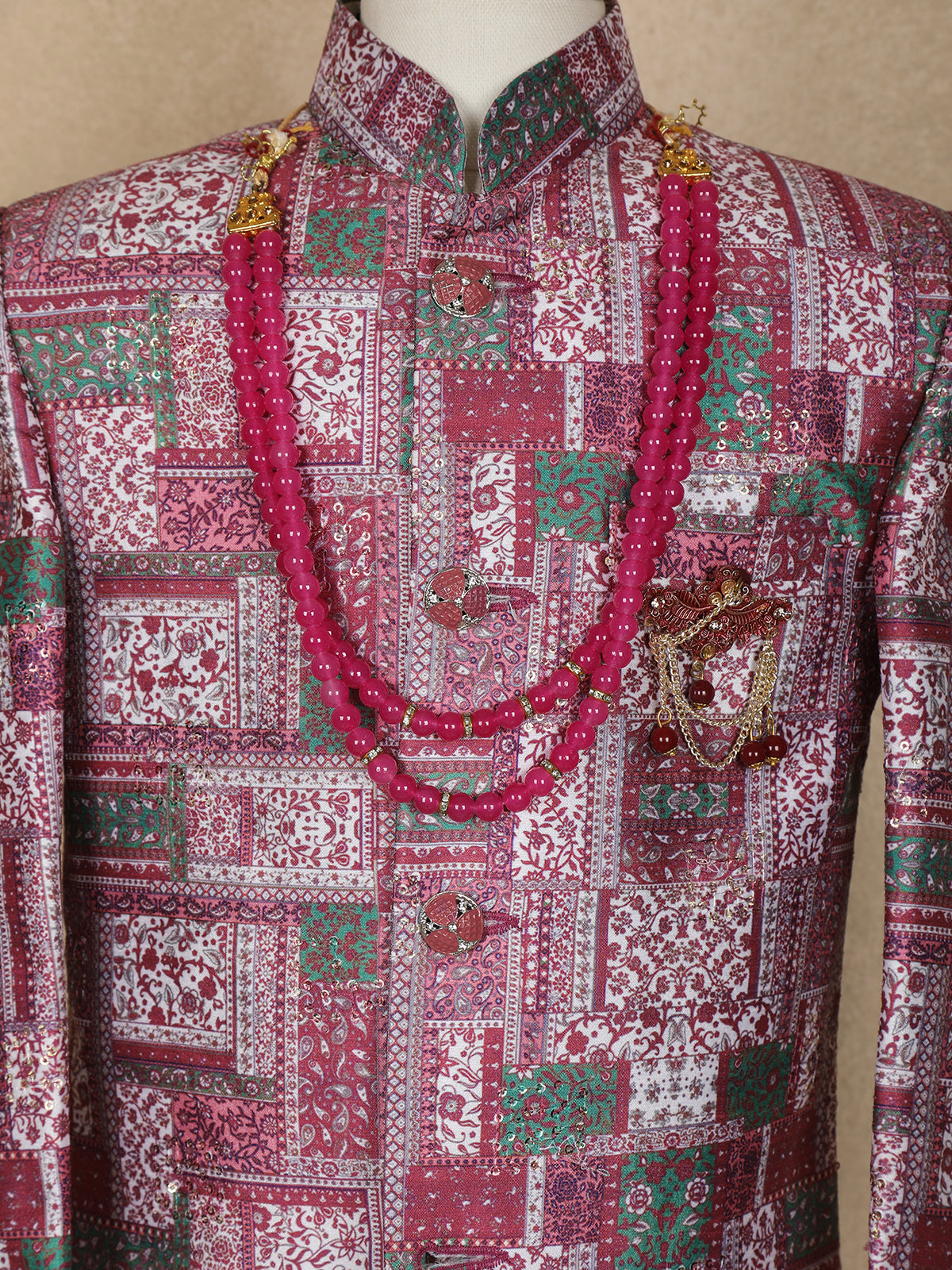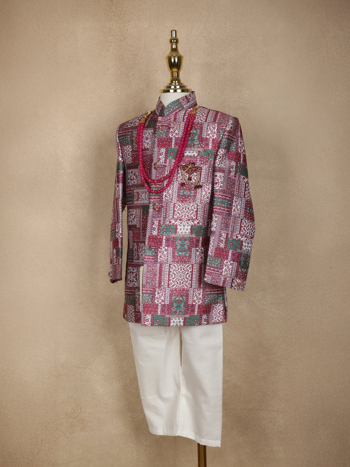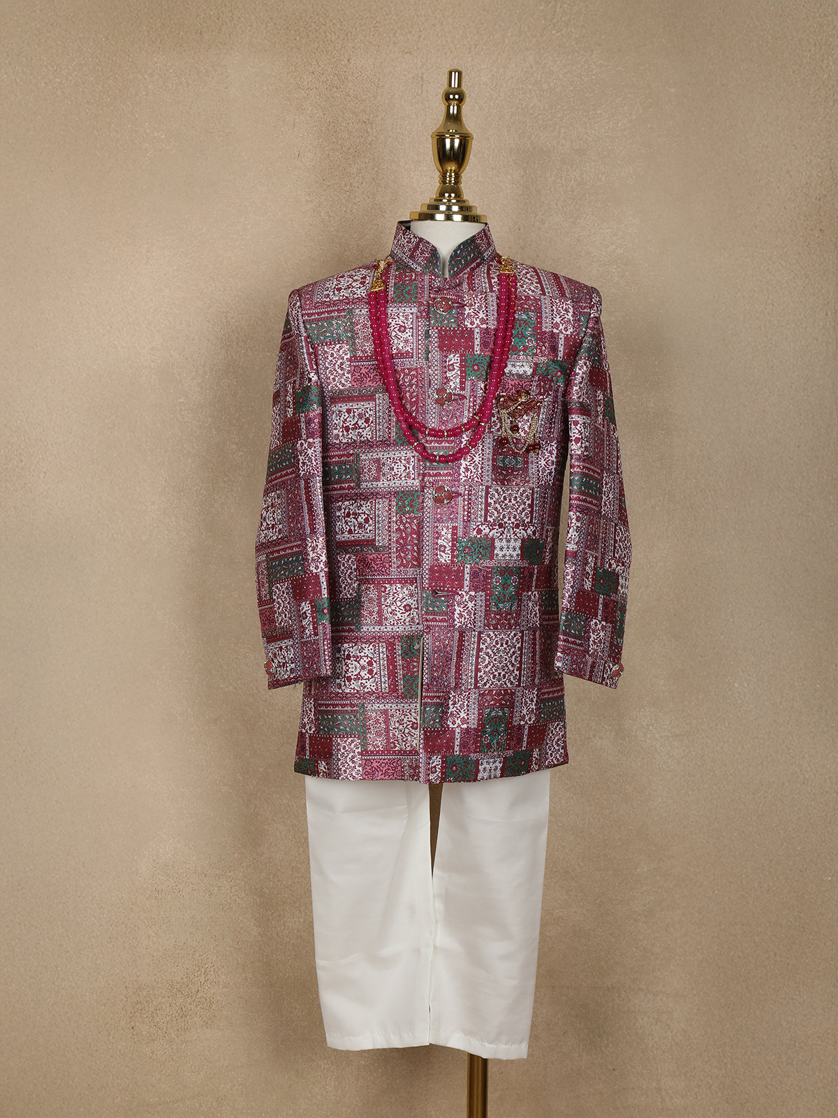 Pink and Green Patch Design Printed Kids Semi Silk Sherwani