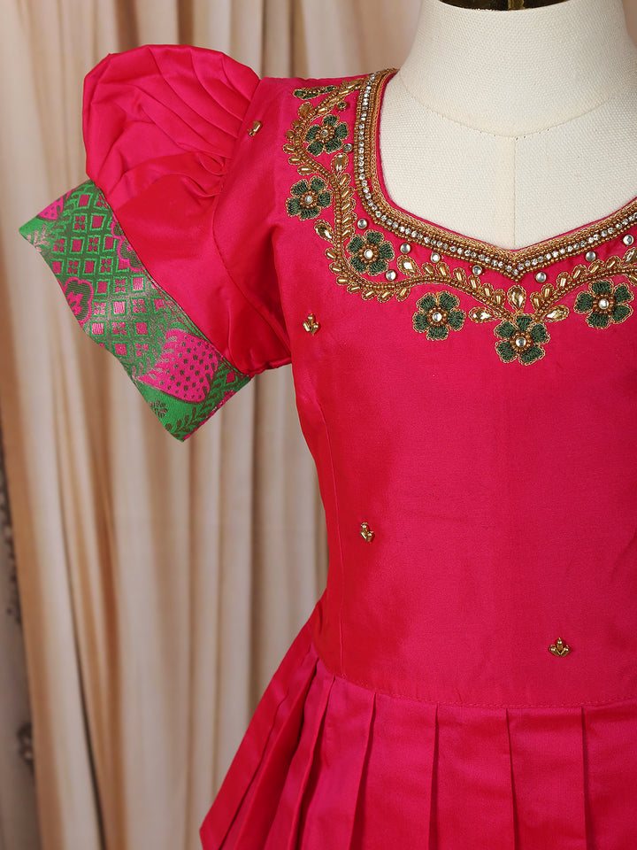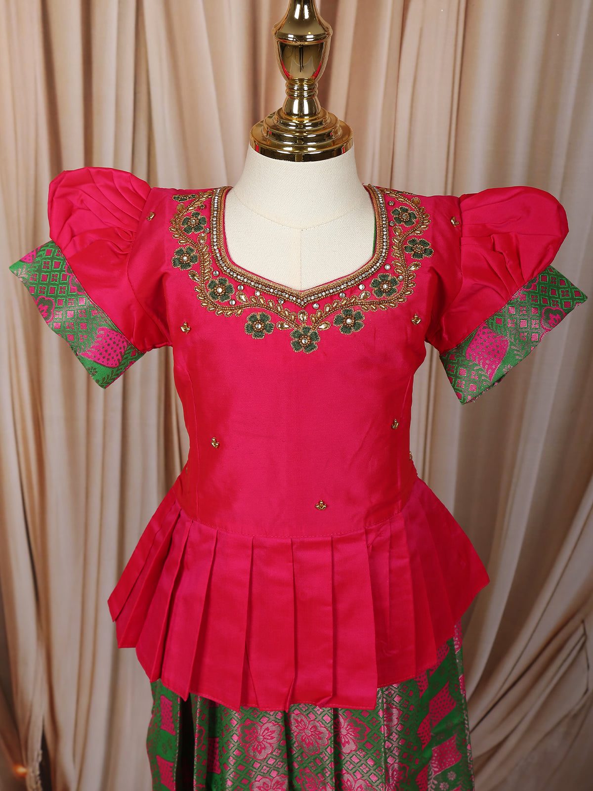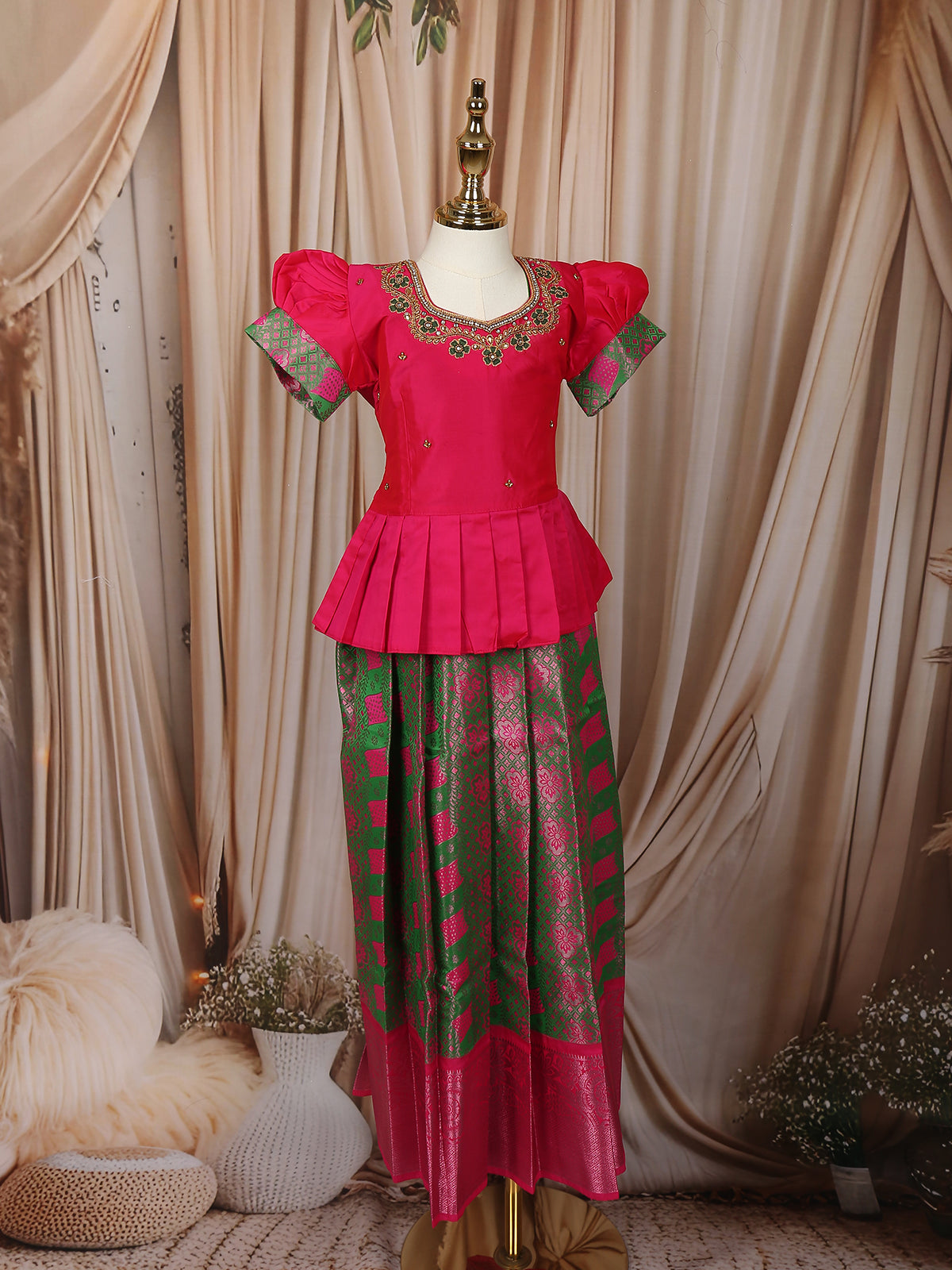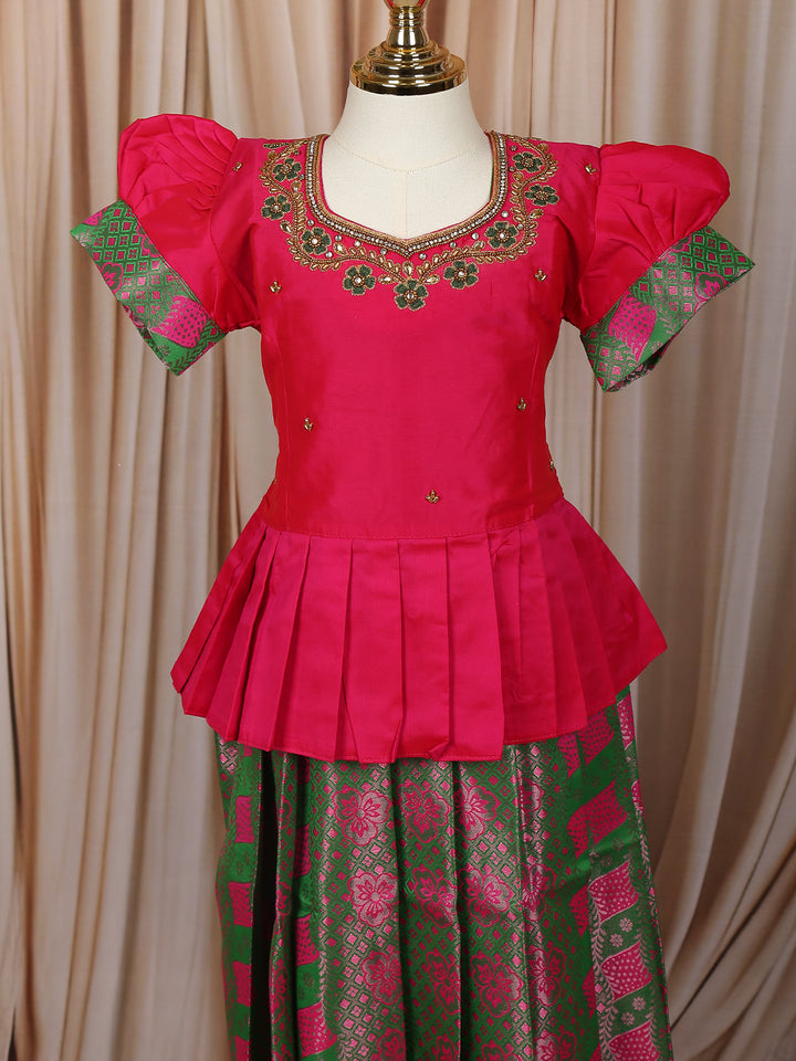 Dress your little one in timeless tradition with this charming pink and green pattu pavadai set. Crafted in soft and lustrous art silk, this outfit beautifully blends cultural elegance with playful comfort. The blouse is designed in a rich pink shade, featuring delicate floral thread and sequins embroidery around the neckline, adding sparkle and grace. The puff sleeves with contrast woven borders bring a classic South Indian festive touch, while the pleated peplum waist adds a cute and trendy silhouette perfect for kids.
