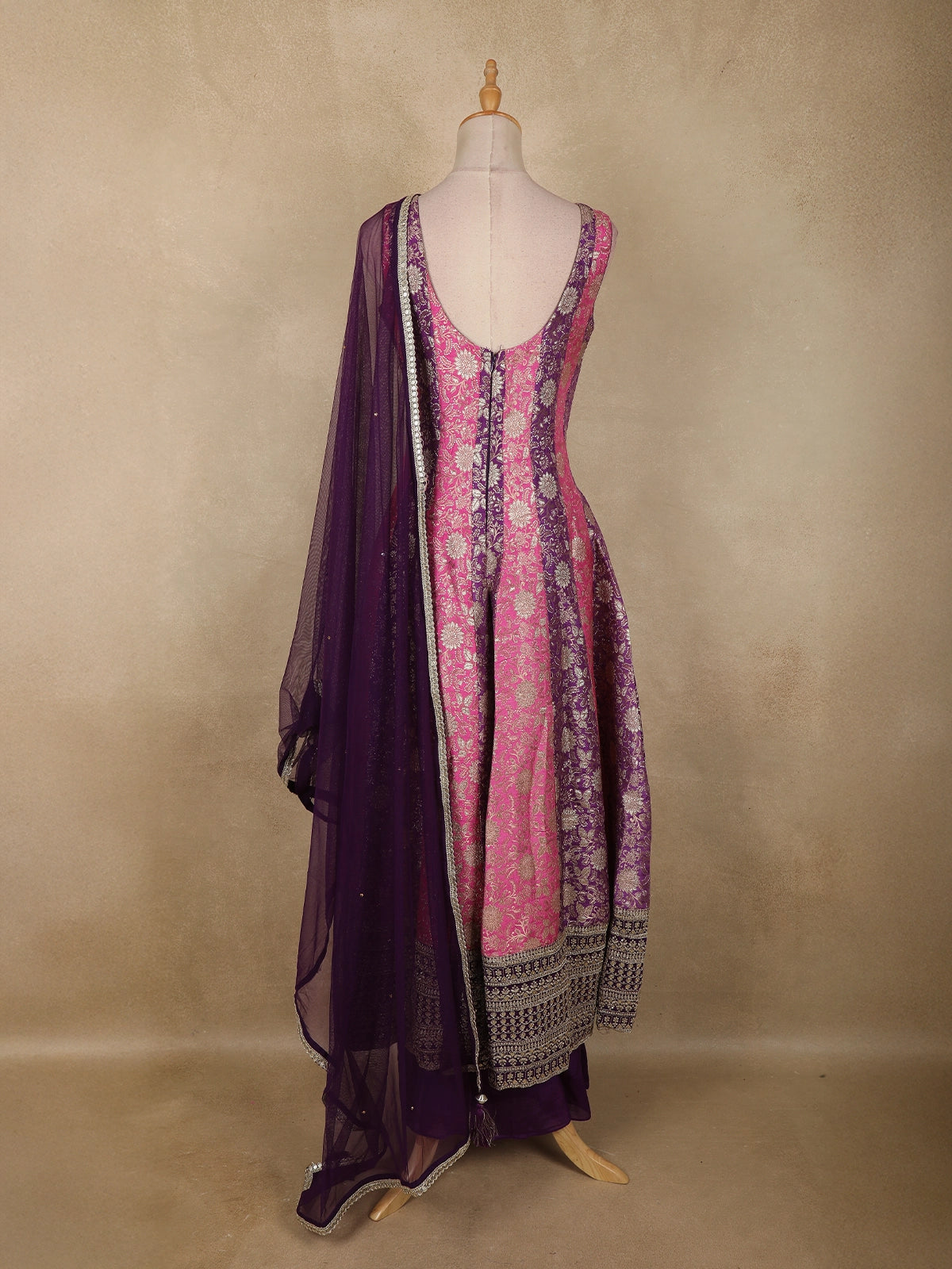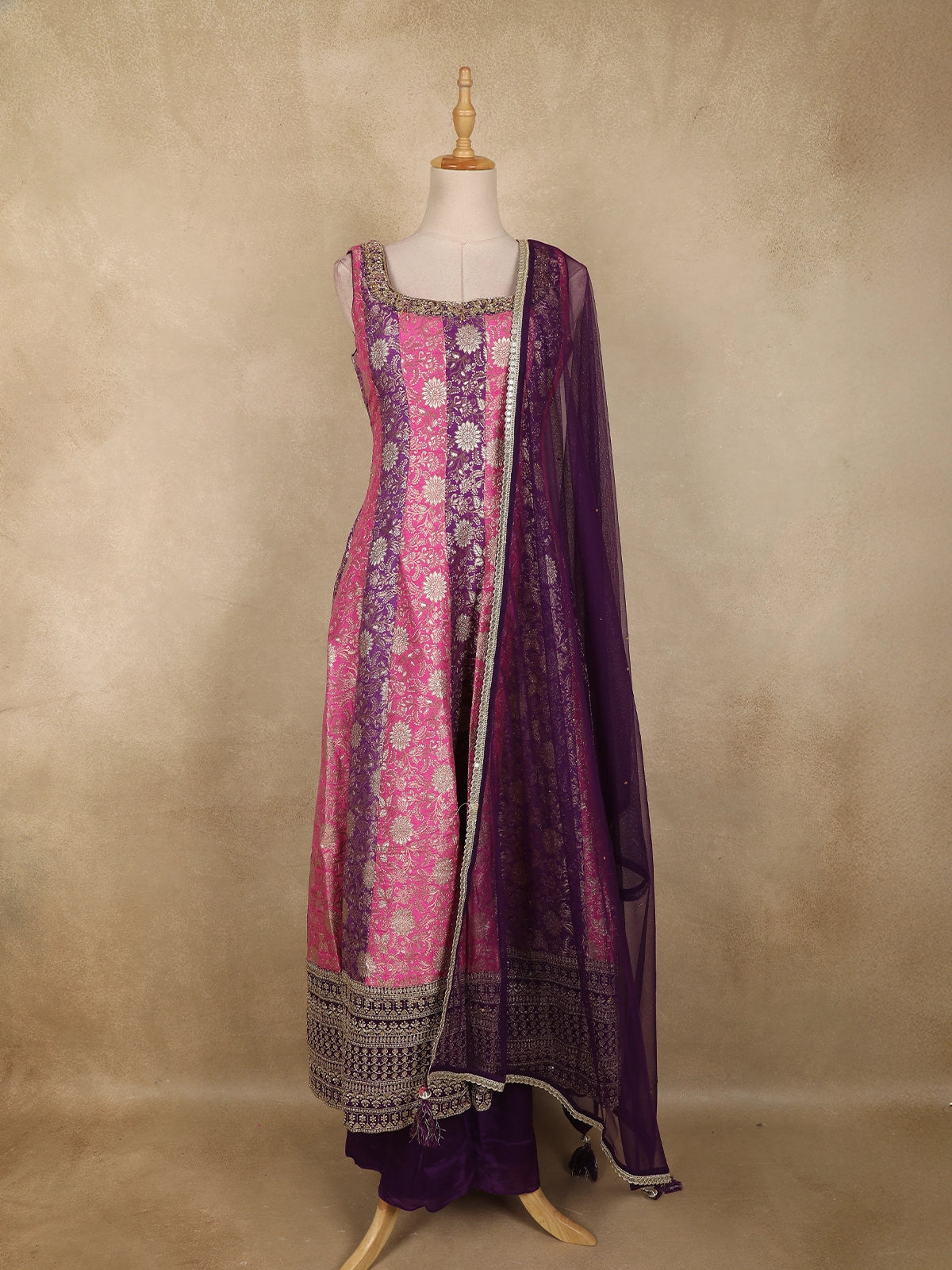 Radiating festive elegance, this pink and deep purple Banarasi silk palazzo suit is a striking blend of heritage craftsmanship and contemporary styling. The kurta is beautifully crafted in rich Banarasi silk, featuring intricate silver zari floral weaving arranged in elegant vertical panels of pink and purple. This dual-tone palette adds depth and vibrance while creating a flattering, elongated silhouette.