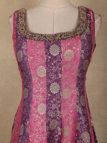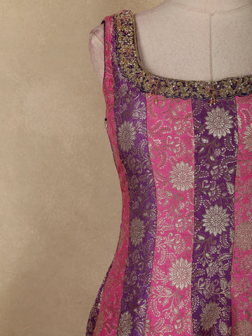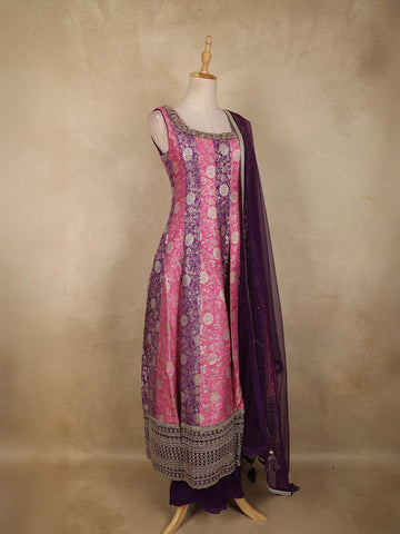 Pink and Purple Floral Woven Banarasi Silk Palazzo Suit with Sheer Dupatta