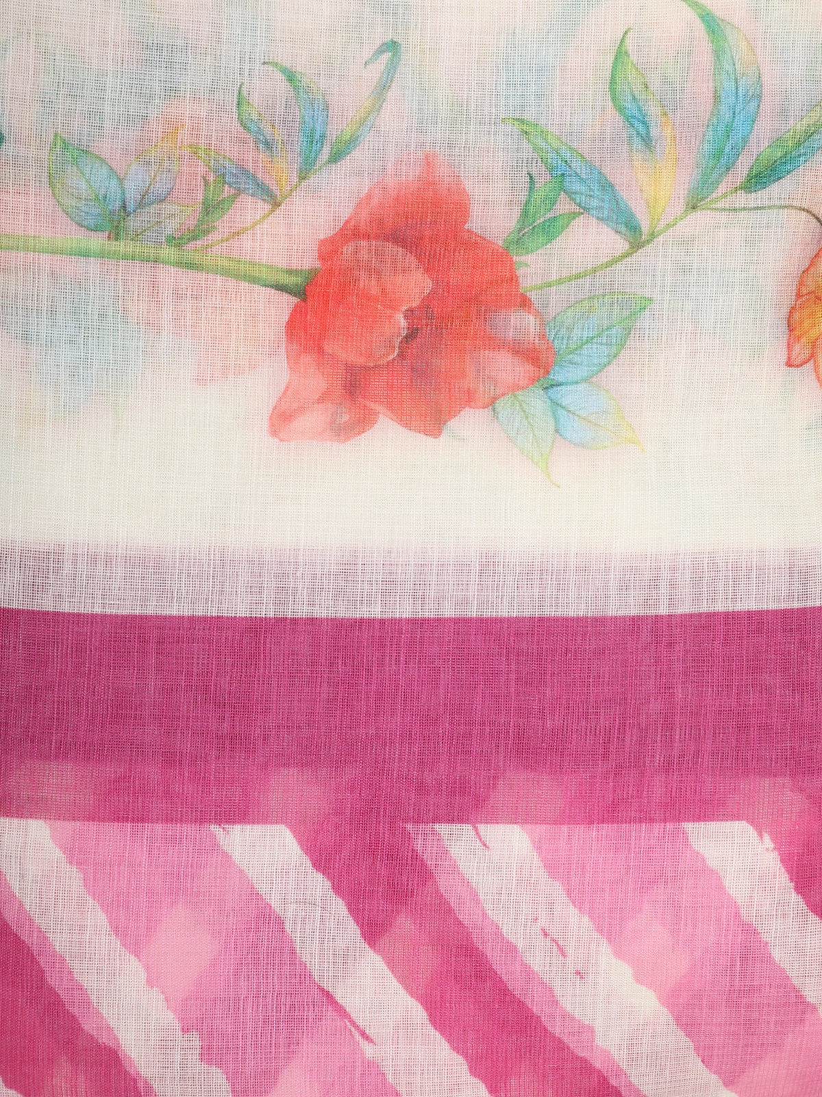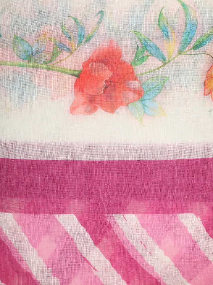 Fresh, graceful, and delightfully feminine — this Pink and White Linen Cotton Saree brings a soft and refreshing charm to your everyday ethnic wardrobe. The saree features bold pink striped patterns on a soothing white base, creating a visually uplifting yet balanced look. The highlight of the design is the delicate floral border and pallu, where watercolor-style blossoms add a gentle, artistic flair.