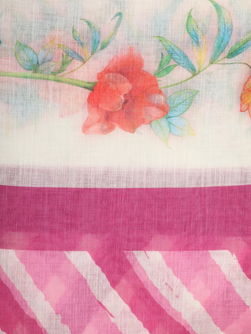 Pink and White Striped Printed Design Linen Cotton Saree with Floral Border