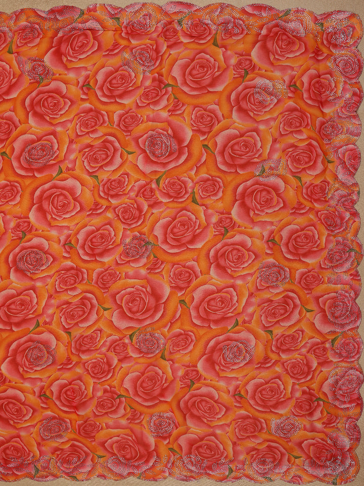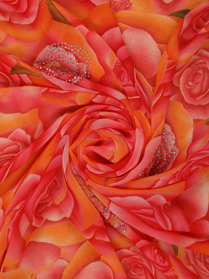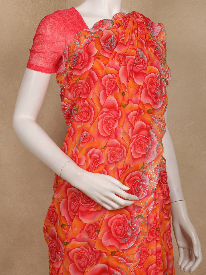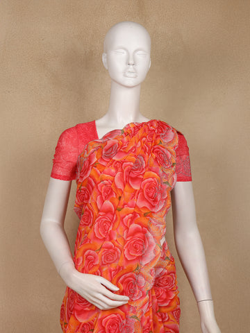 Pink and Yellow Floral Printed Design Chiffon Saree