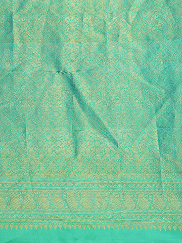 The beauty of this drape is elevated by its contrast green zari border and pallu, intricately woven with golden motifs that add depth and grandeur. The contrast green blouse piece completes the ensemble, creating a striking and vibrant combination that exudes traditional sophistication.