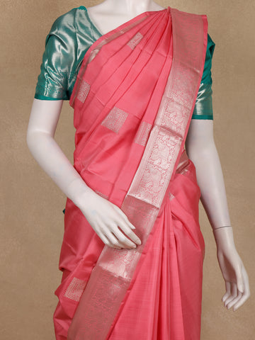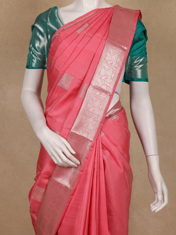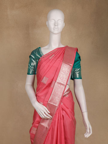 A striking contrast green blouse and pallu lend a vibrant appeal, beautifully enhancing the pink base. The classic zari border with intricate patterns further elevates its regal look, ensuring you make a grand statement wherever you go.