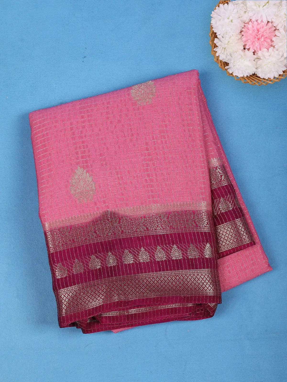 Pink Checked Mysore Silk Saree With Silver Zari Motifs And Maroon Border