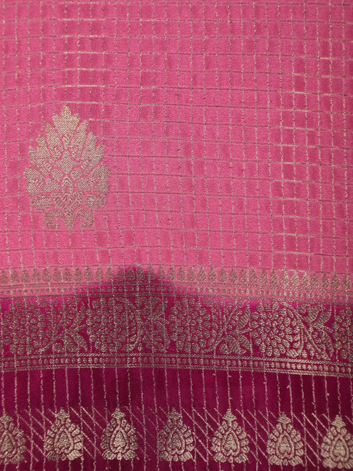 Celebrate timeless elegance with this Pink Mysore Silk Saree, featuring a graceful checked pattern highlighted with delicate silver zari butta motifs. The radiant pink body is beautifully complemented by a deep maroon border, intricately woven with silver zari floral and paisley patterns, exuding richness and grandeur. The lustrous Mysore silk fabric ensures a regal drape, while the contrast pallu adds to its opulent charm.