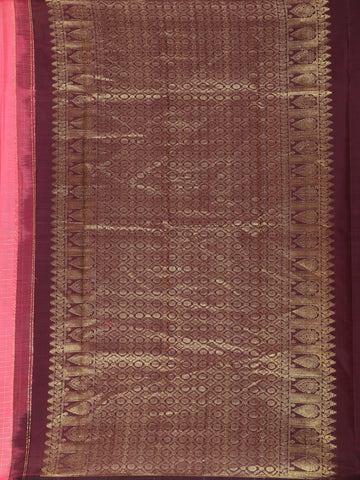 Graceful and timeless, this Pink Pure Kanchipuram Silk Saree reflects the elegance of traditional South Indian weaving. The body features subtle zari checks arranged evenly across the sari, lending a structured and classic appeal. Scattered golden zari buttas add a refined shimmer, enhancing the drape without overpowering it.