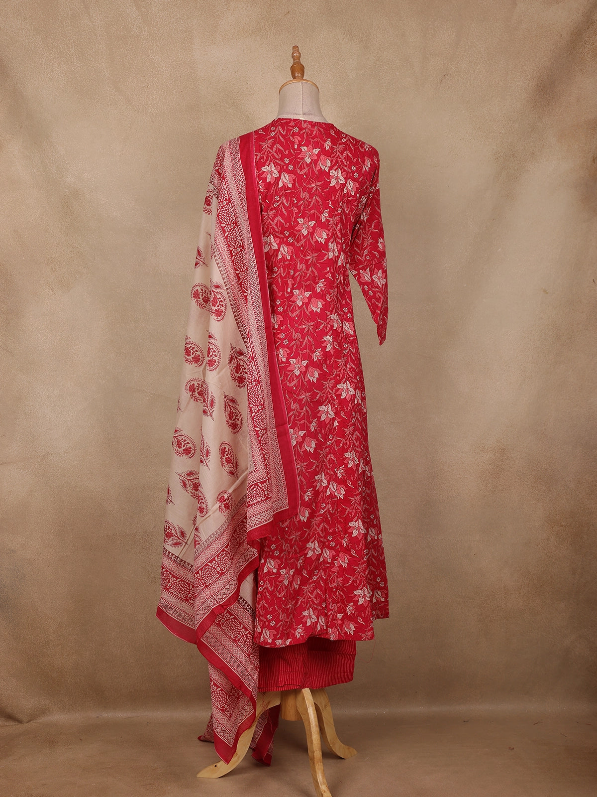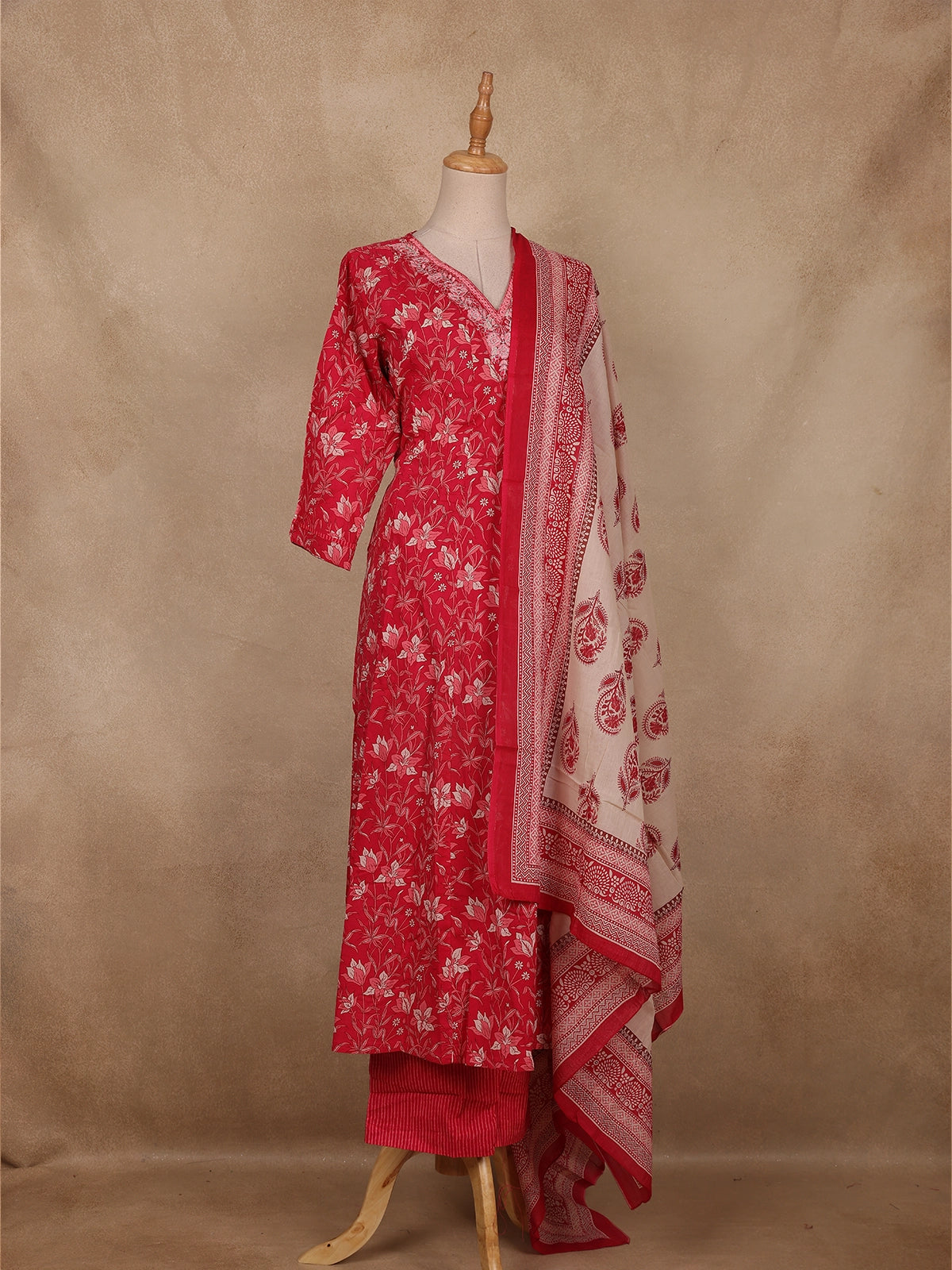 The Anarkali silhouette flatters every body type, flowing gracefully for a traditional yet contemporary look. Paired with matching solid red pants and a beige dupatta adorned with paisley block prints and intricate borders, the set exudes ethnic artistry and everyday sophistication.