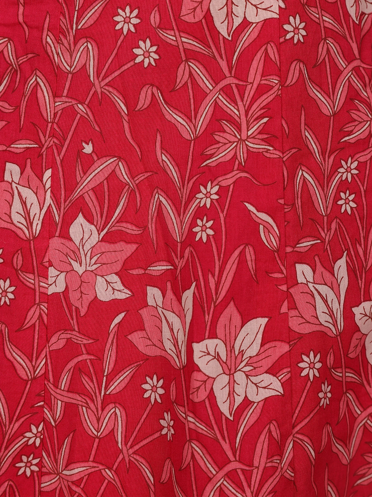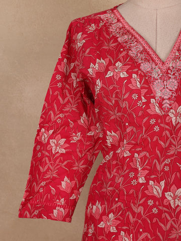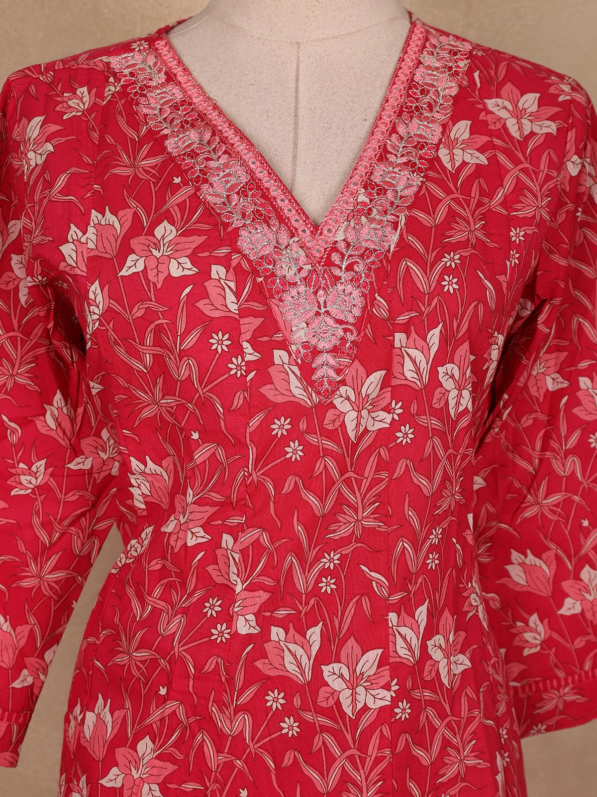 Step into effortless elegance with this Pink Floral Printed Cotton Anarkali Salwar Suit. Crafted from breathable cotton fabric, this ensemble blends comfort and charm, ideal for festive gatherings or casual celebrations. The kurta features delicate white floral prints spread gracefully across the vibrant red base, enhanced by lace embroidery around the V-neckline that adds a touch of femininity.