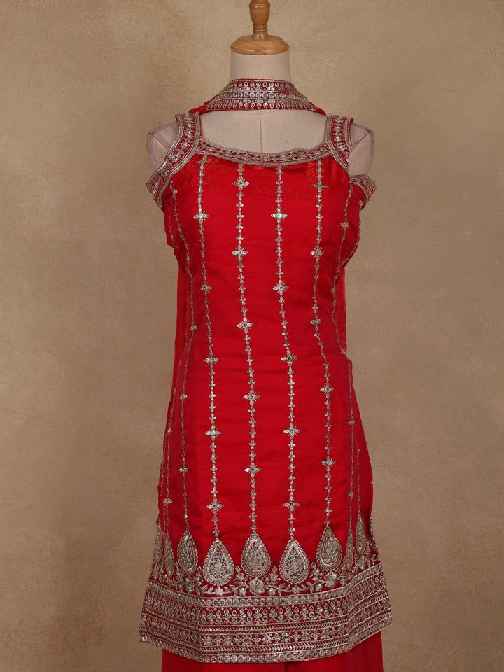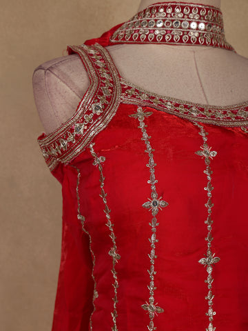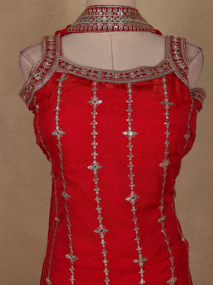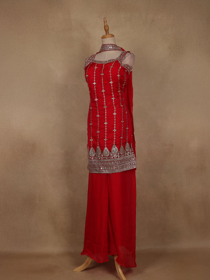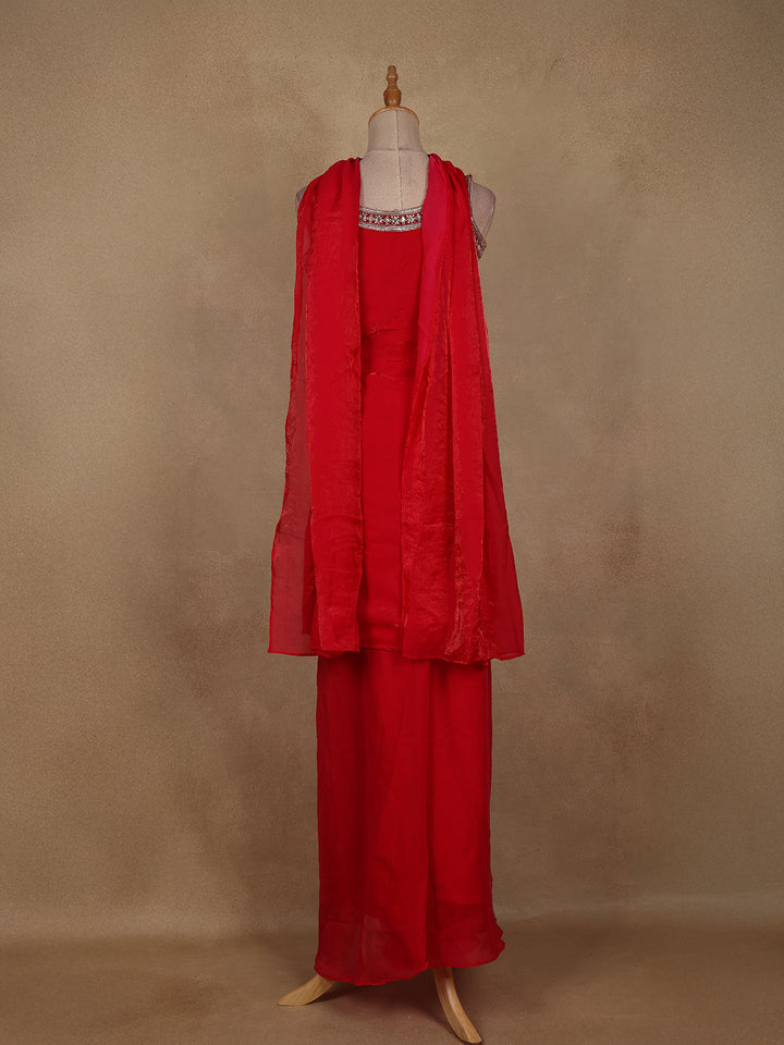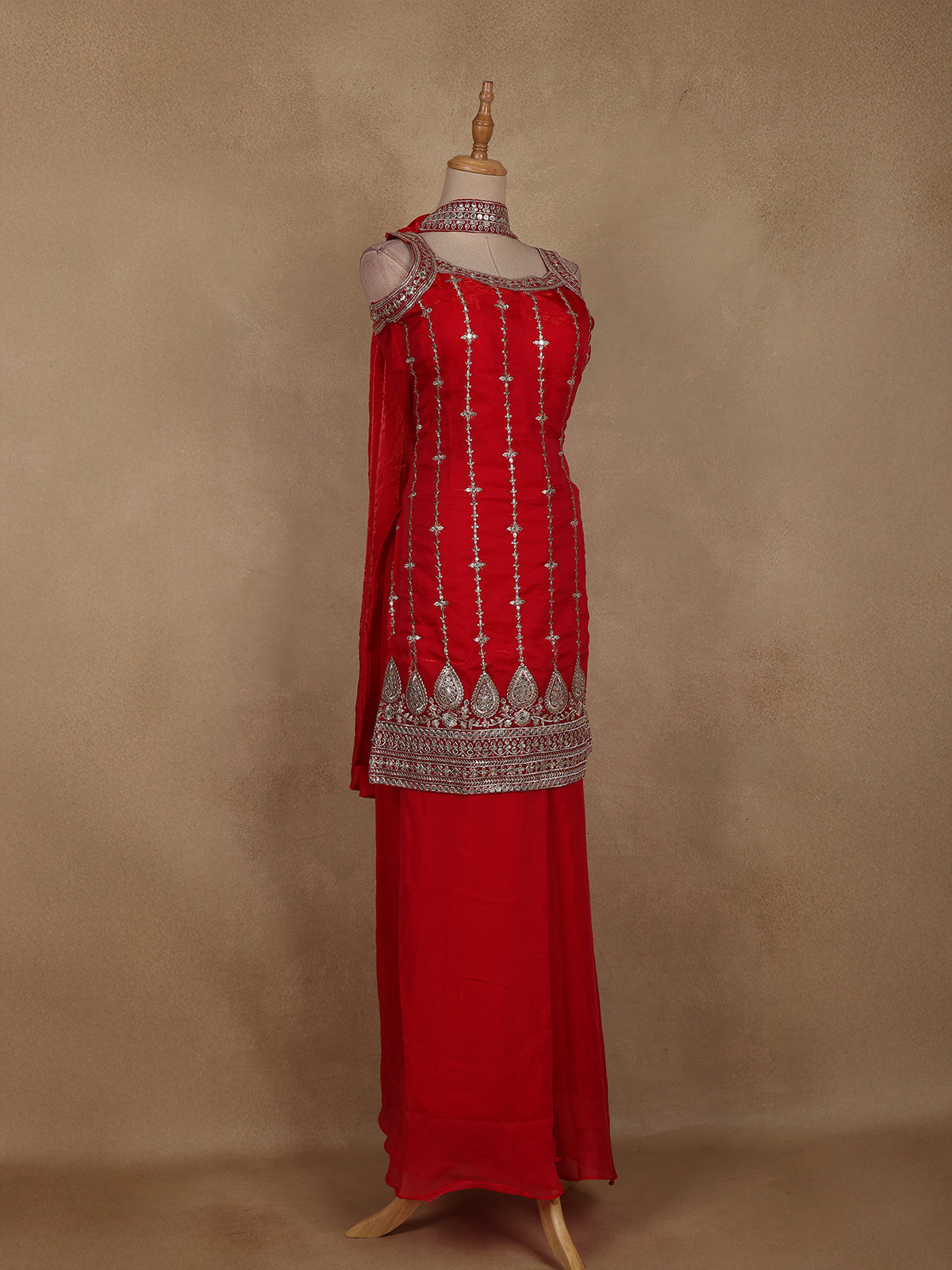 Designed with a square neckline and sleeveless silhouette, this palazzo suit strikes the perfect balance between tradition and contemporary style. The flared palazzo pants provide effortless comfort and movement, while the matching embroidered dupatta completes the ensemble with elegance and poise.