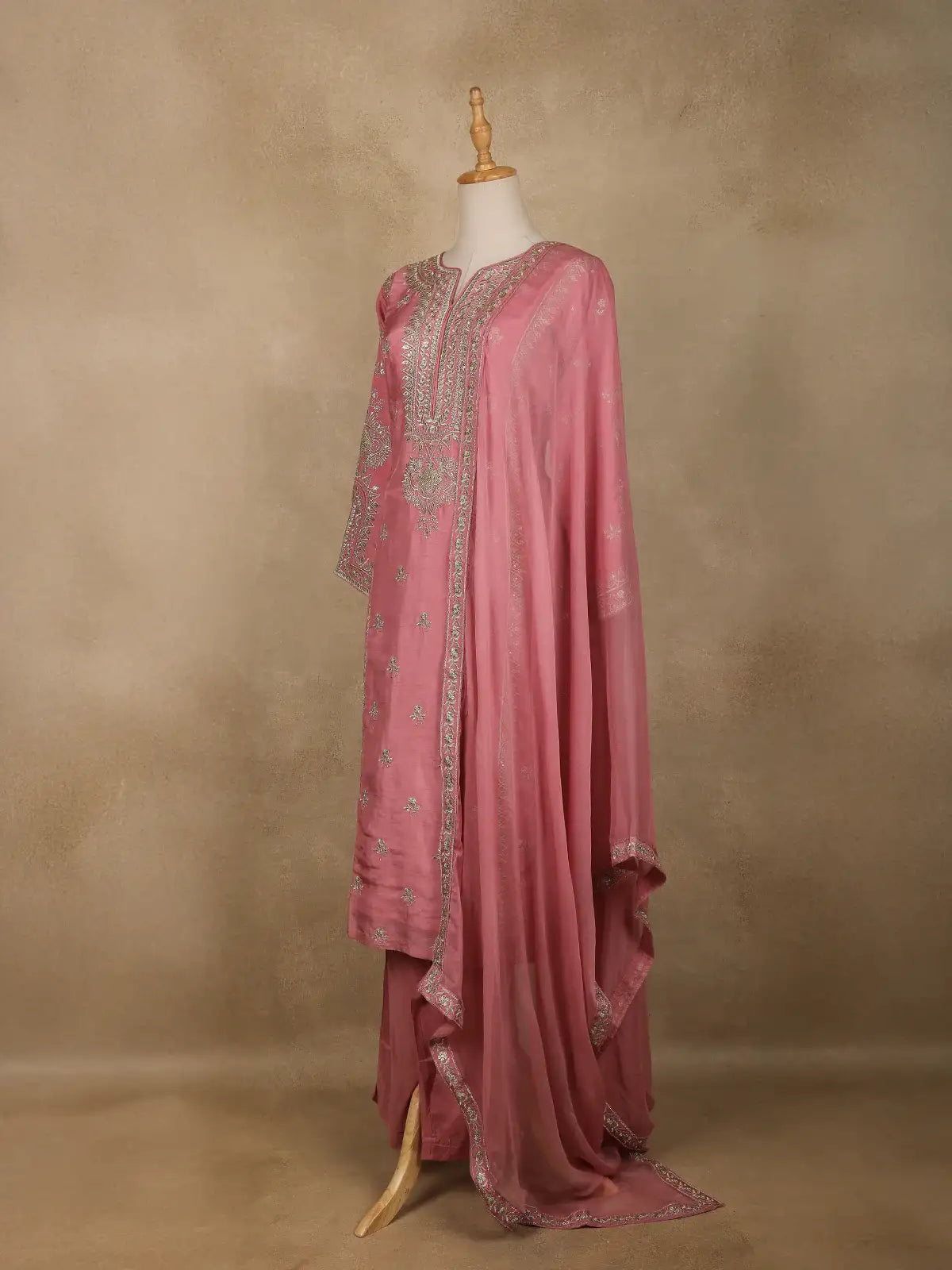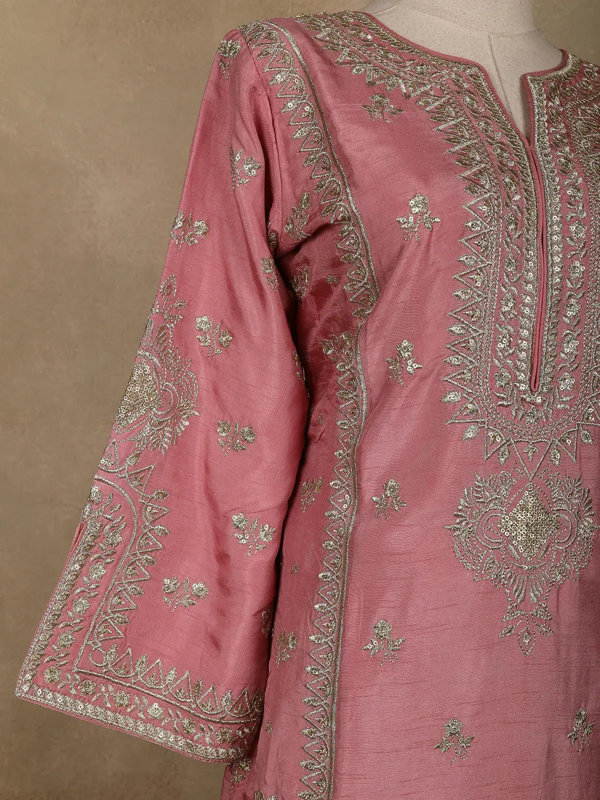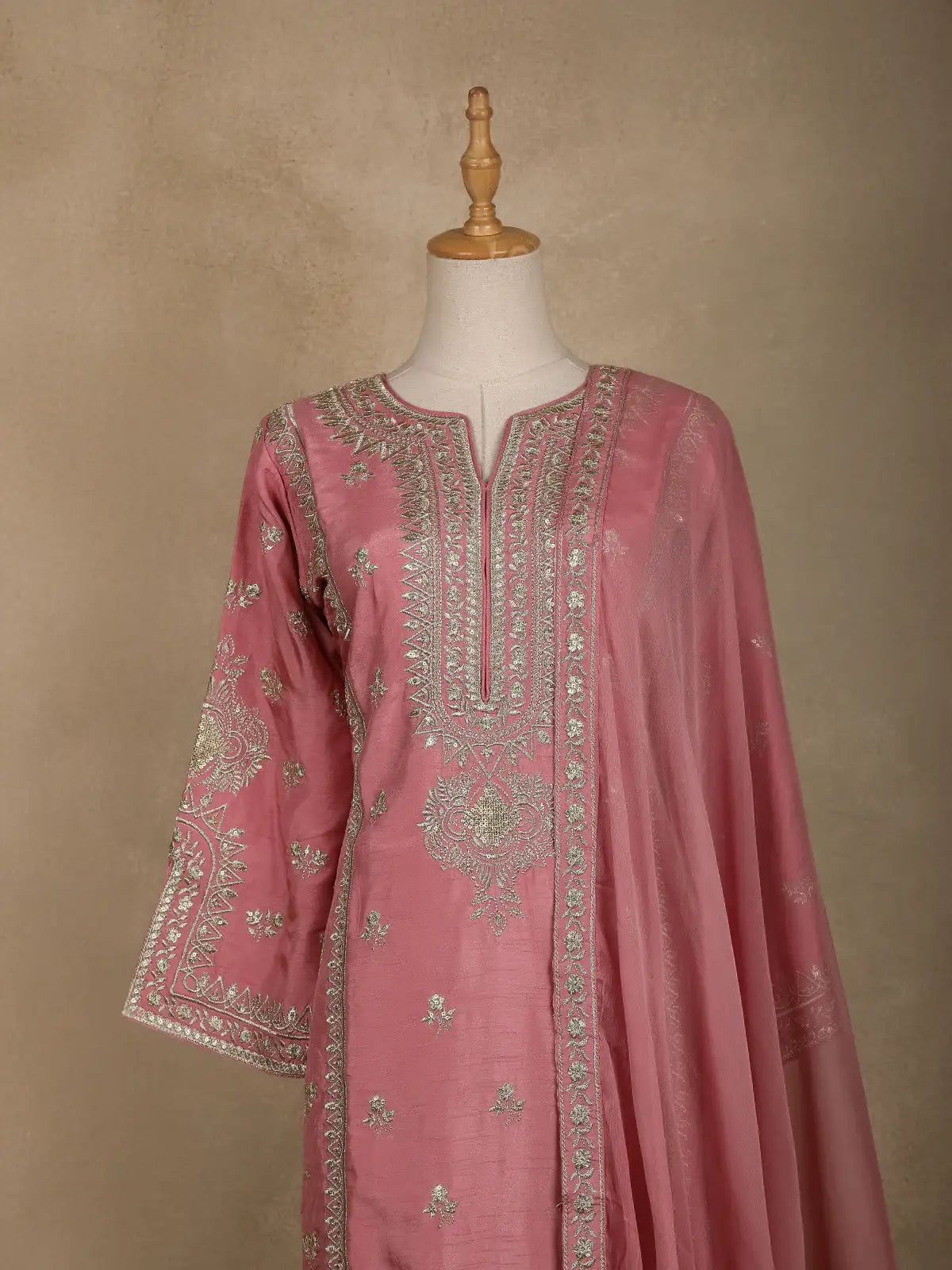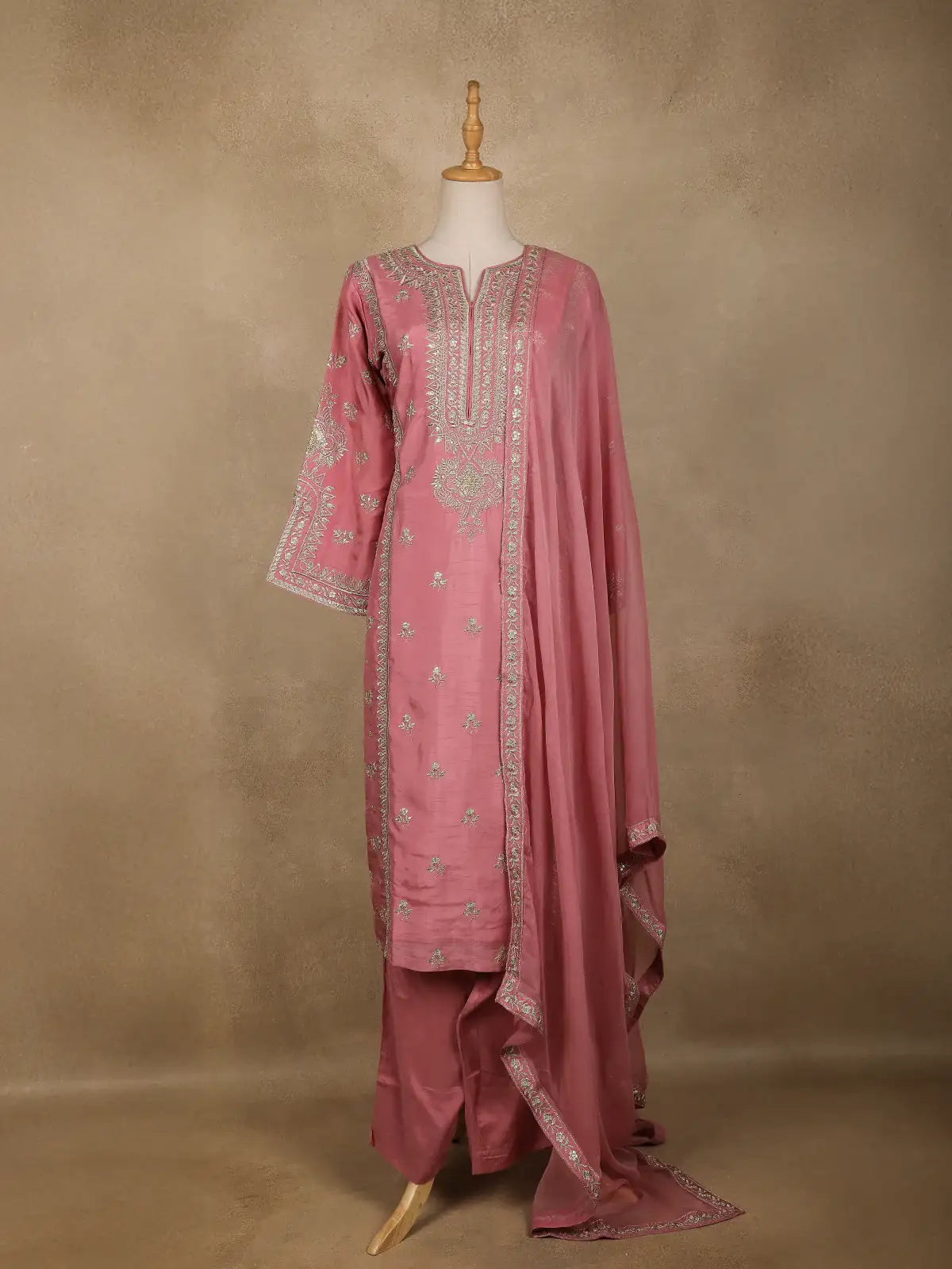 Graceful and vibrant, this Pink Floral Designed Semi Silk Salwar Suit brings together festive charm and feminine elegance. Crafted from smooth semi silk fabric, the straight-cut kurta features beautifully detailed floral embroidery work that enhances its rich pink hue.