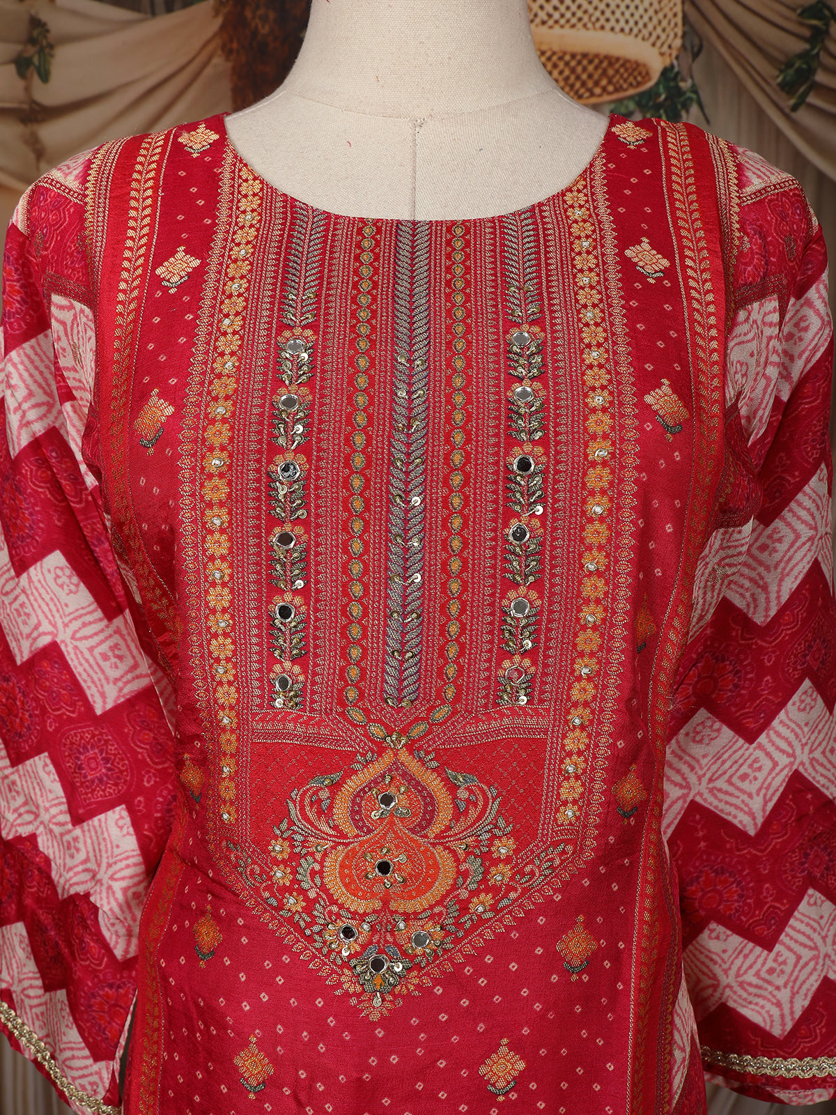 Step into timeless elegance with this Pink Floral Embroidered Banarasi Salwar Suit, a stunning blend of royal artistry and feminine grace. The straight-cut silhouette features intricate floral embroidery enhanced with golden zari accents, bringing out the rich Banarasi weave’s traditional charm.