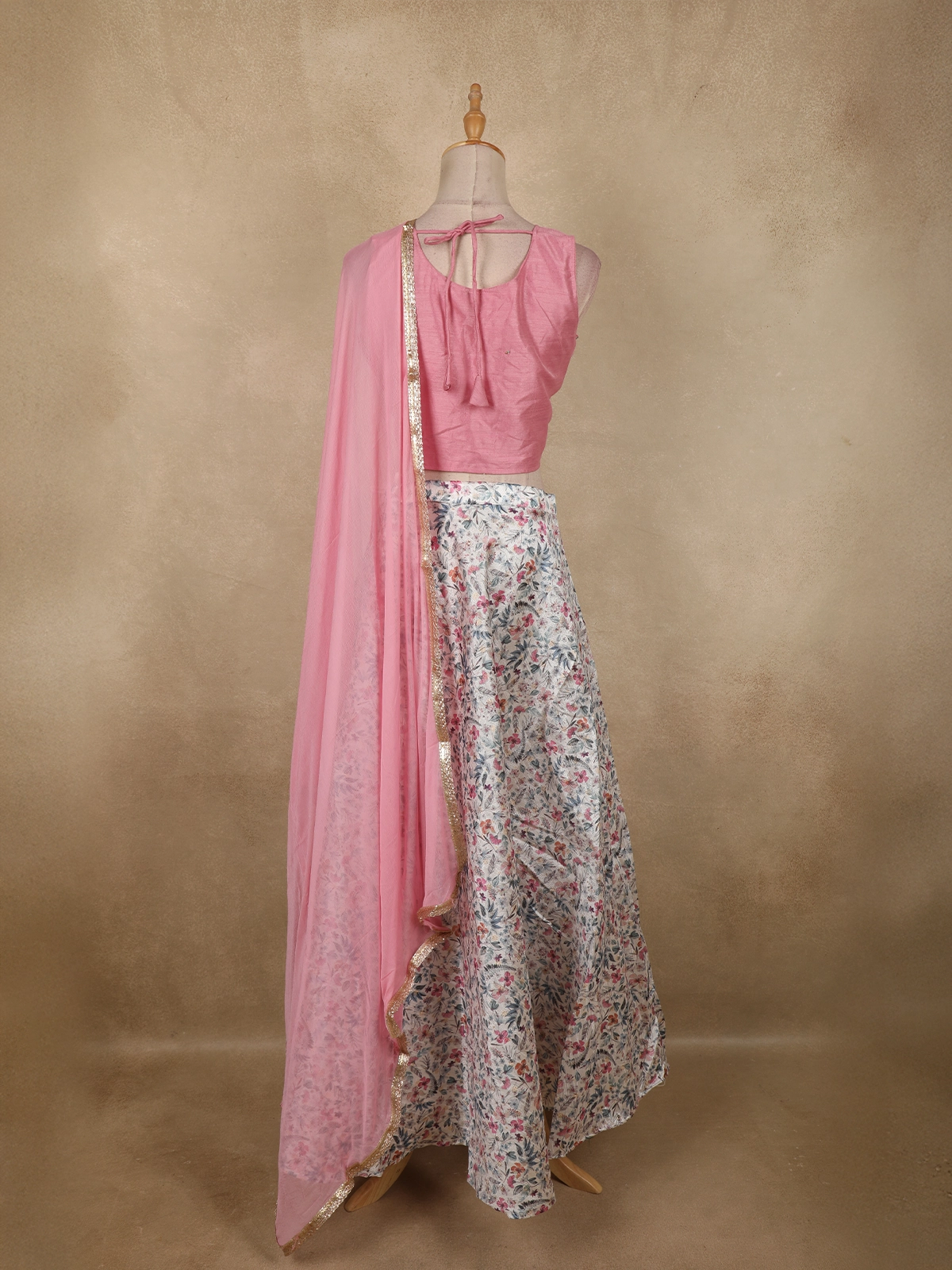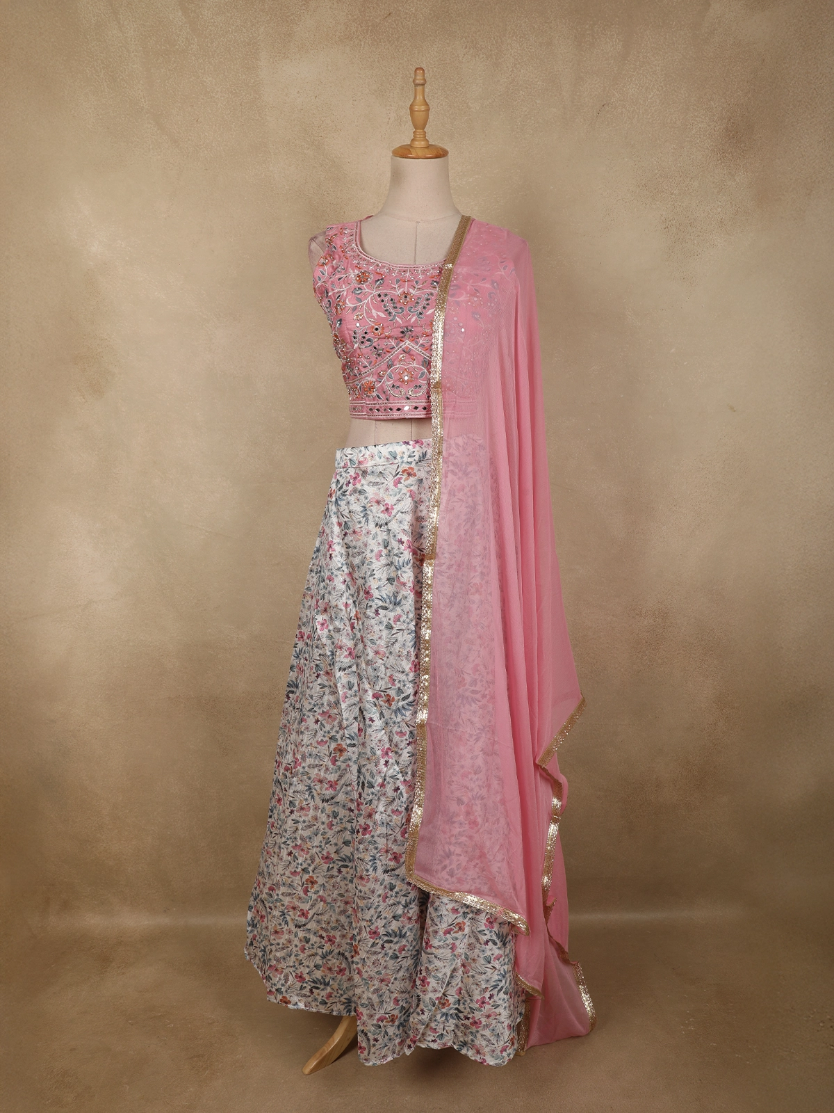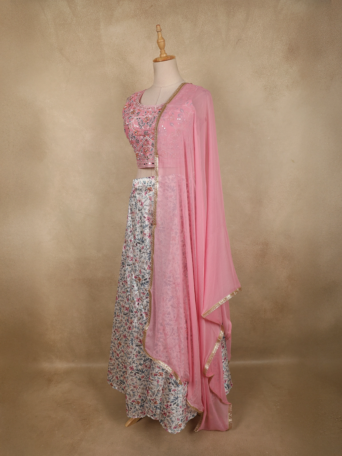 The ensemble is paired with a flowy lehenga skirt featuring an all-over floral printed design, lending a refreshing and graceful look. Completing the set is a matching sheer dupatta in pink, finished with a subtle embellished border that drapes effortlessly and adds a polished touch to the outfit.