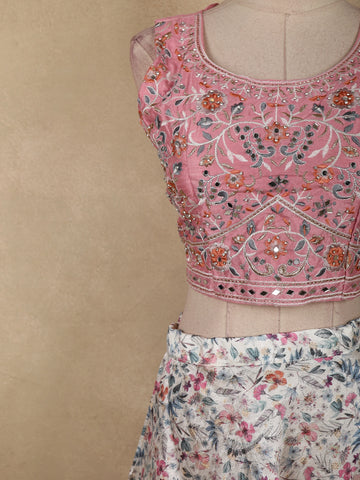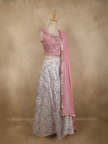 Pink Floral Embroidered Crop Top with Printed Lehenga and Dupatta
