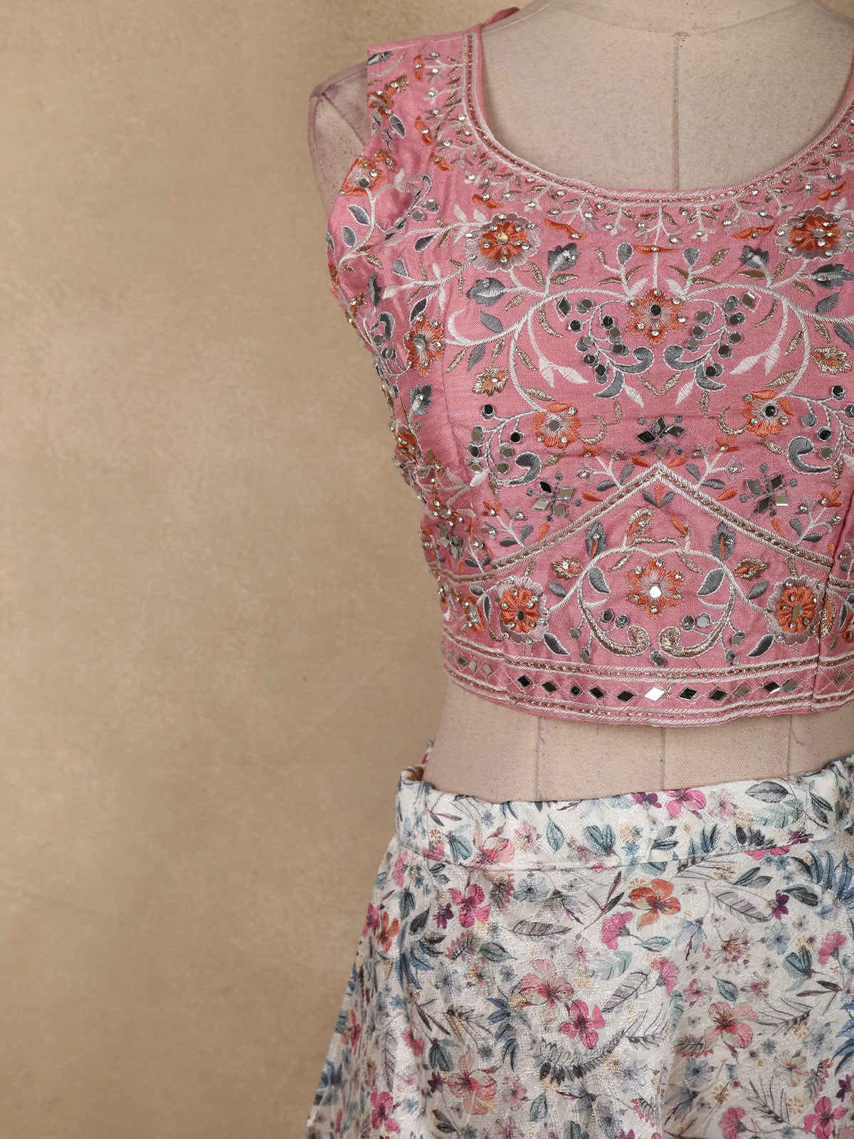 Add a touch of youthful elegance to your festive wardrobe with this charming pink lehenga set, designed with a perfect balance of embroidery and prints. The sleeveless crop top is beautifully adorned with intricate floral embroidery highlighted with delicate sequins and bead accents, creating a refined festive sparkle. The soft pink base enhances the feminine appeal while the detailed craftsmanship adds a luxurious finish.