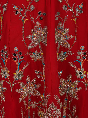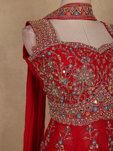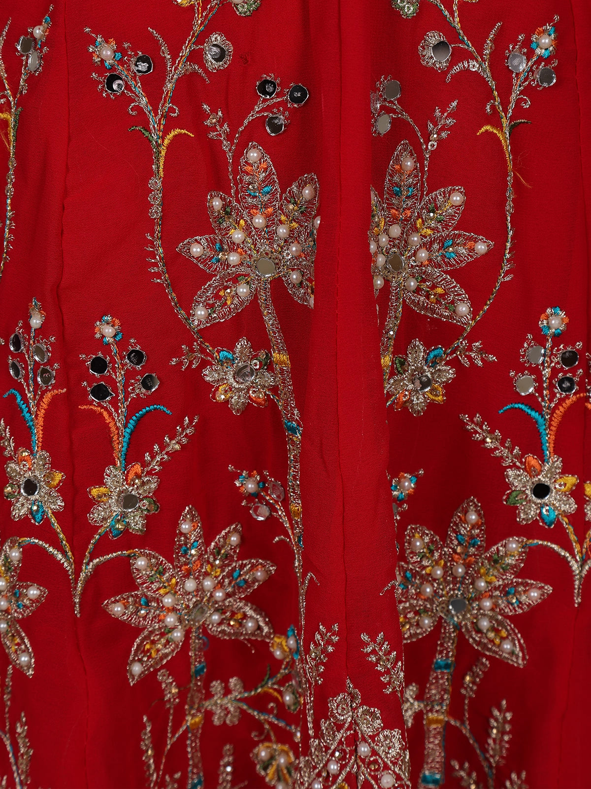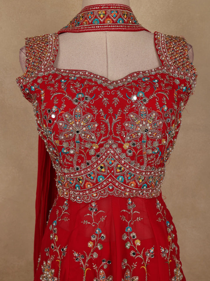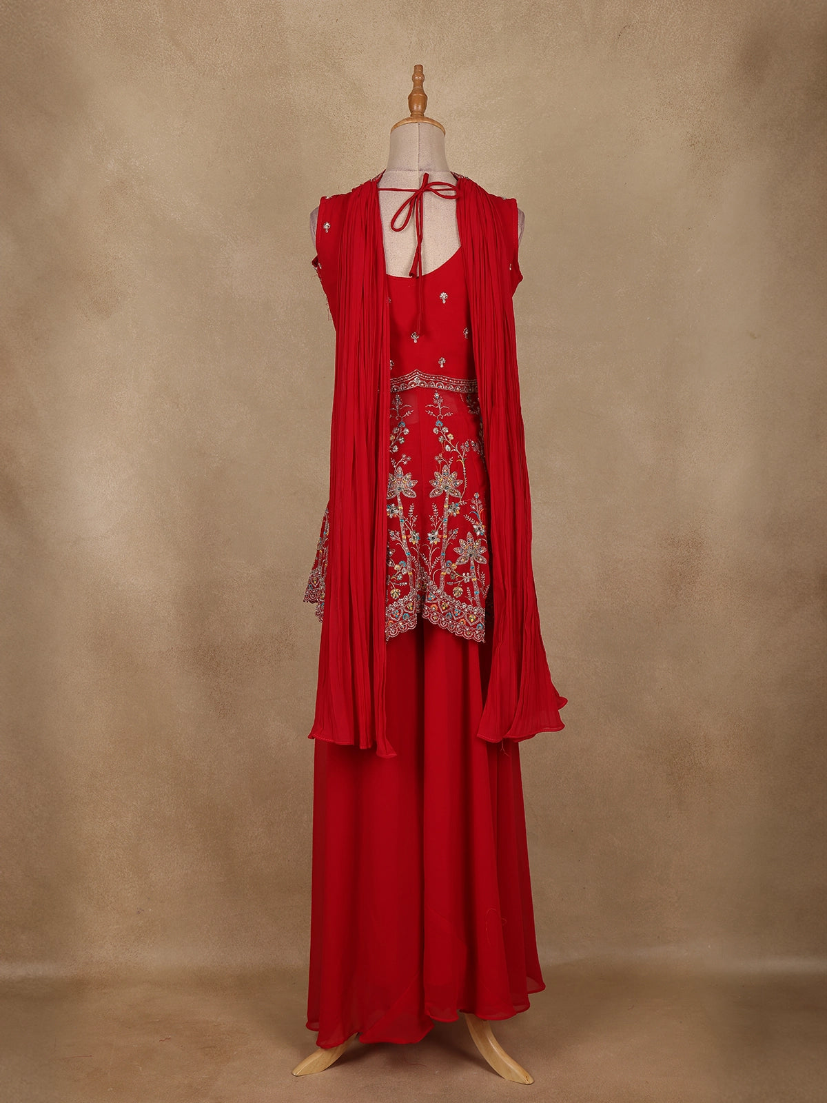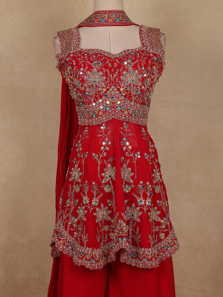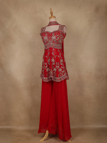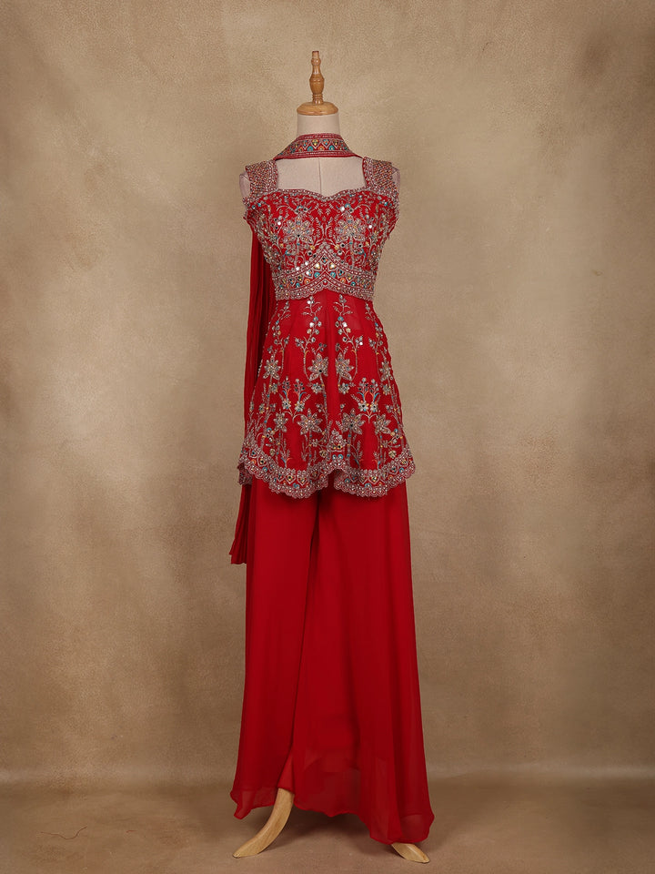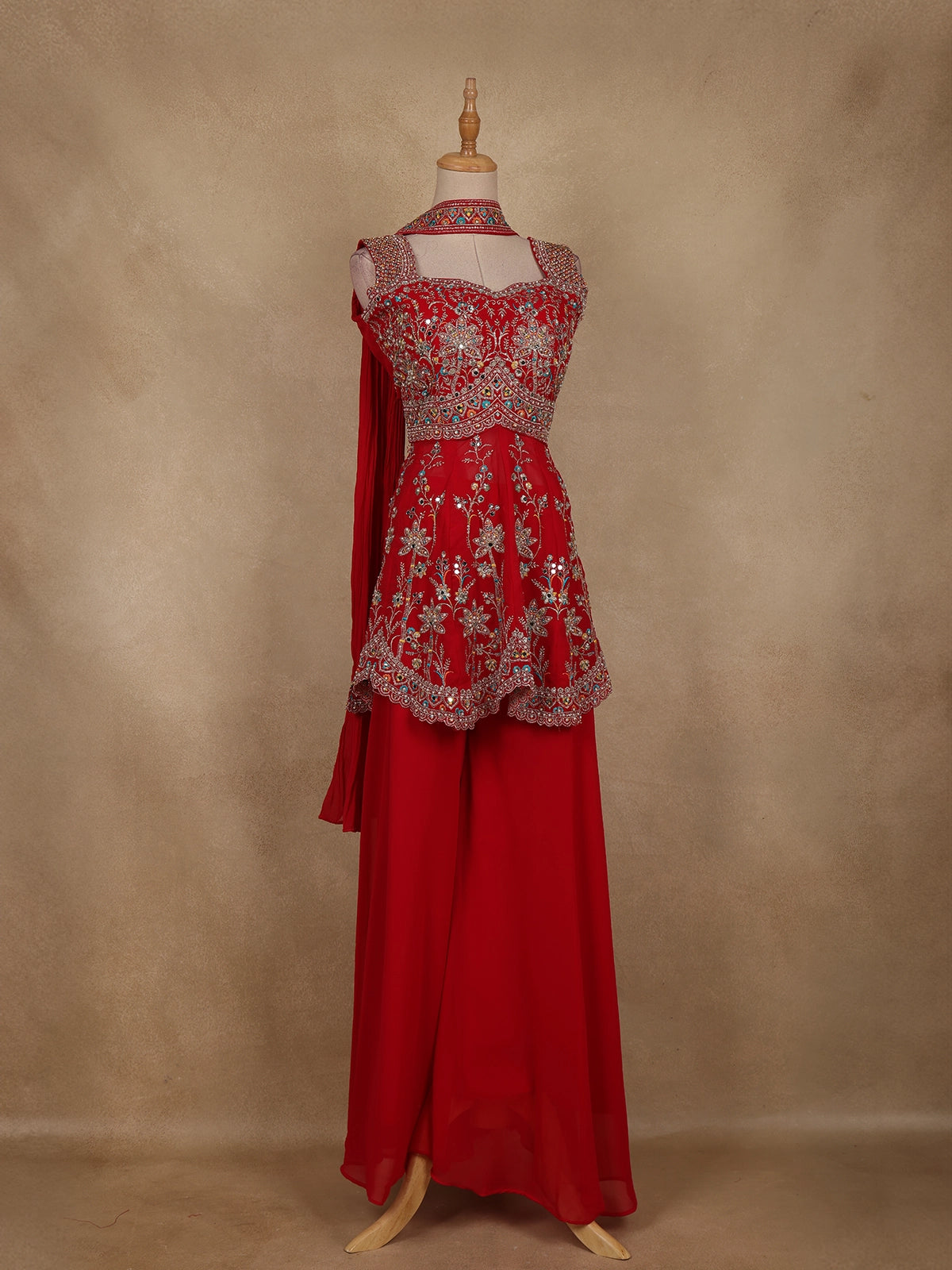 This exquisite Pink Georgette Palazzo Suit is a stunning ensemble that radiates regal charm. The short kurti is intricately adorned with rich floral embroidery, zari, sequins, mirrors, and beads, creating a dazzling display of craftsmanship. The sweetheart neckline is accentuated with an embroidered collar, adding a statement touch to the silhouette. The flowy palazzo pants in matching red offer graceful movement and comfort, while the sleeveless cut and sheer dupatta enhance the contemporary elegance of the look. Perfect for festive occasions, weddings, and grand celebrations, this outfit embodies timeless allure and festive grandeur.