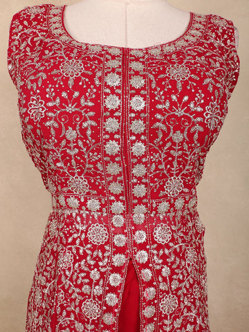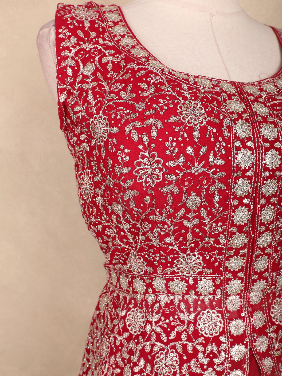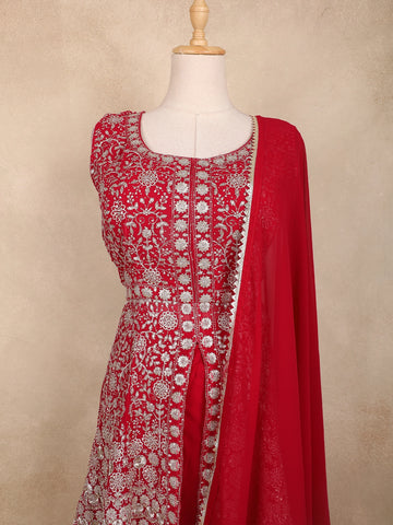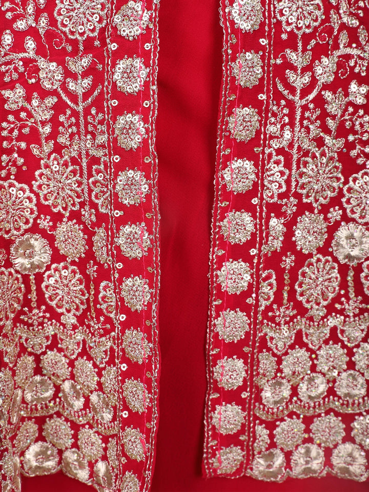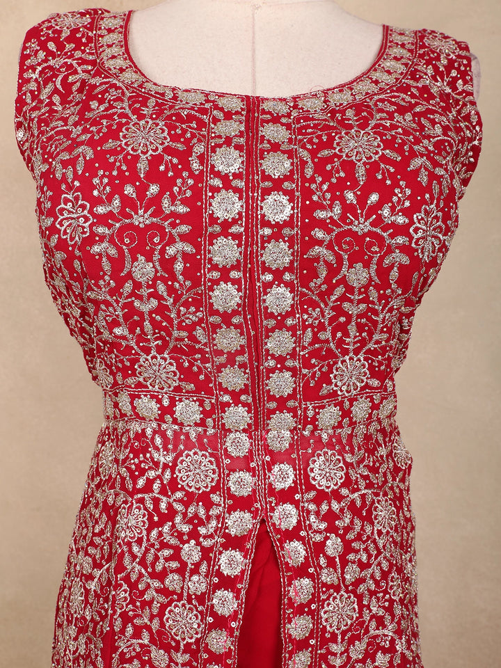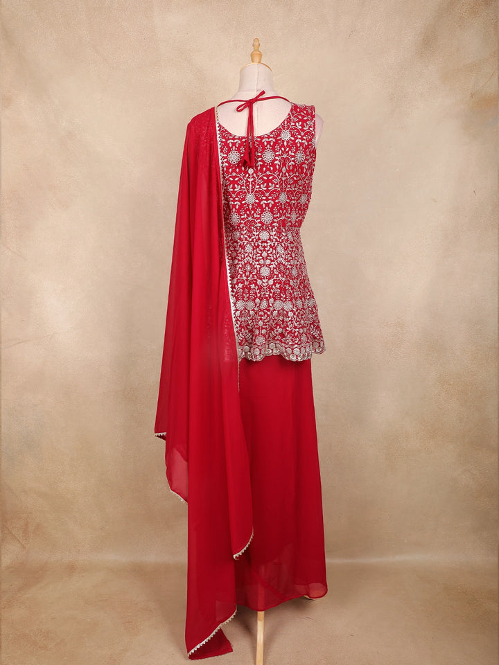 The flowy georgette palazzo pants add a touch of comfort and charm, while the matching dupatta with an embroidered edge completes the ensemble, adding fluid movement and grace. Perfect for festive occasions, receptions, or evening celebrations, this outfit radiates feminine allure and timeless style.
