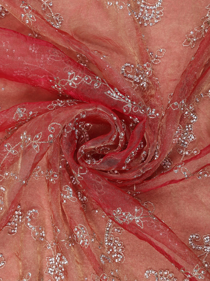 Grace your special occasions with the ethereal charm of this Pink Floral Embroidered Tissue Organza Saree. Crafted from a luxurious blend of tissue and organza, this saree drapes delicately, exuding a sheer and lustrous finish. The body is beautifully adorned with floral thread embroidery highlighted by shimmering sequins, giving it a radiant, festive appeal.