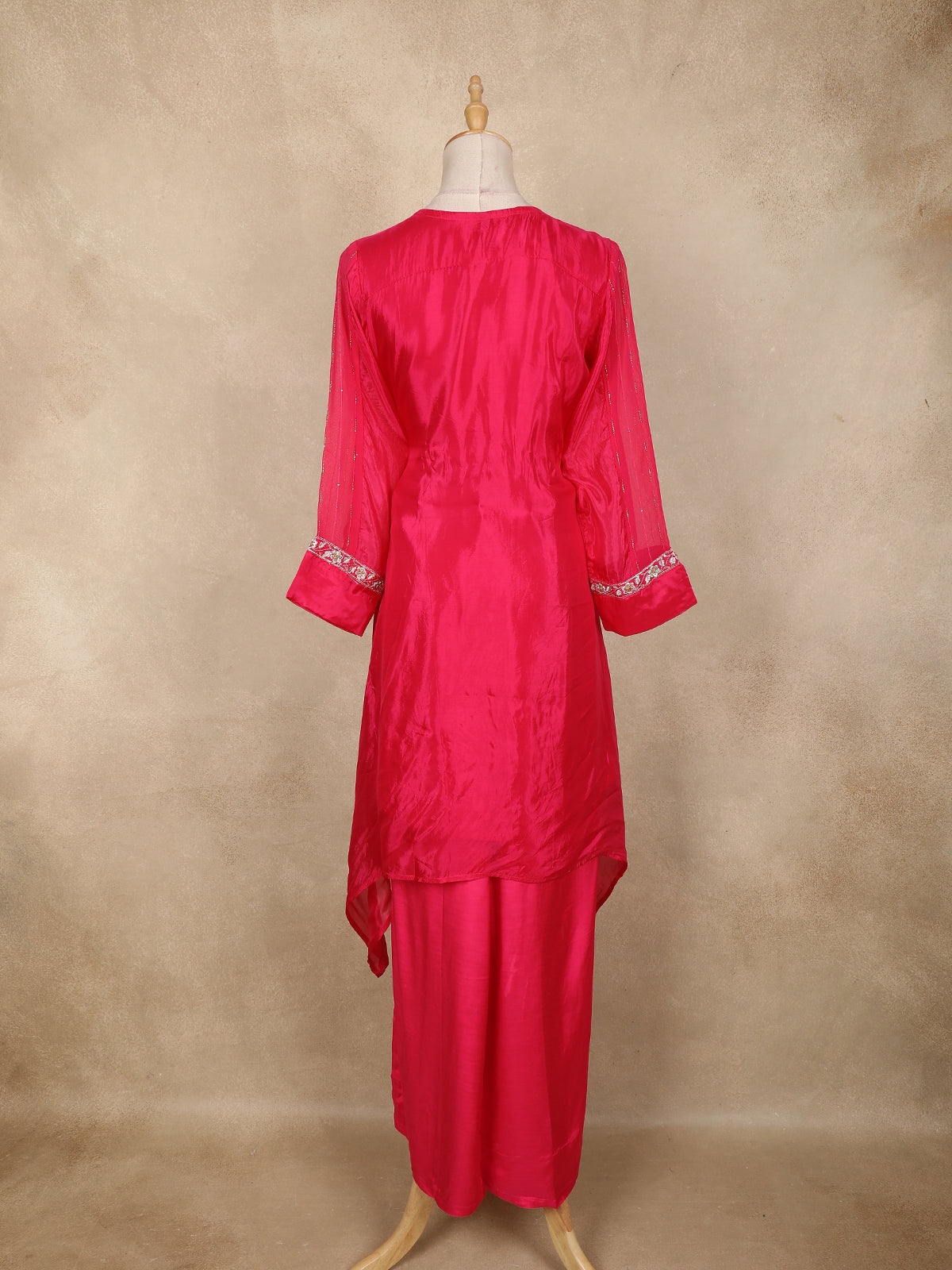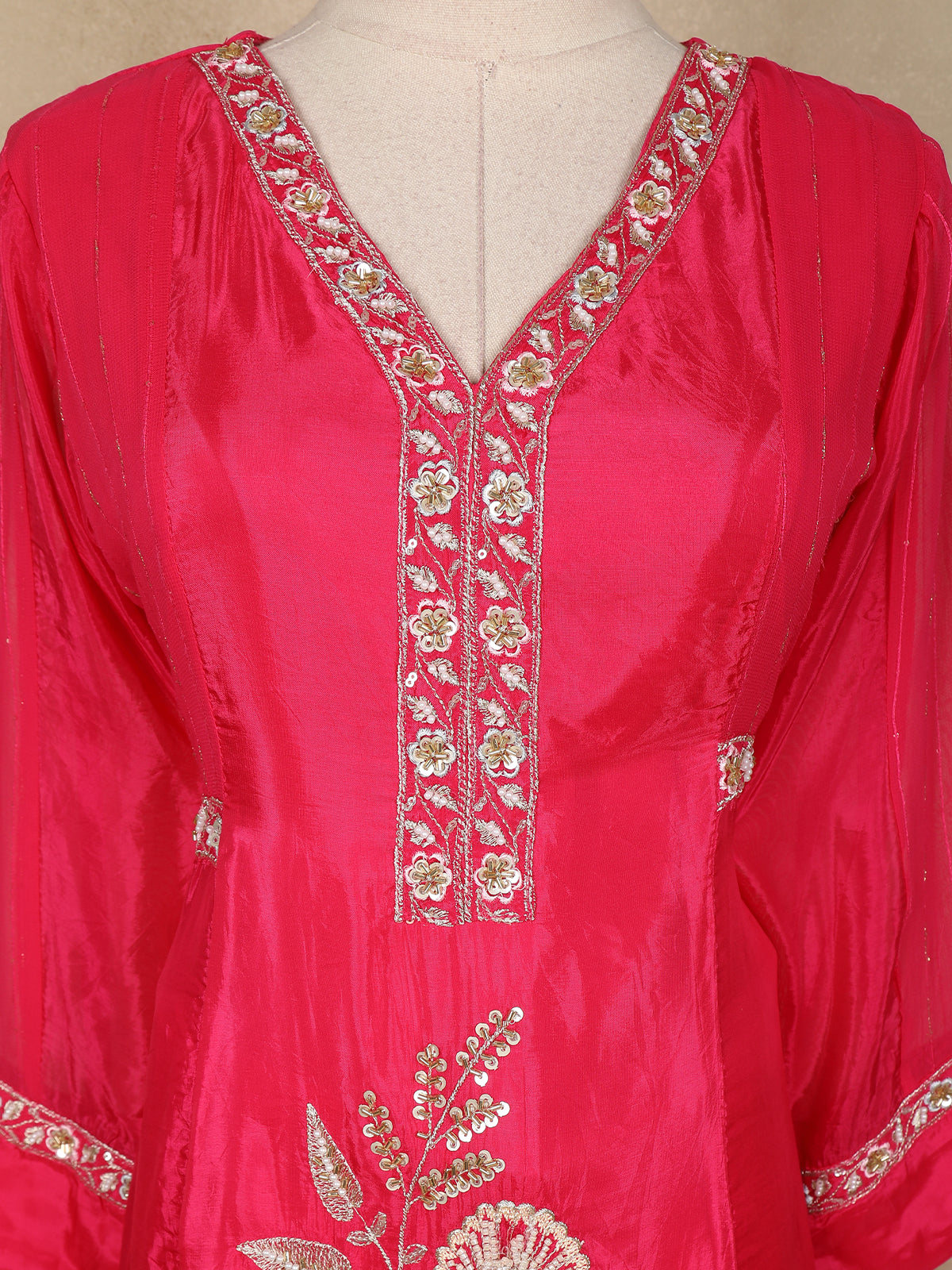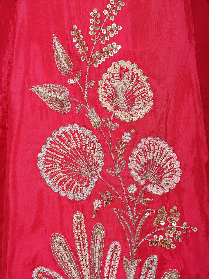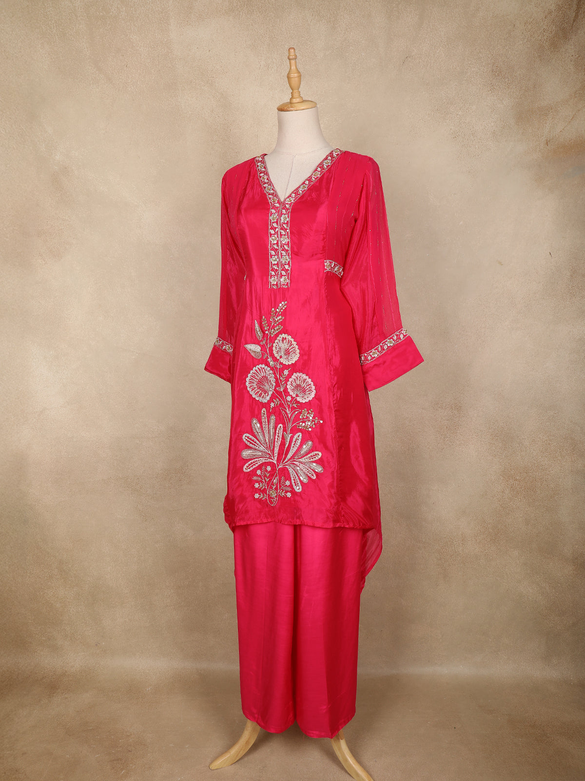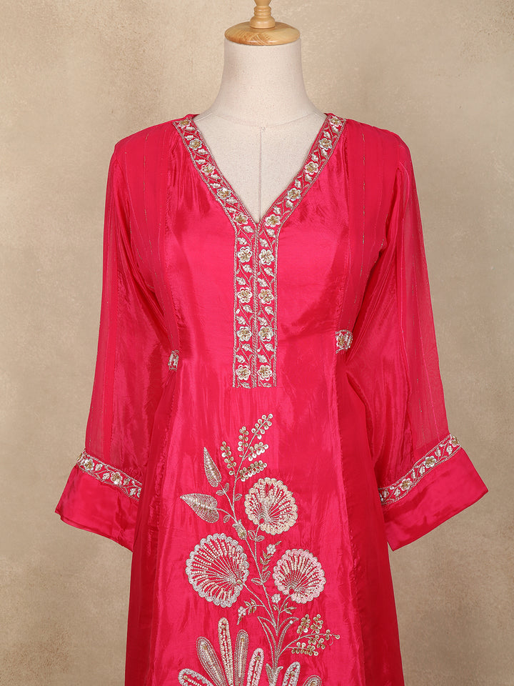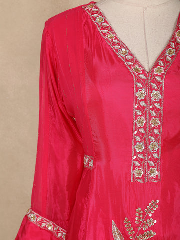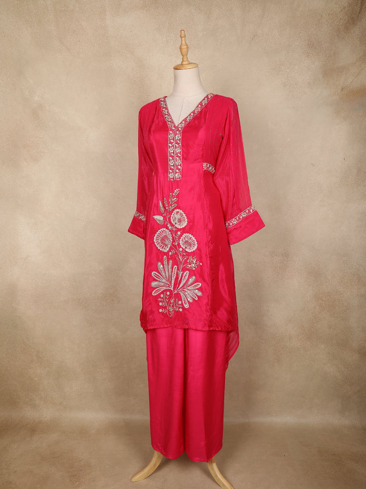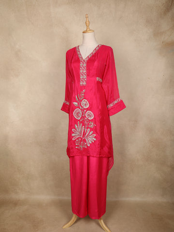 Radiate festive charm with this stunning pink palazzo suit crafted from premium tissue silk. The lustrous shine of the fabric enhances the vibrant color, while the intricate floral embroidery on the kurti adds a luxurious statement finish. The elegant V-neckline and delicately embellished sleeve borders bring a refined edge to the ensemble. Paired with matching palazzo pants, this outfit offers both style and comfort, making it a perfect pick for celebrations, parties, and special occasions.