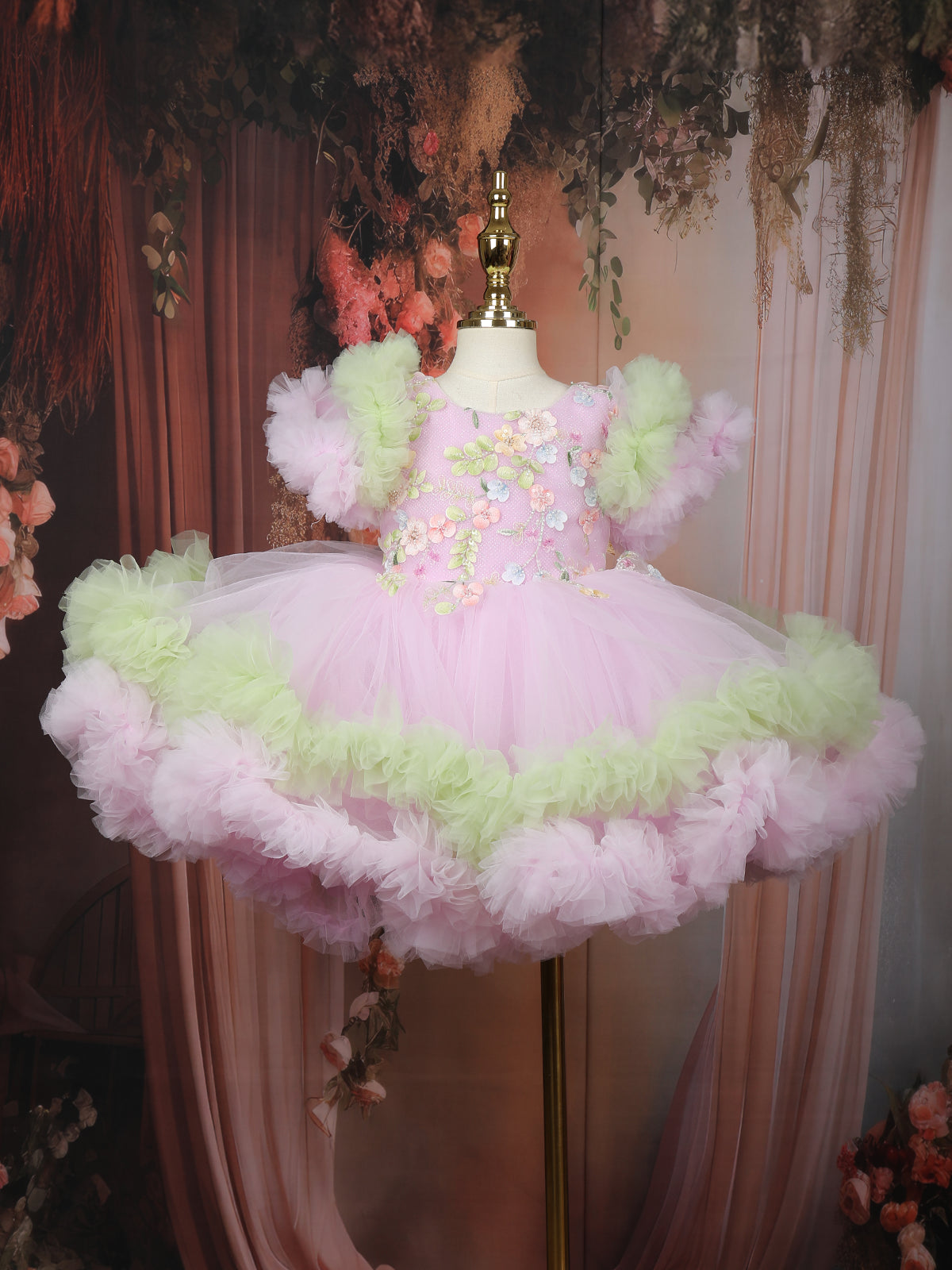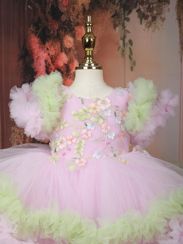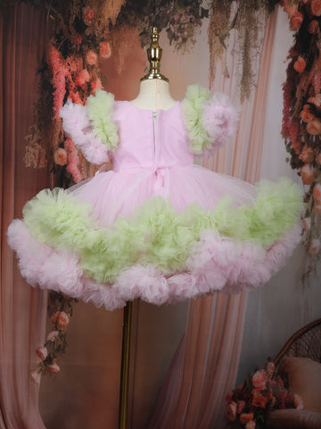 The round neckline and adorable puff sleeves enhance its girlish charm, while the multi-layered tulle skirt creates a voluminous, dreamy silhouette perfect for twirling. The hemline is trimmed with soft pink and mint green ruffles, adding a playful contrast and fluffy texture that makes this frock stand out beautifully.