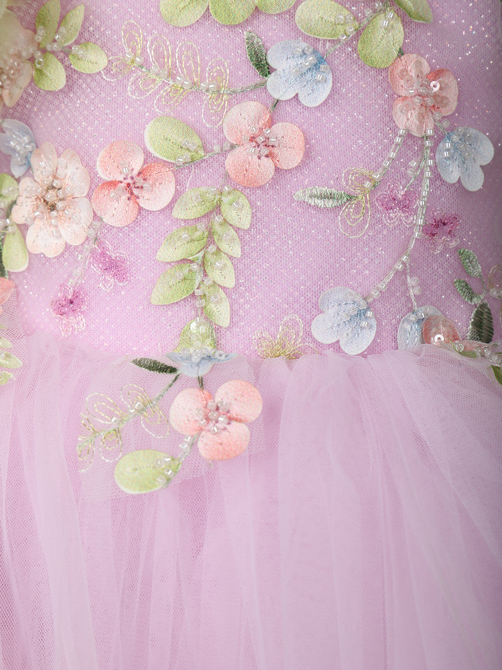 Pink Floral Embroidery Design Net Ruffle Party Frock