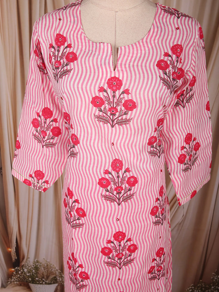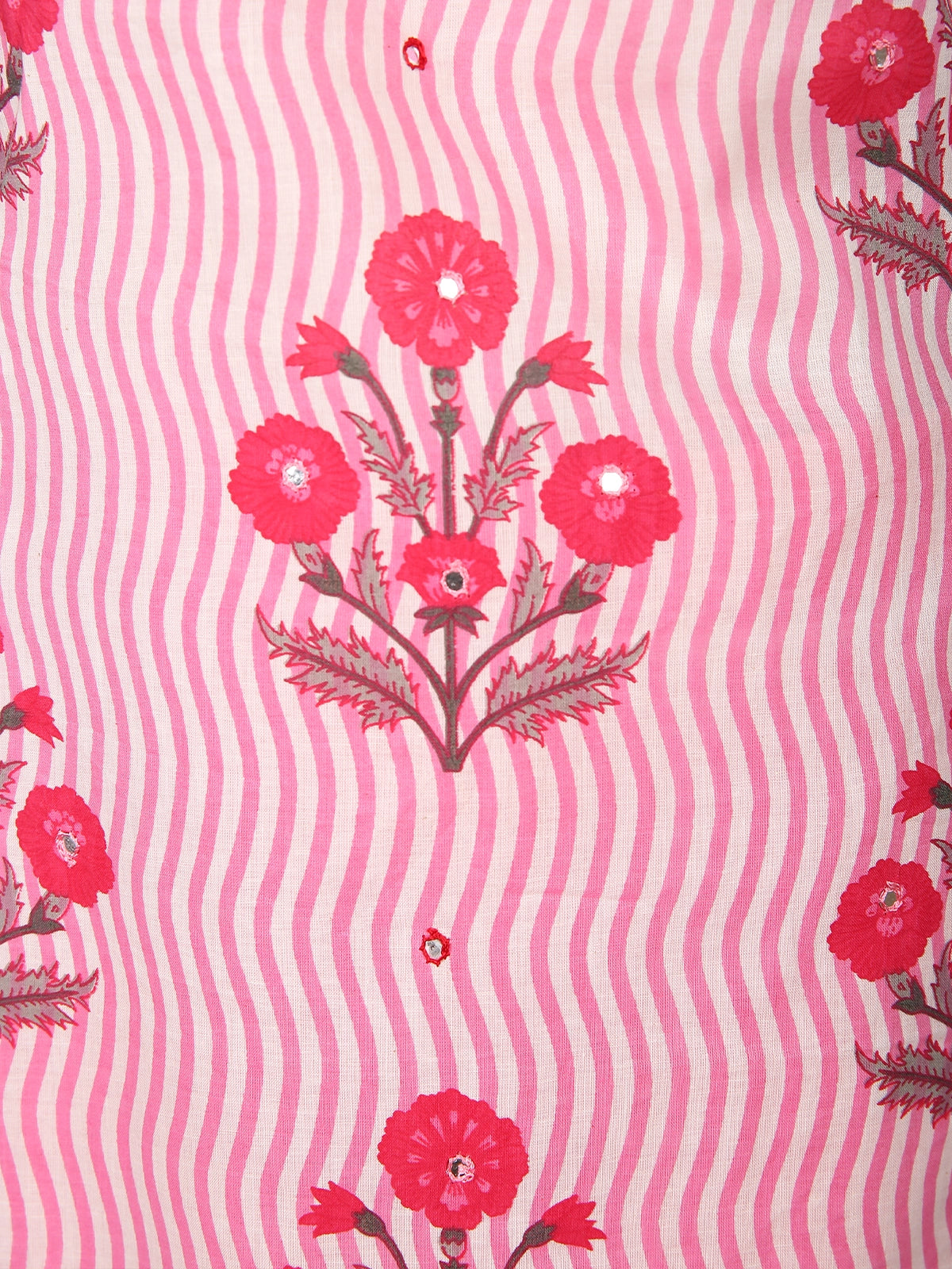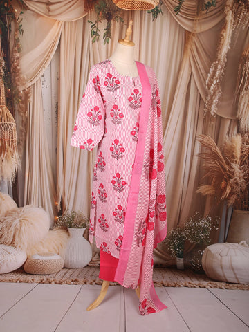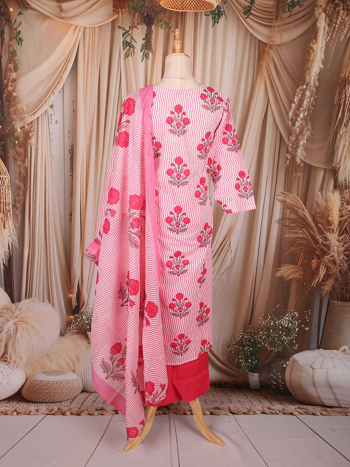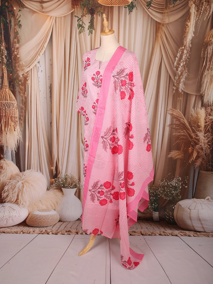 Add a refreshing touch to your ethnic wardrobe with this pink floral printed cotton salwar suit. The kurta features vibrant floral motifs in shades of red and pink beautifully arranged over a striped base, creating a balance of tradition and modern charm. Designed with a notched round neckline and three-quarter sleeves, it offers both elegance and comfort. The matching dupatta with coordinating floral prints and solid contrast pants complete the look, making it perfect for casual gatherings, workwear, or daytime festivities.