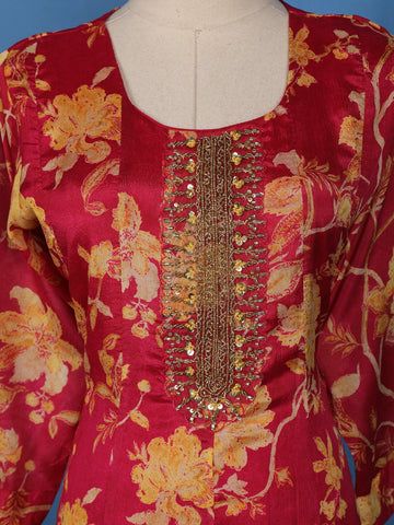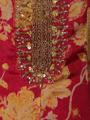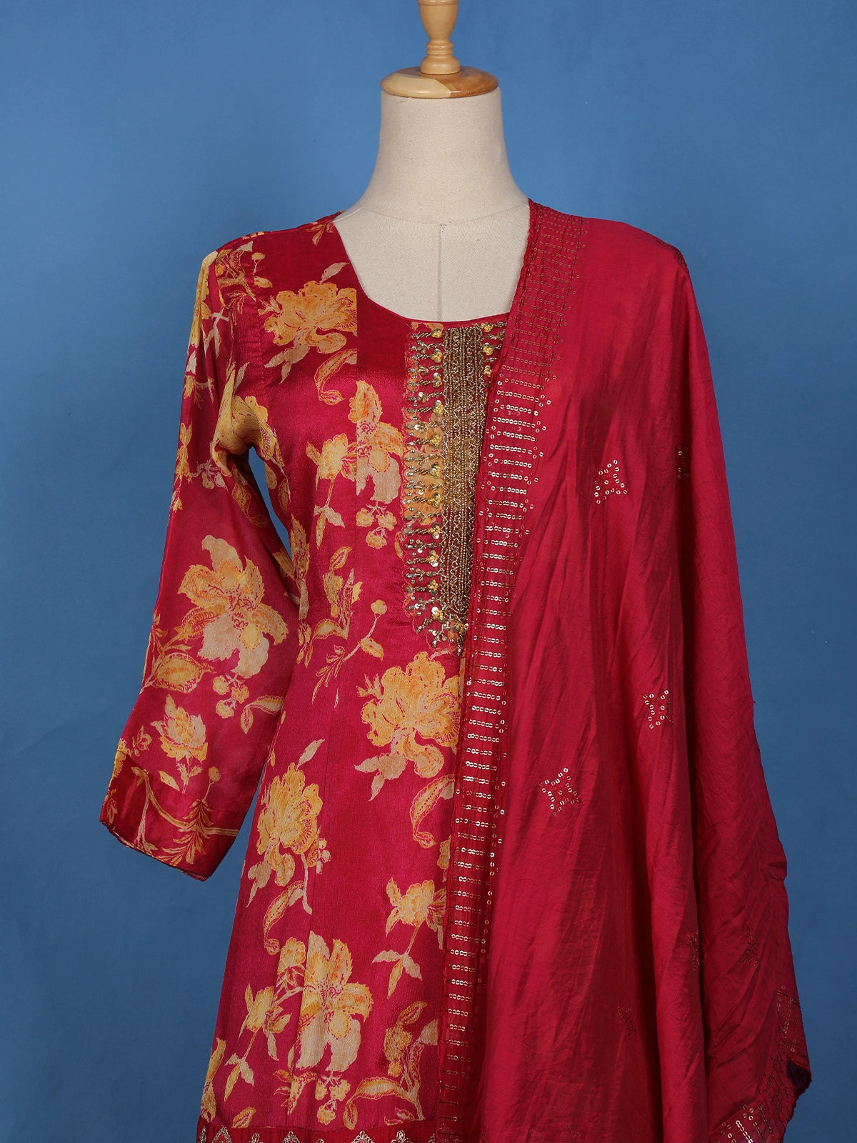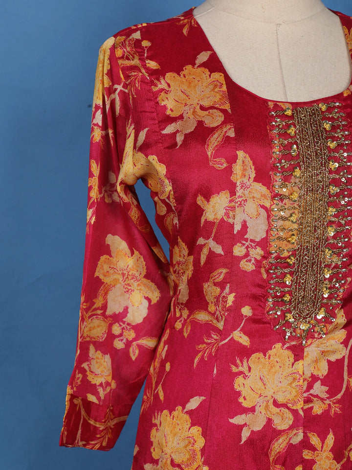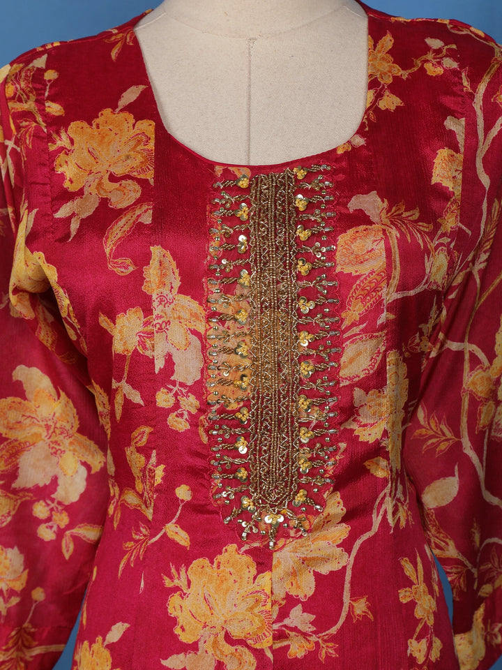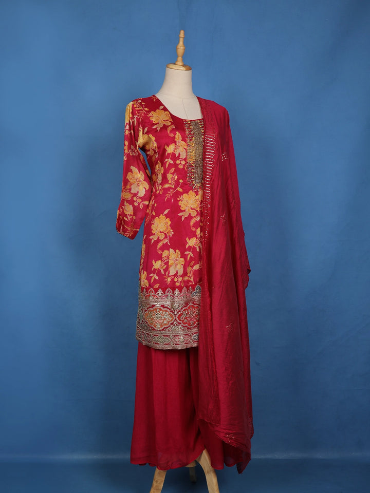 Grace your day with this charming Pink Floral Printed Crepe Palazzo Suit, designed to bring out effortless elegance with every step. The kurta showcases soft floral prints that bloom across a breezy crepe fabric, lending a feminine touch and fluid drape. Its round neckline and 3/4 sleeves make it perfect for both casual gatherings and semi-formal occasions.