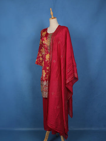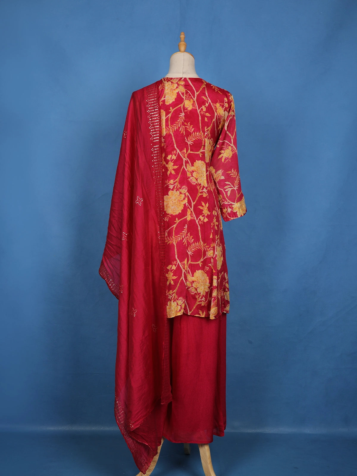 Paired with a matching flowy palazzo and a lightweight printed dupatta, this ensemble captures a blend of comfort and contemporary chic. The crepe fabric ensures easy movement and a flattering silhouette — ideal for brunches, daytime events, or festive get-togethers.