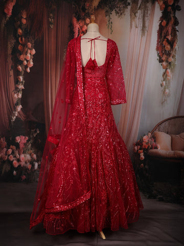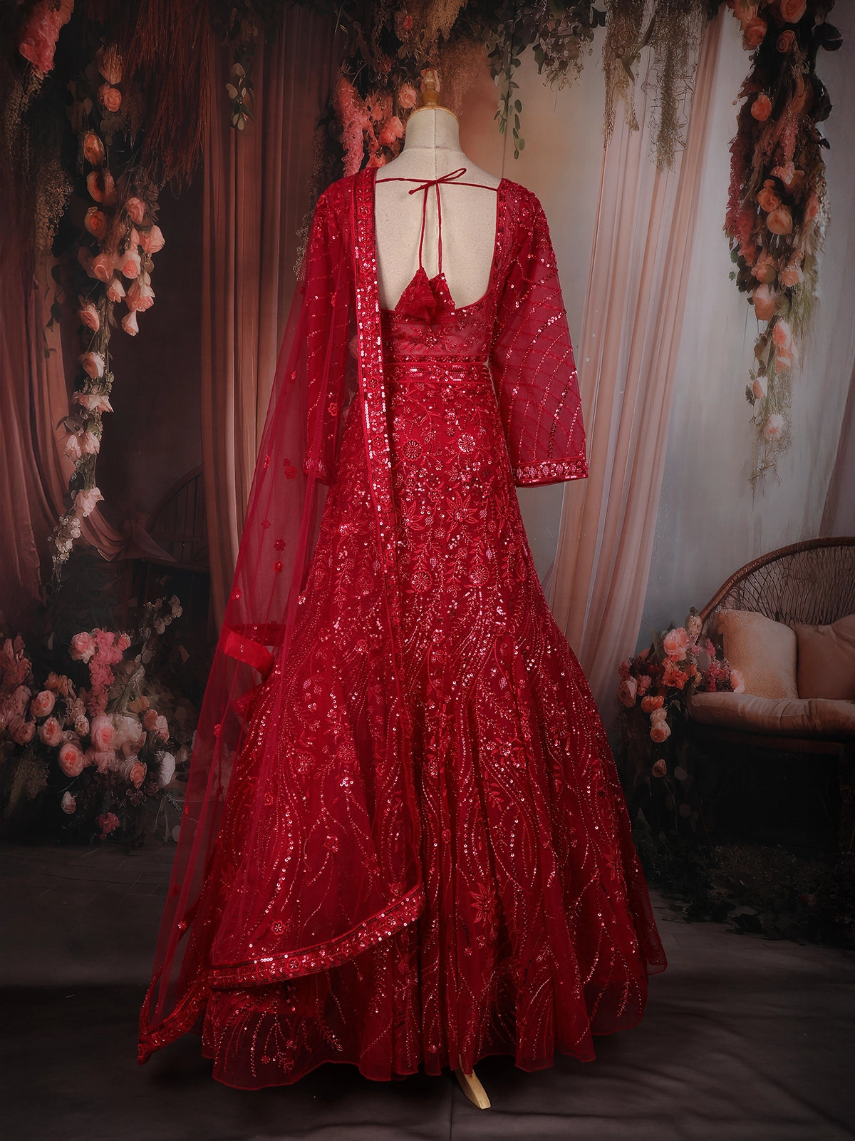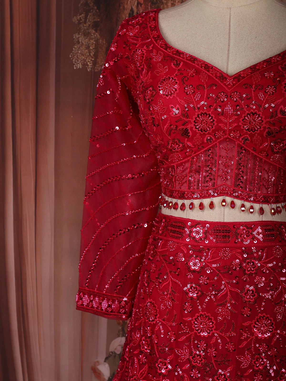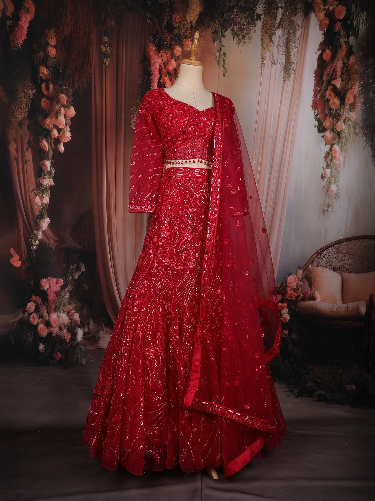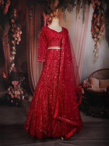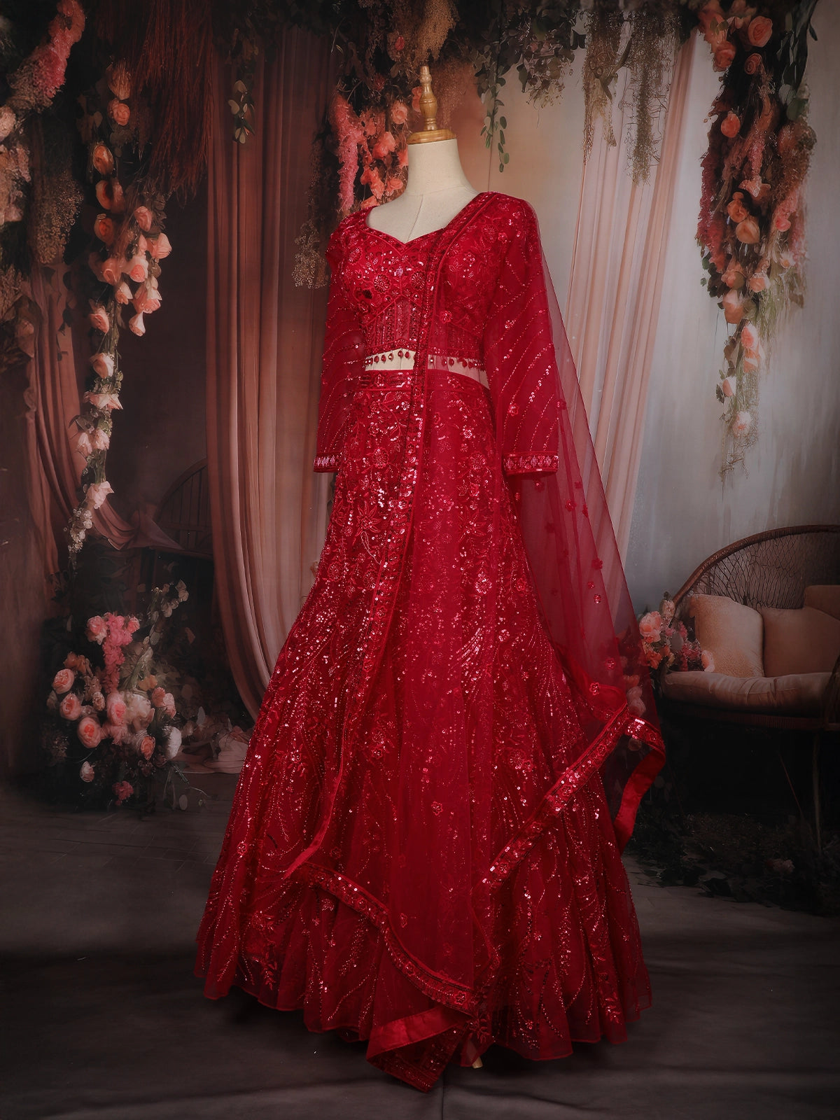 The net lehenga skirt showcases all-over floral embroidery with sequins that sparkle gracefully with every movement, offering a rich flare and festive presence. Paired with a matching net dupatta, highlighted with embroidered motifs and a neat border, this set completes a perfectly balanced traditional look.
