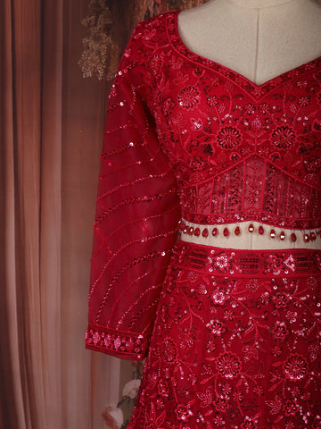 Pink Floral Sequins and Beads Embroidered Net Lehenga Set with Dupatta