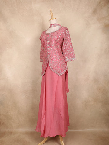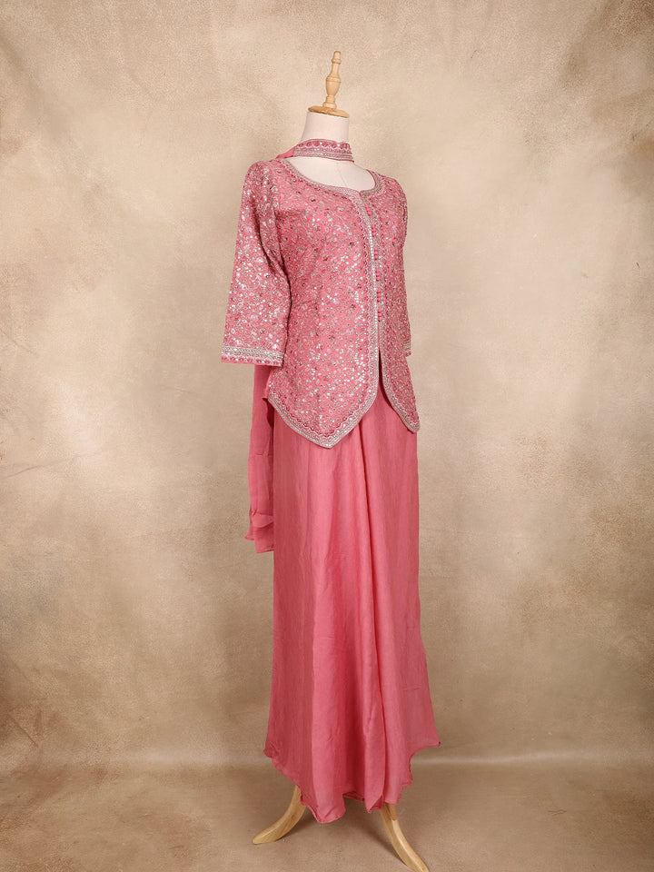 Pink Floral Sequins Embroidered Georgette Peplum Palazzo Suit with Choker Dupatta