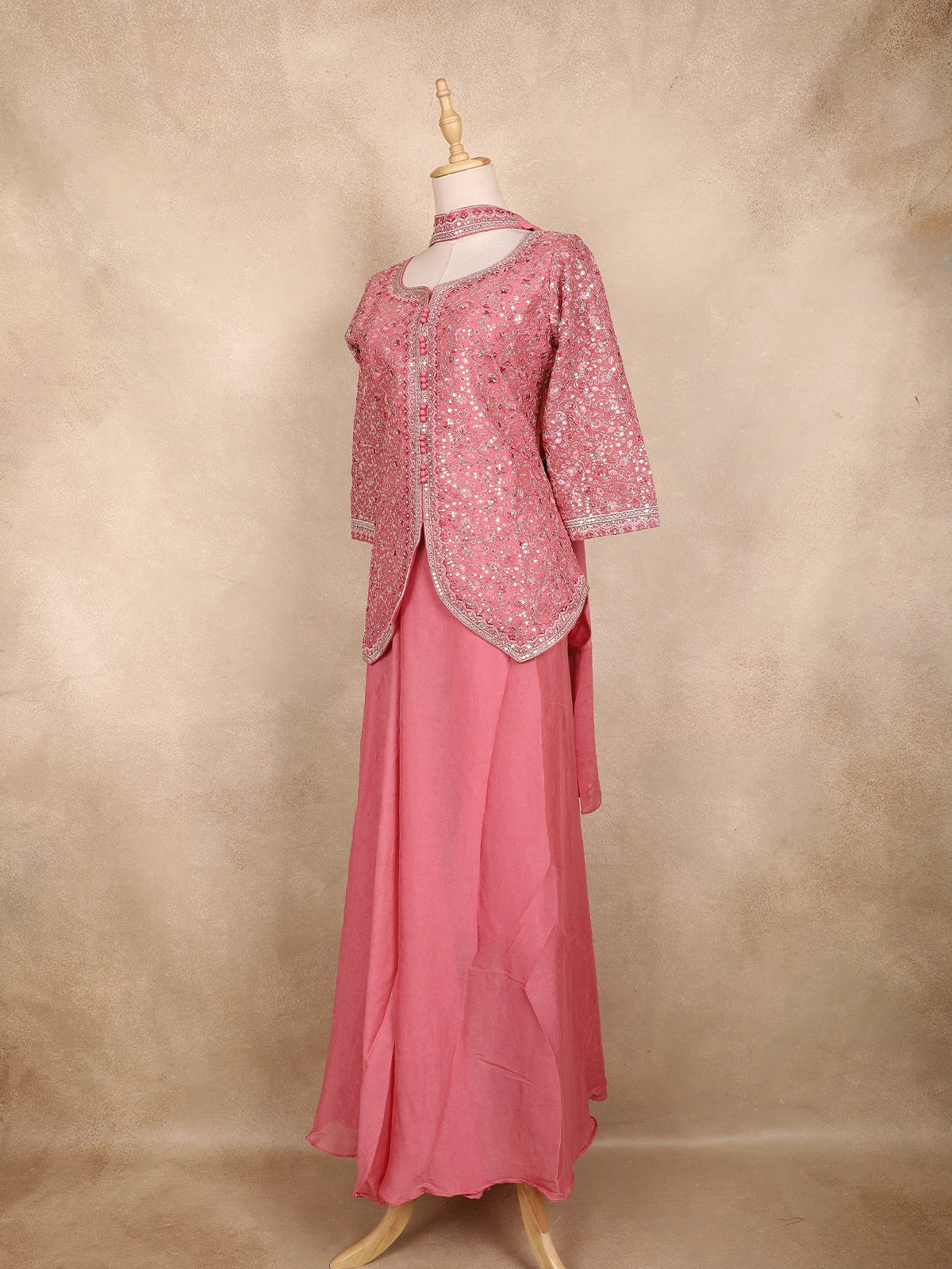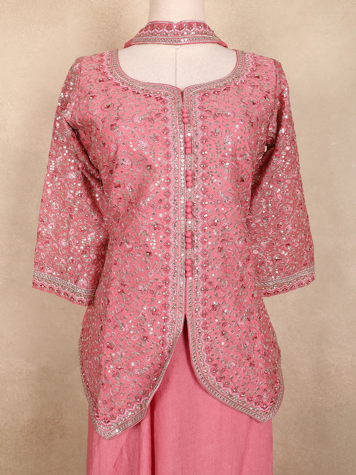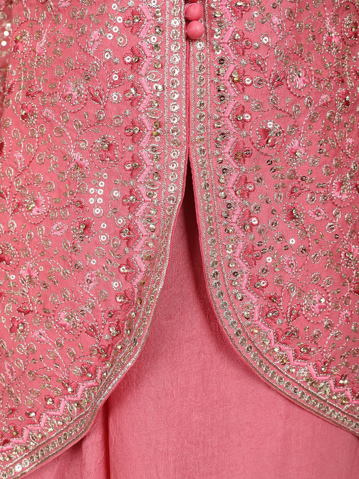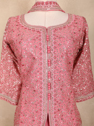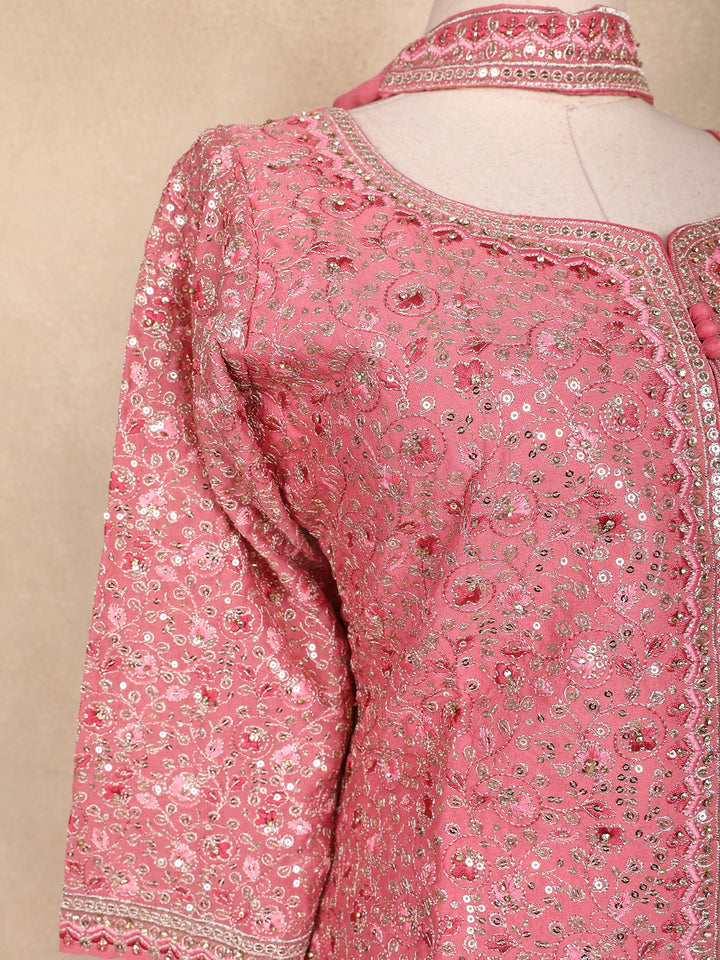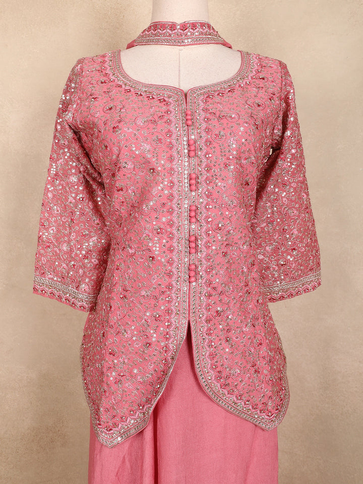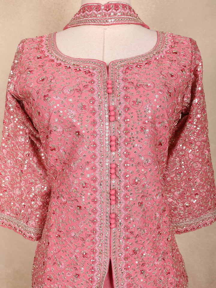 Grace your festive moments with this Pink Georgette Peplum Palazzo Suit, a masterpiece of elegance and intricate craftsmanship. The delicately embroidered peplum top features all-over sequin floral motifs, giving it a shimmering appeal. Designed with a round neckline and front button detailing, it exudes classic charm.