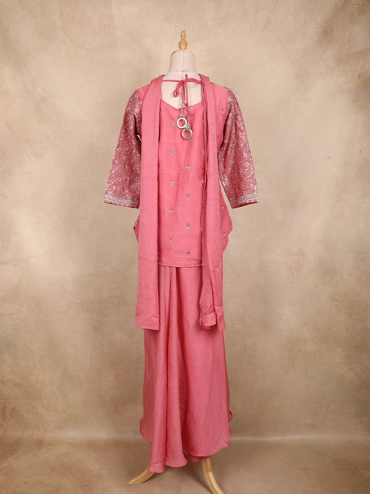 The three-quarter sleeves add modest sophistication, while the flowing georgette palazzo ensures ease and movement. A matching dupatta with an embroidered choker border completes this graceful look. Ideal for festive gatherings, weddings, or evening celebrations, this ensemble blends timeless tradition with modern finesse.